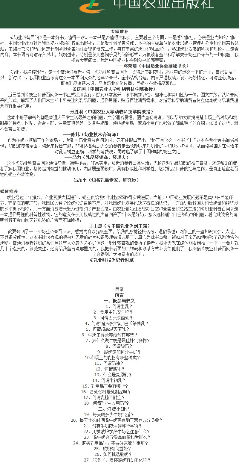 奶业科普百问 农业部奶业管理办公室/全国畜牧总站主编