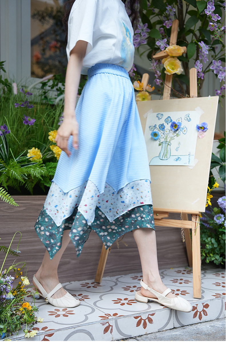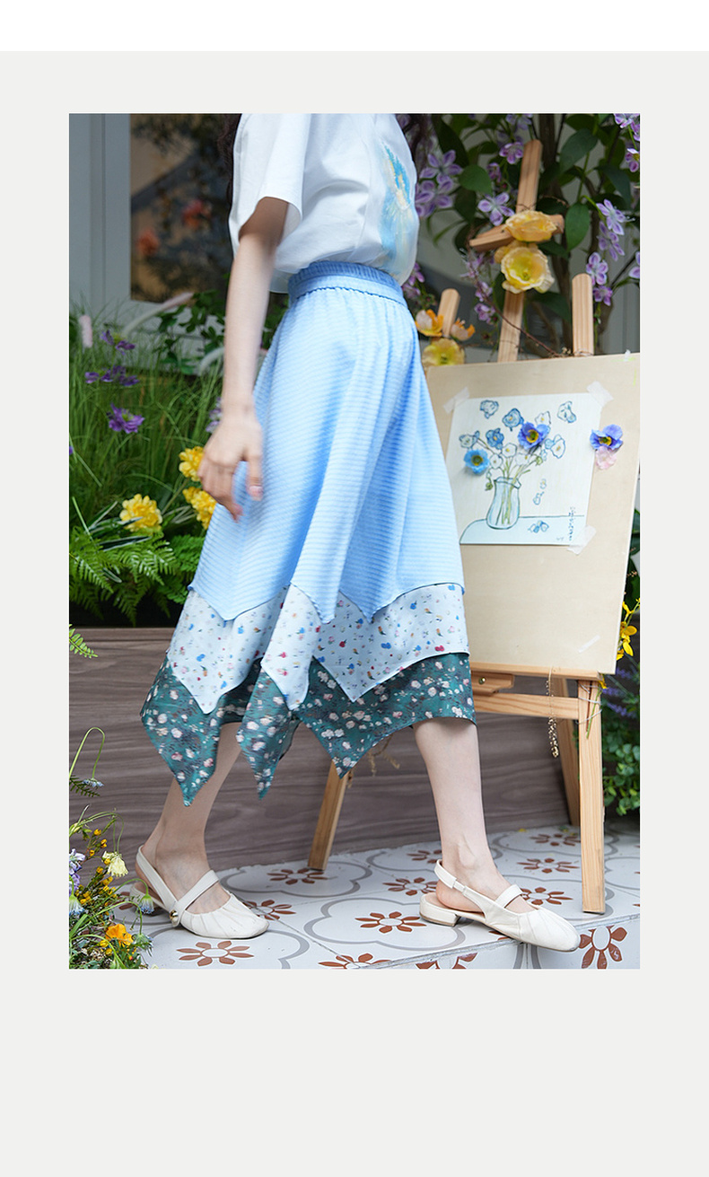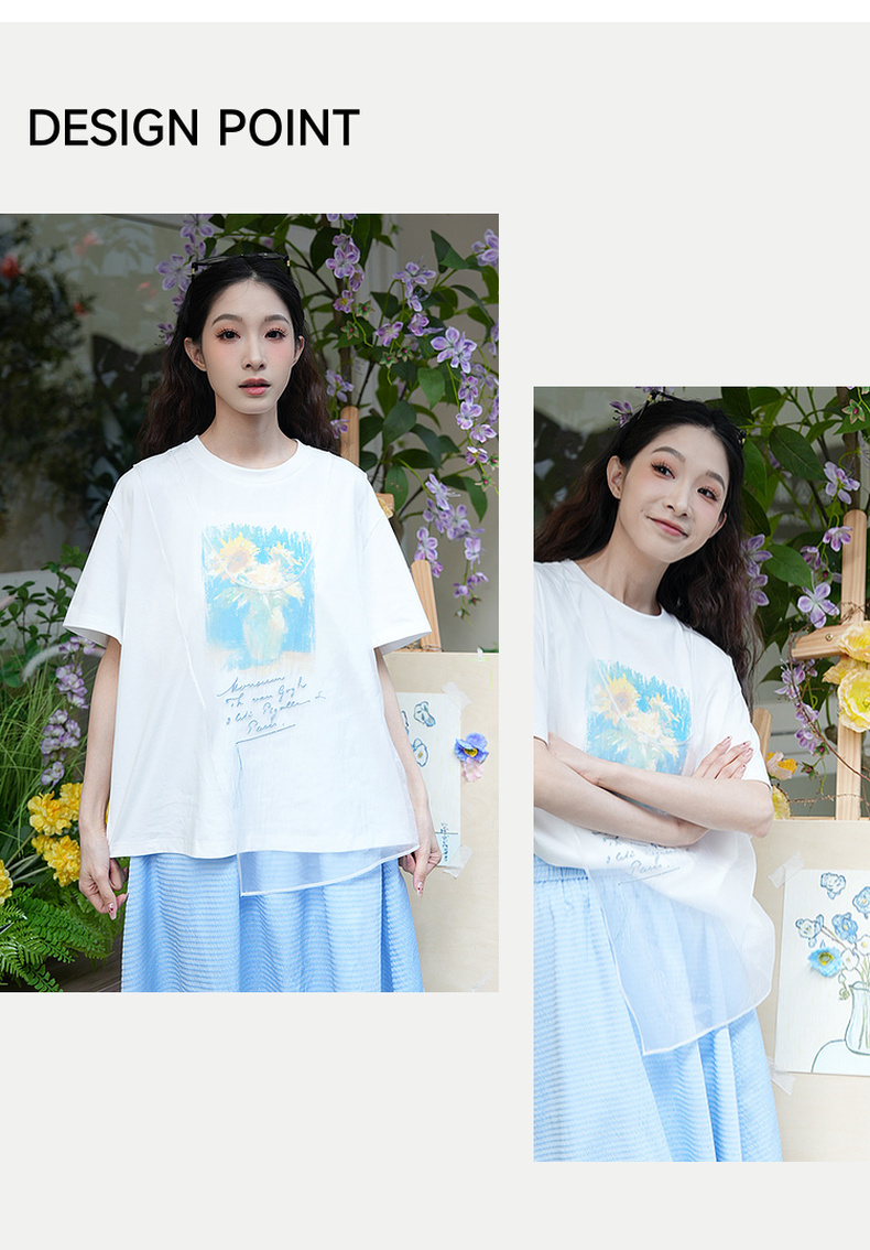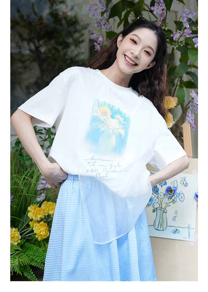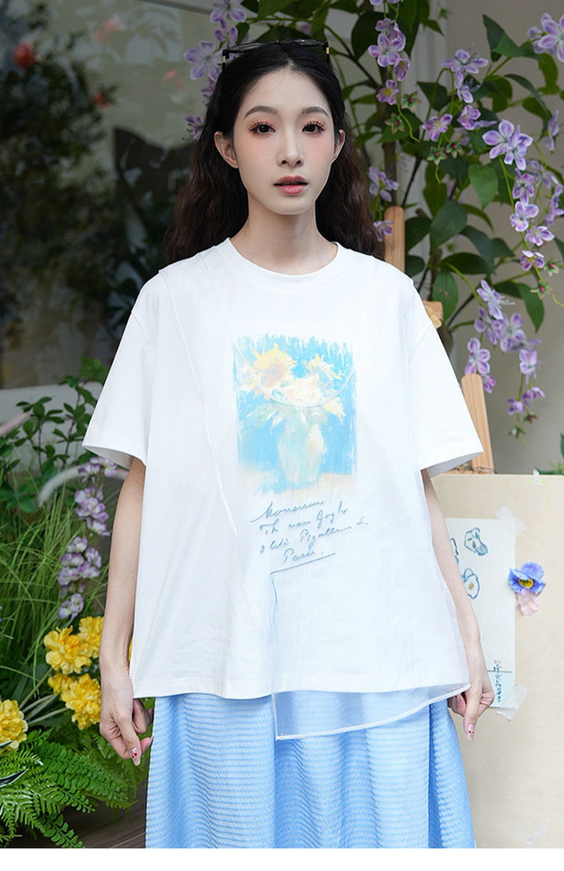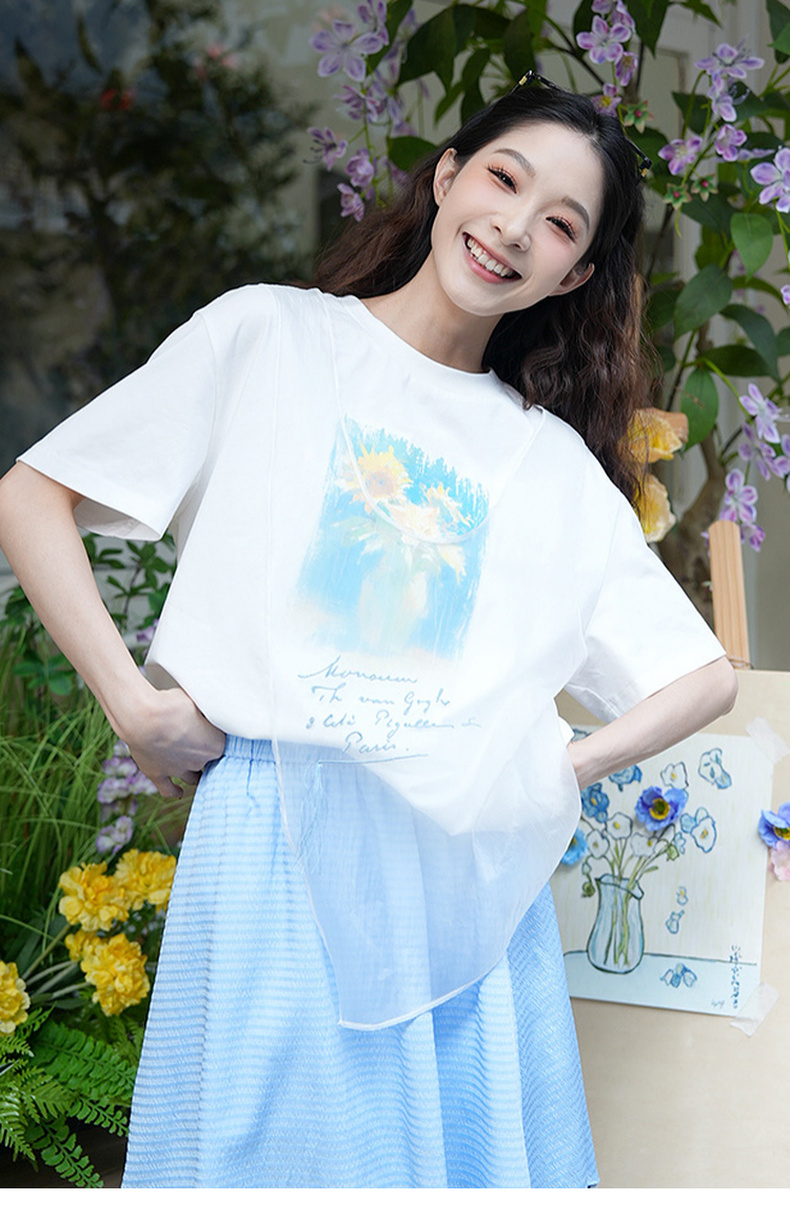 两三事 夏日清葵 2025春季新款小清新拼布假两件印花短袖t恤女