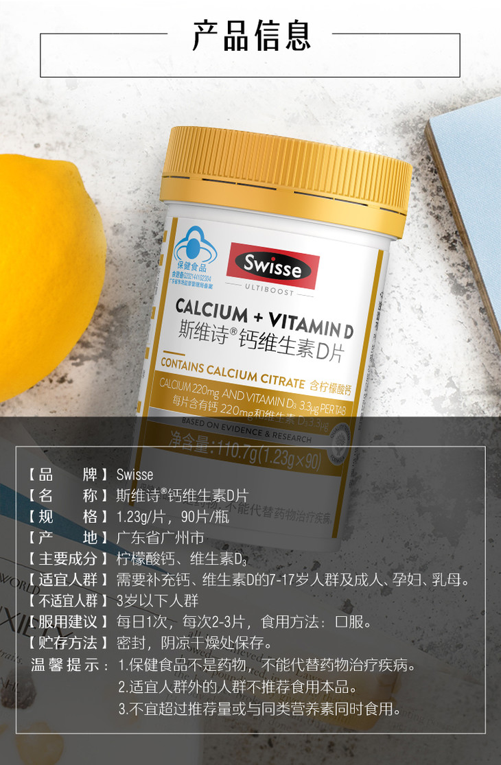 90粒Swisse钙+维生素D片 柠檬酸钙 温和易吸收