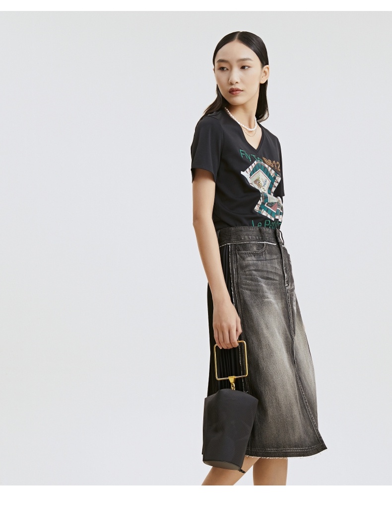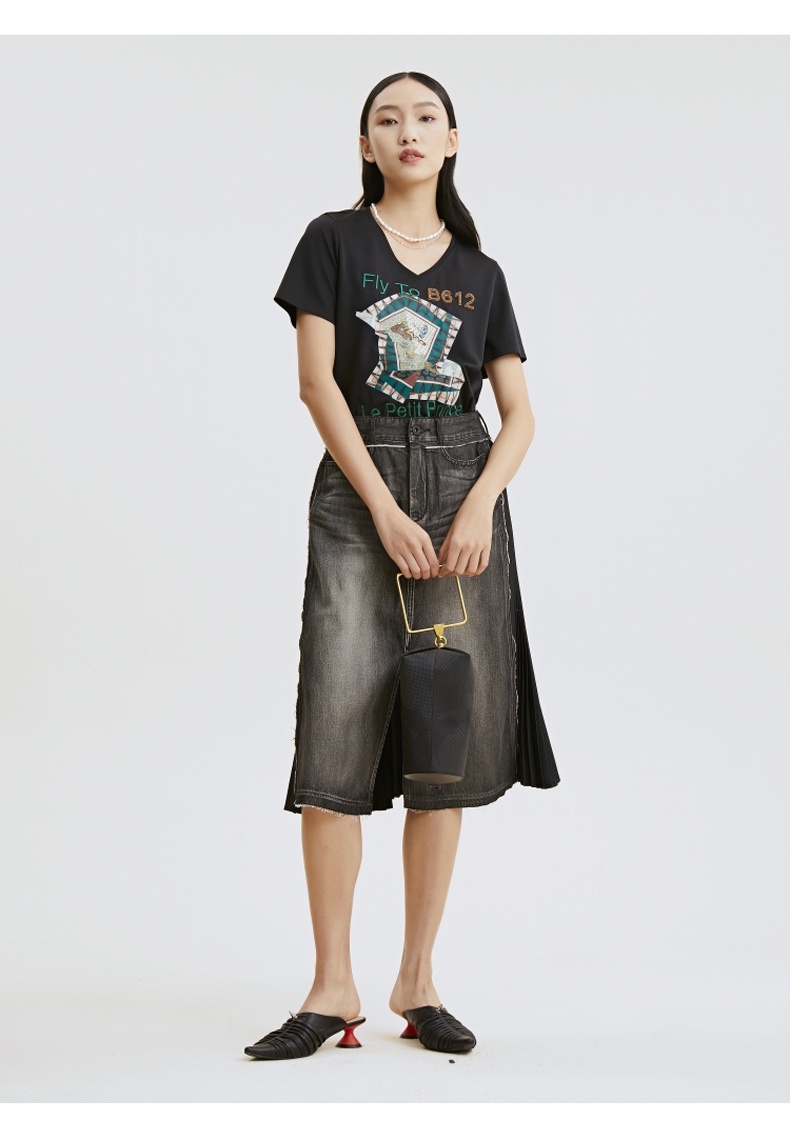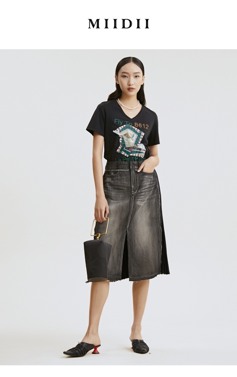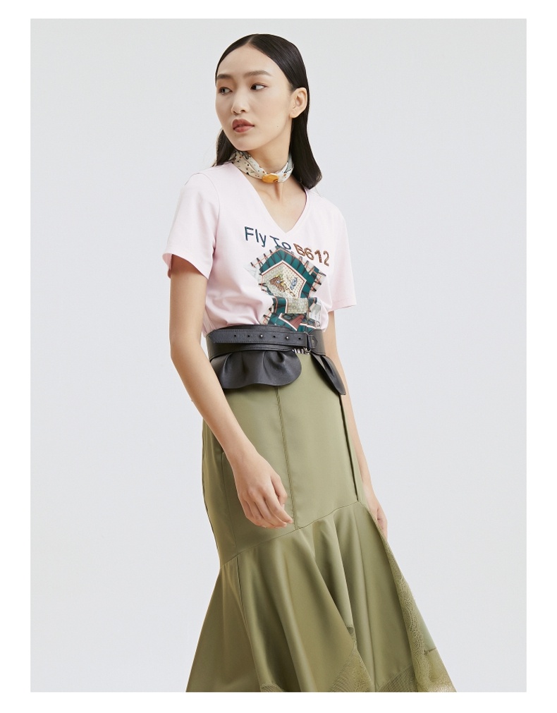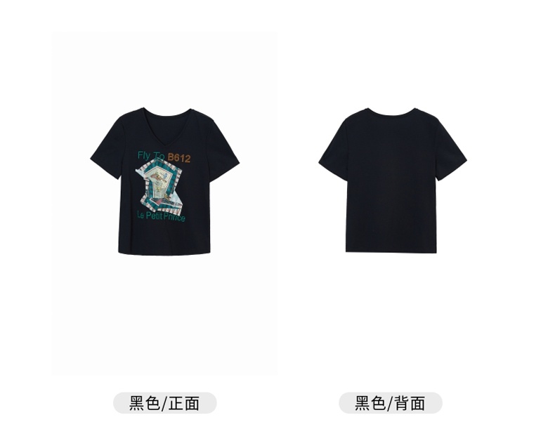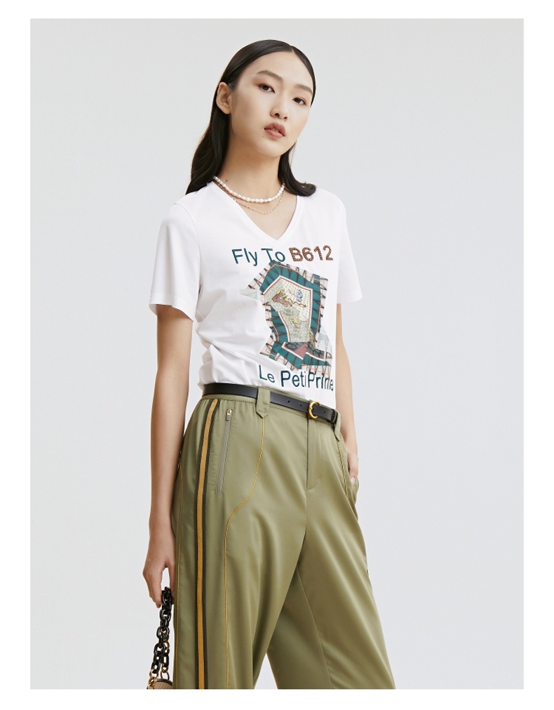 谜底T恤2021夏季字母印花钉珠V领合体棉质短袖上衣女213MT1733