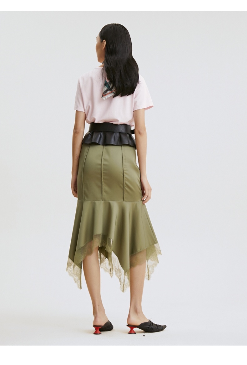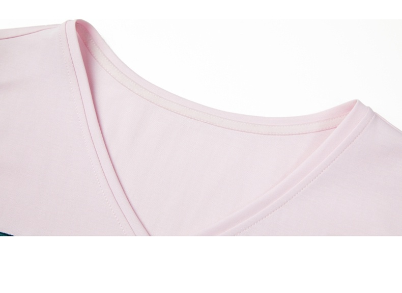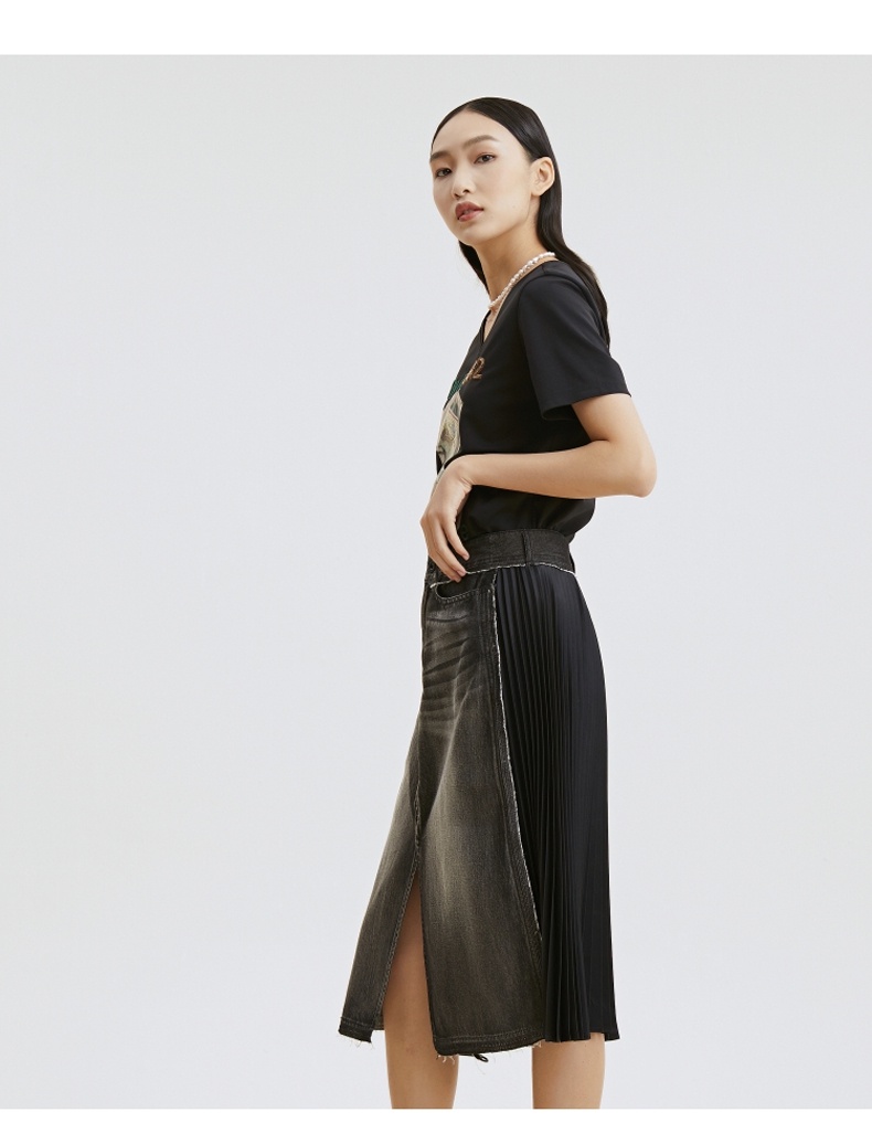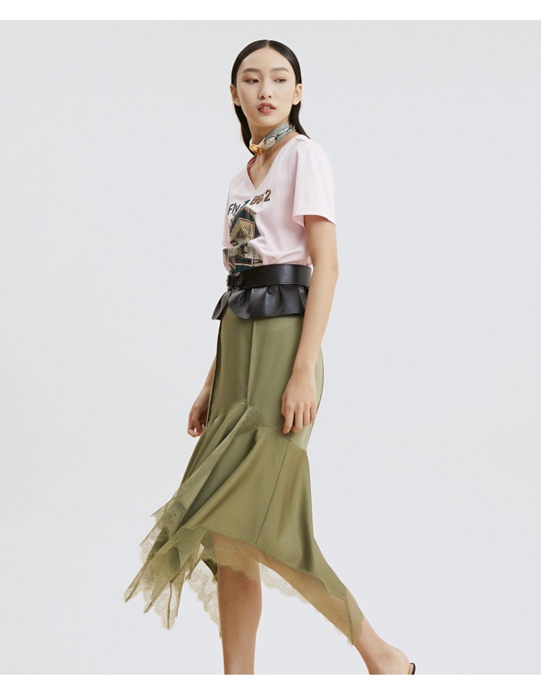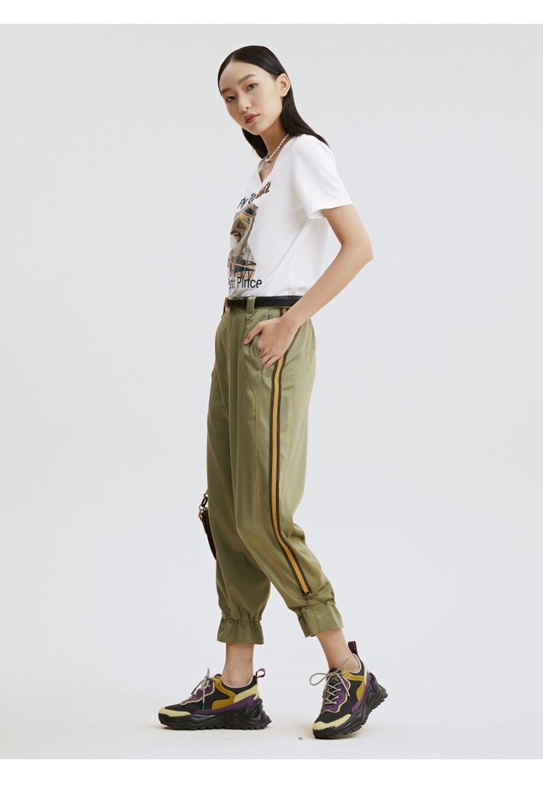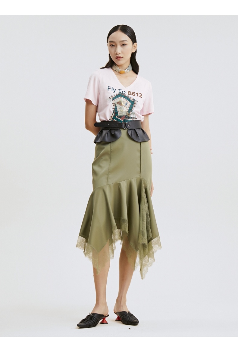 谜底T恤2021夏季字母印花钉珠V领合体棉质短袖上衣女213MT1733