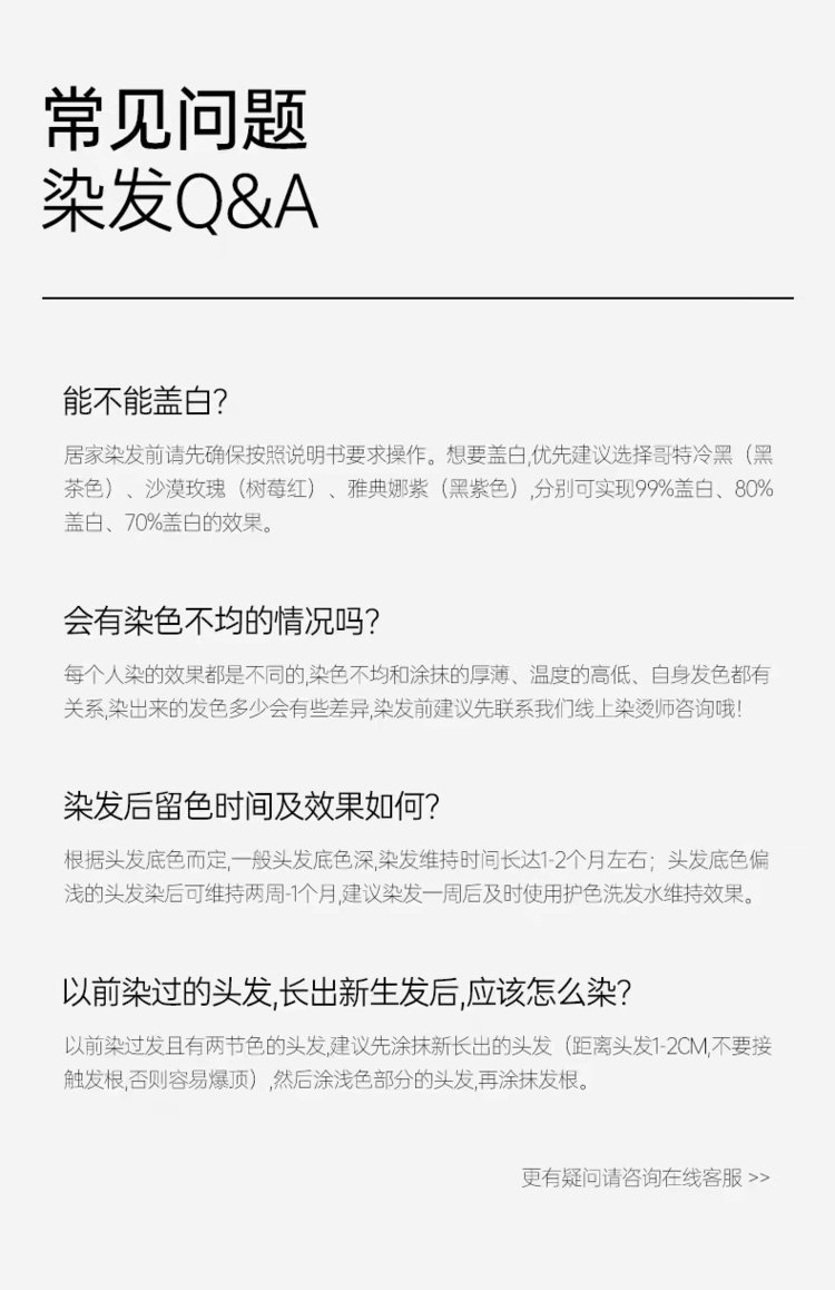 【注意事项】按长度与发量按需购买;发量偏多顾客建议多拍一盒哦,足量效果会更好!染发前建议在局部皮肤测试是否过敏再使用