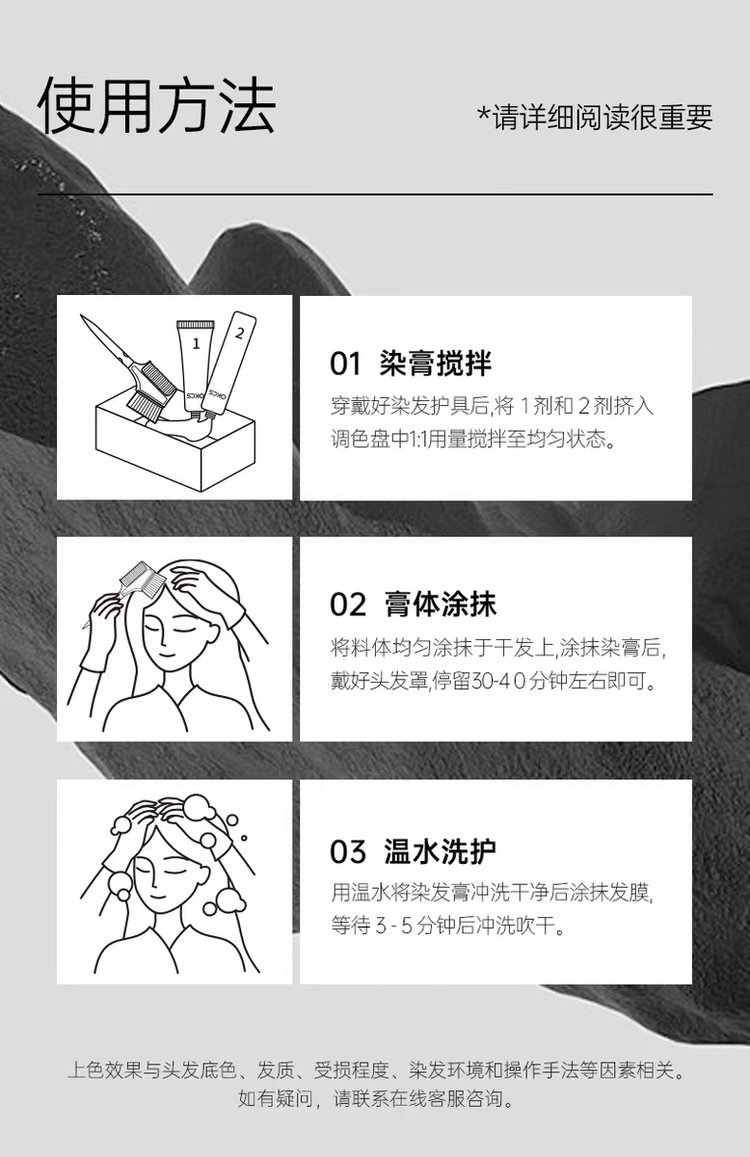 ① 染前请在手肘内侧或耳后涂抹少量染发膏做过敏测试。