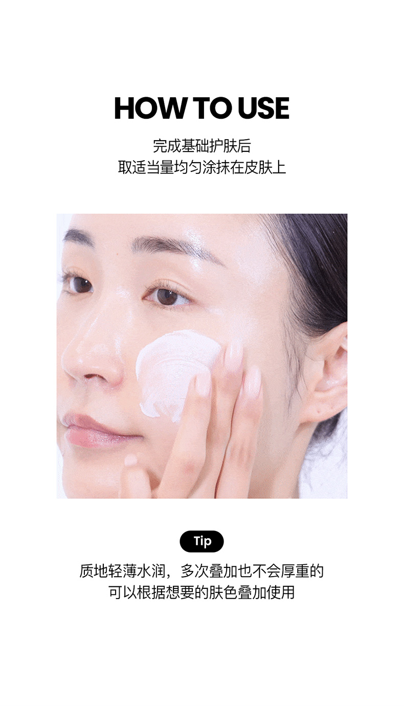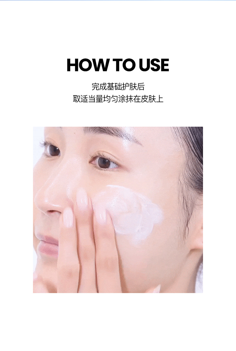 • 完成基础护肤后,取适当量均匀涂抹在皮肤上