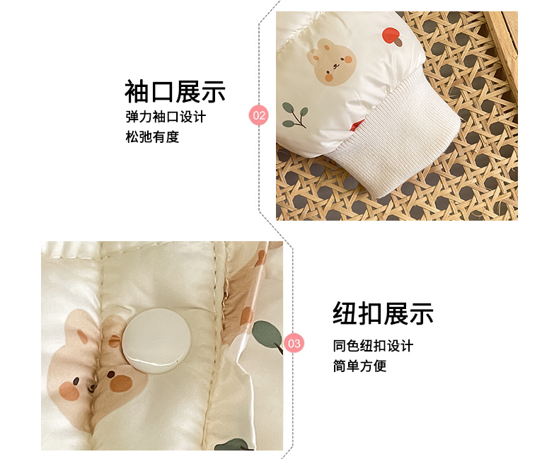 拉链挡片设计,宝宝安全,妈妈安心。拉链顶部设置挡片的设计,防止磨伤宝宝的肌肤,更有安全保障。