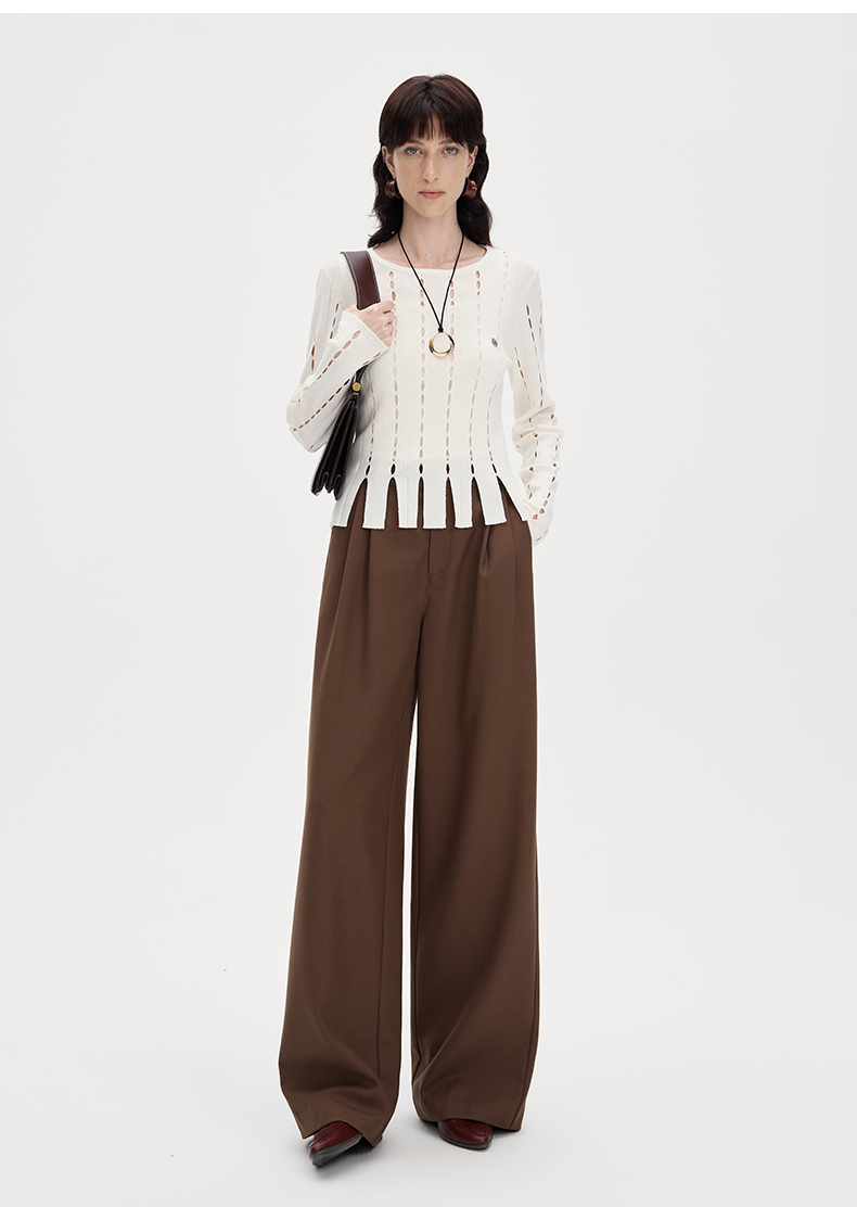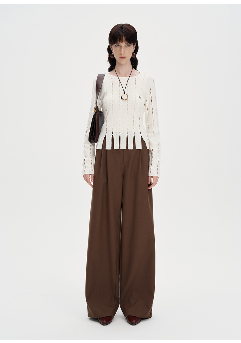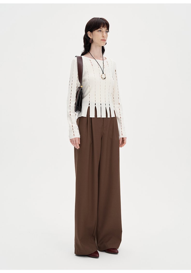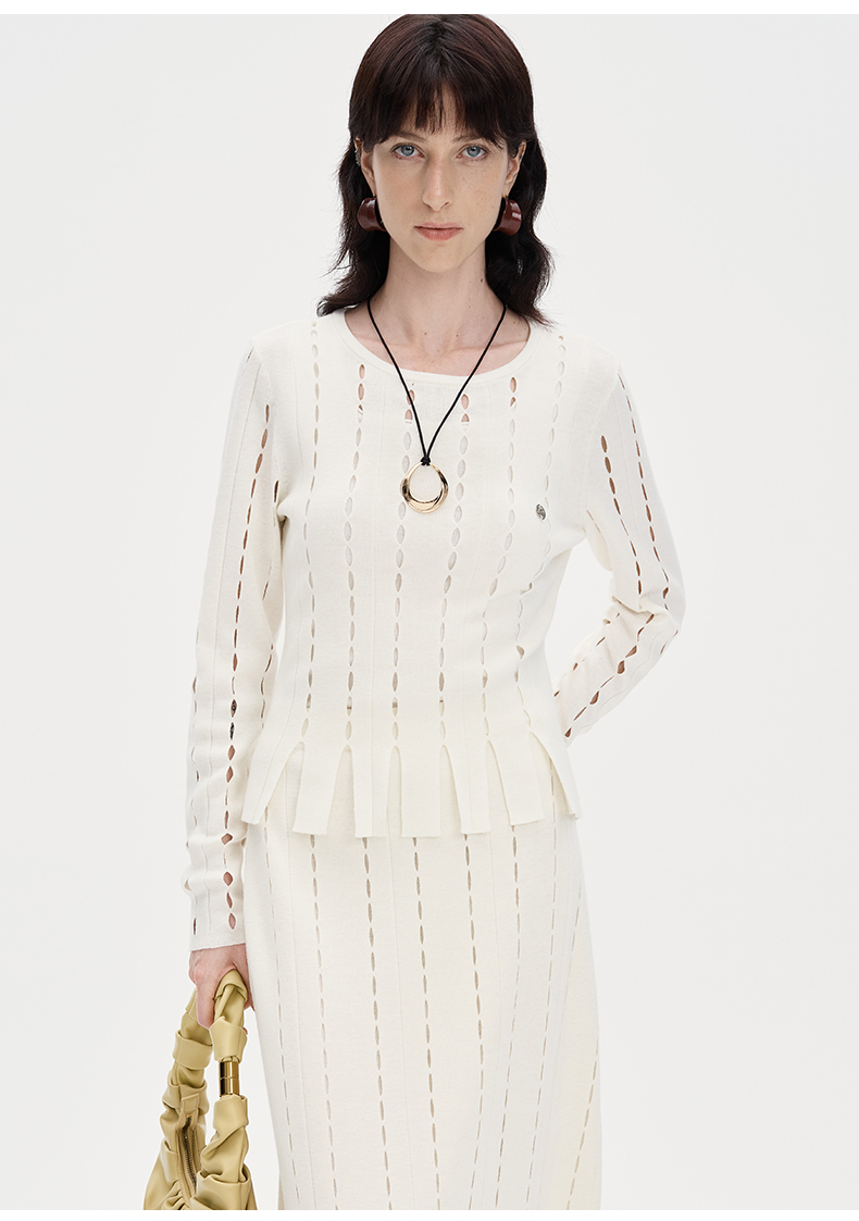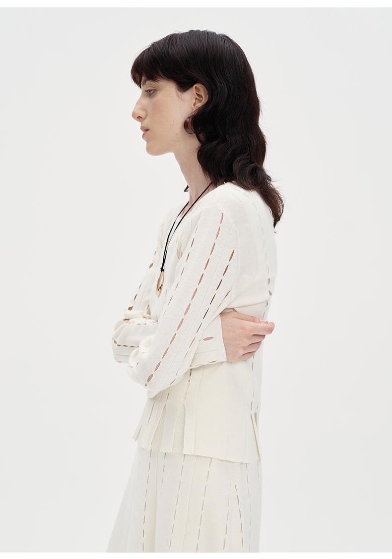 SELFWHO绵羊毛混纺法式长袖针织衫女2024秋新款轻薄镂空打底上衣
