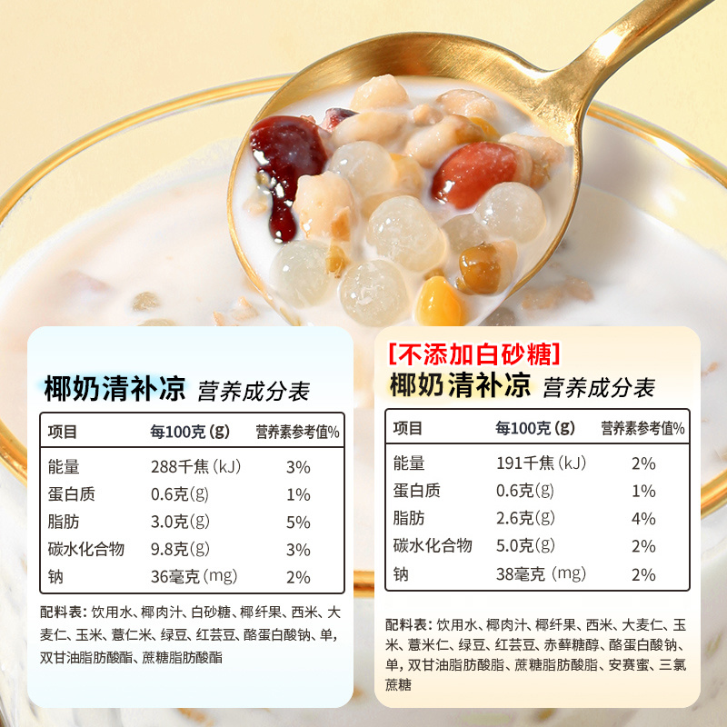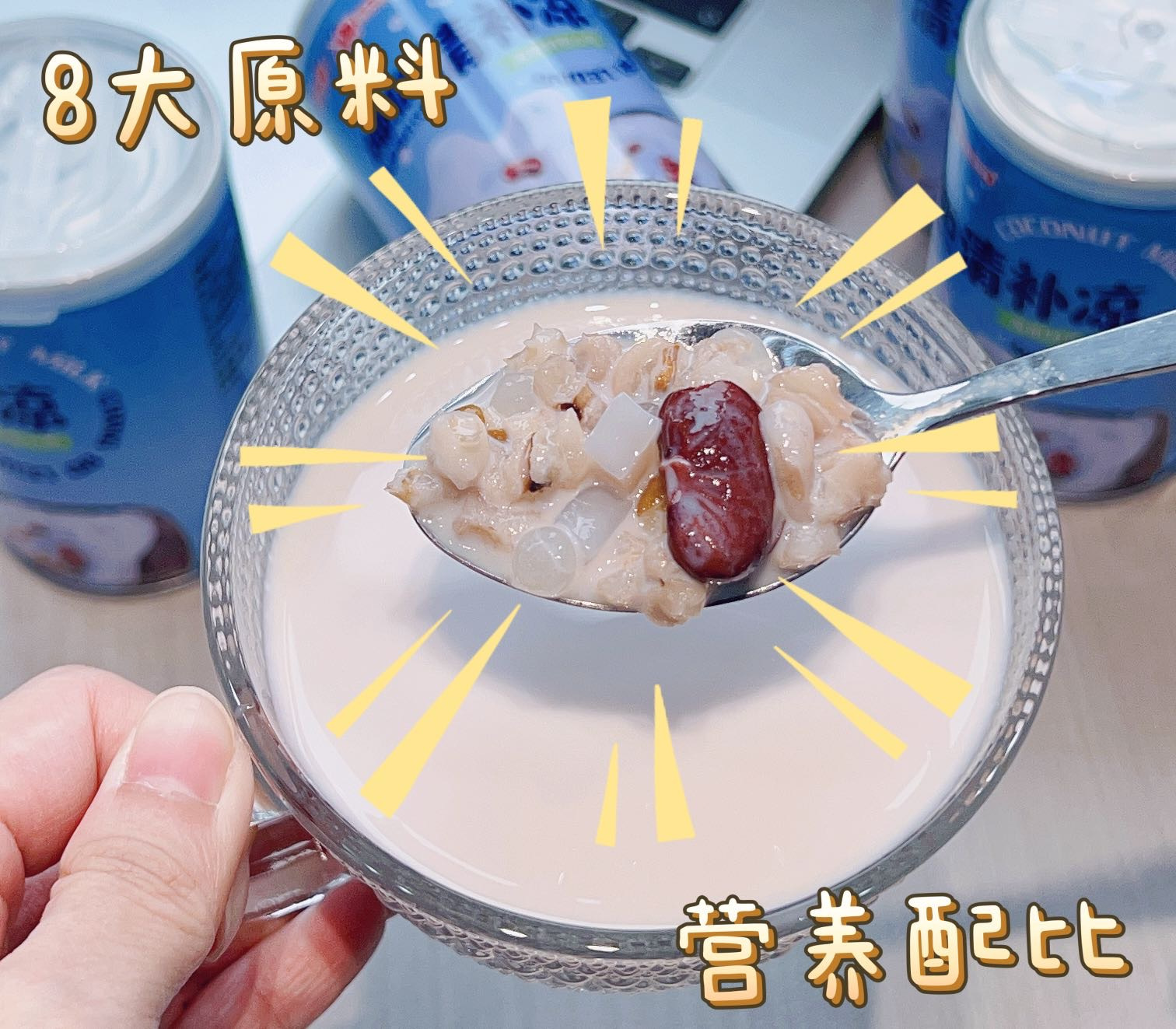 【南国X徐大漂亮清补凉】新鲜椰汁搭配五谷杂粮 ❤️不添加白砂糖版: 配料简单,8种优质谷物杂粮 ❤️椰奶版: 鲜榨椰汁+8种谷物,植物蛋白丰富