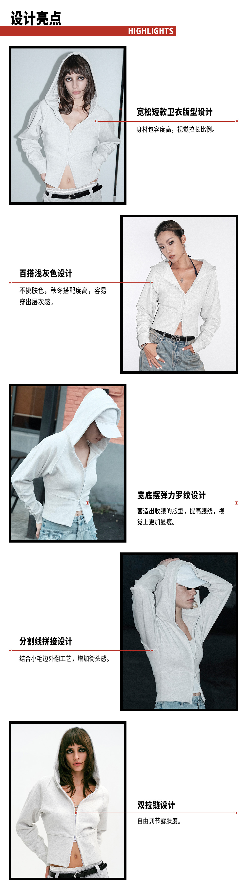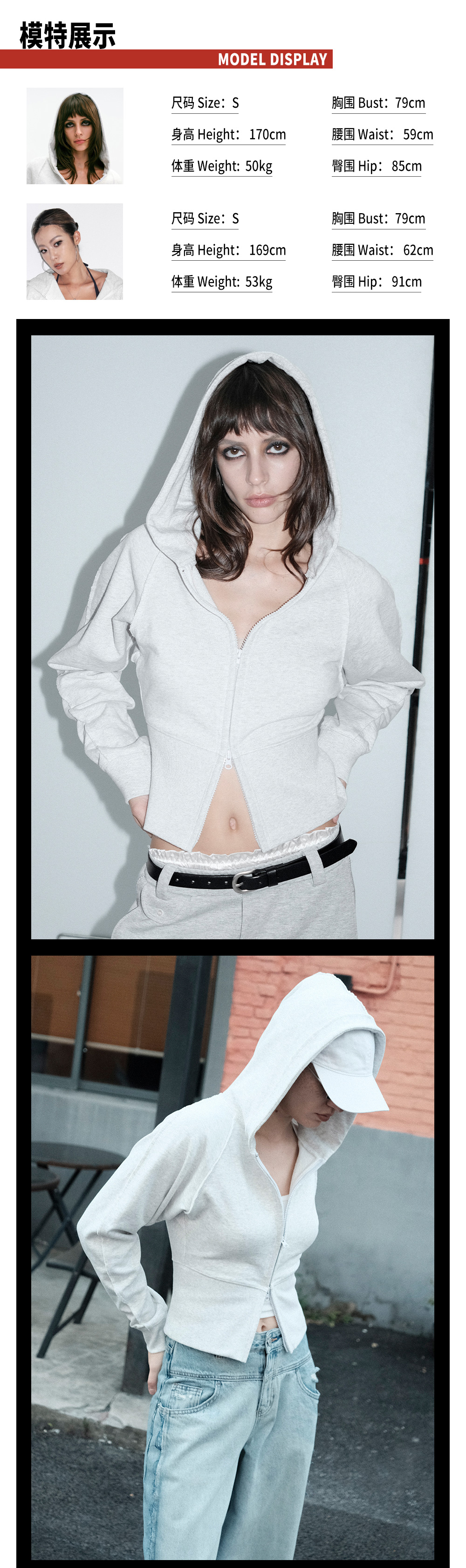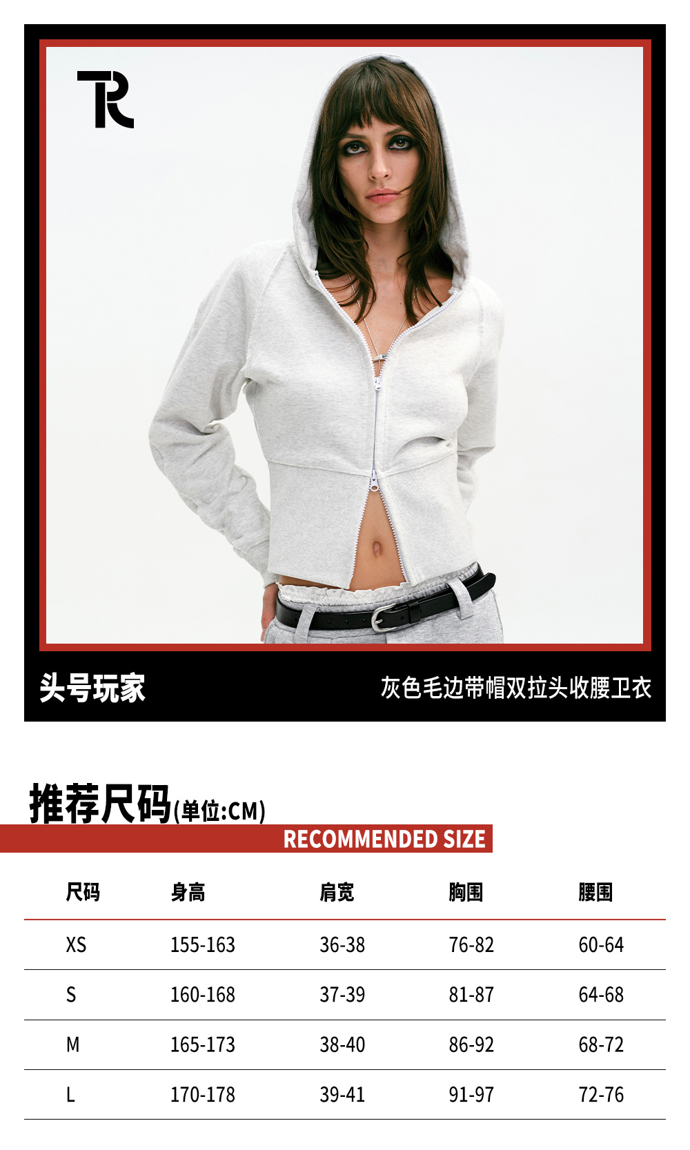 TR她热 头号玩家 浅灰色毛边拉链设计感显瘦收腰短款卫衣外套