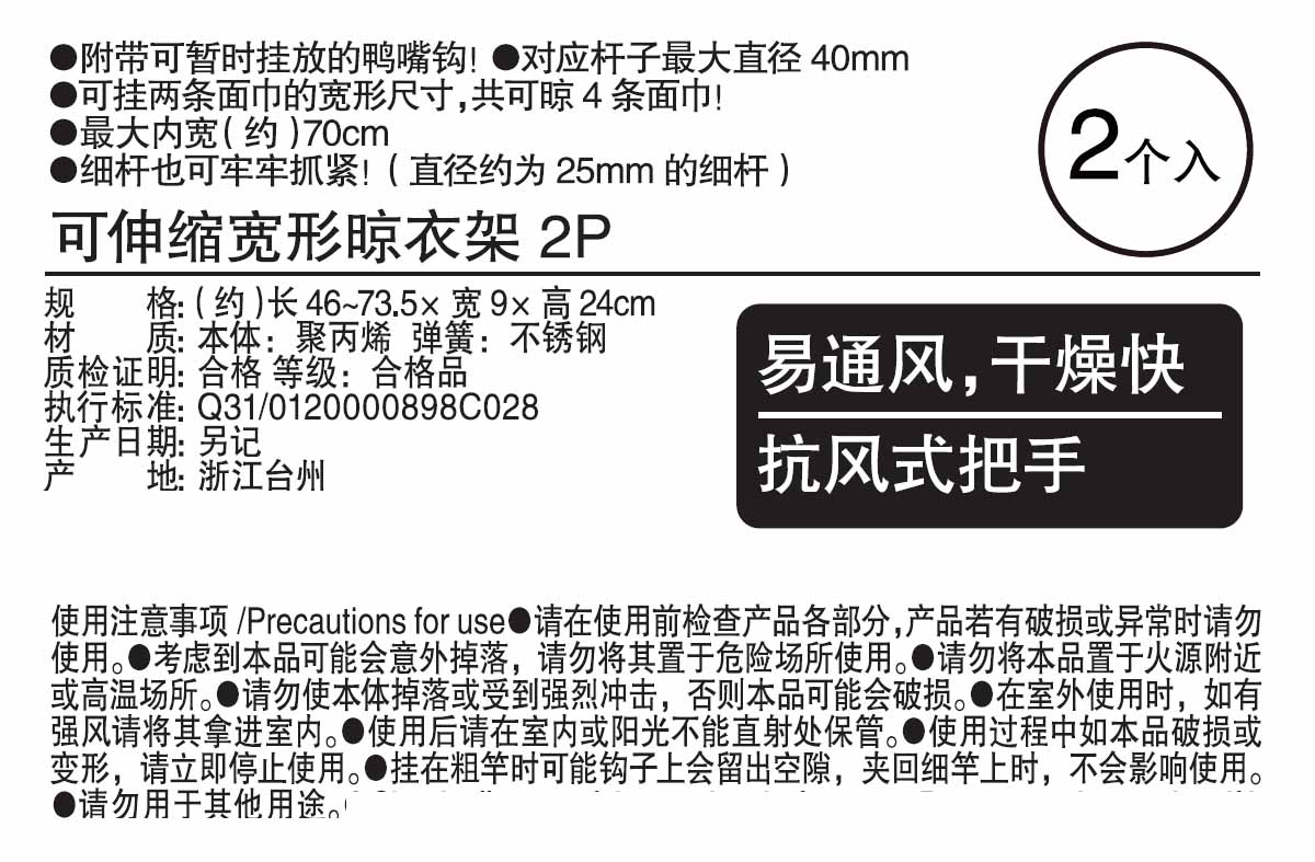 可伸缩宽形晾衣架 2个装
