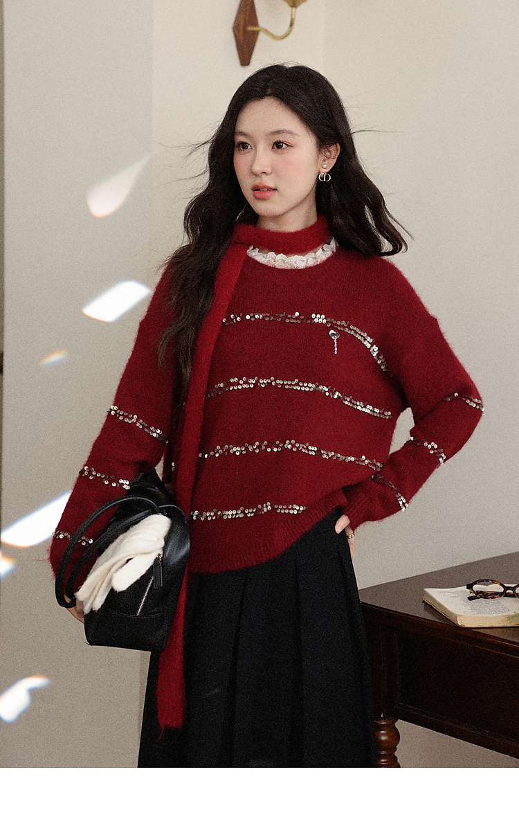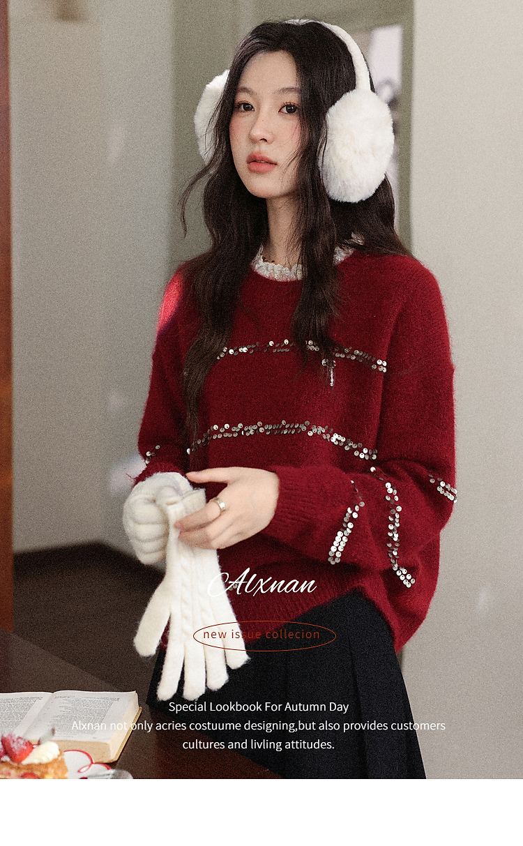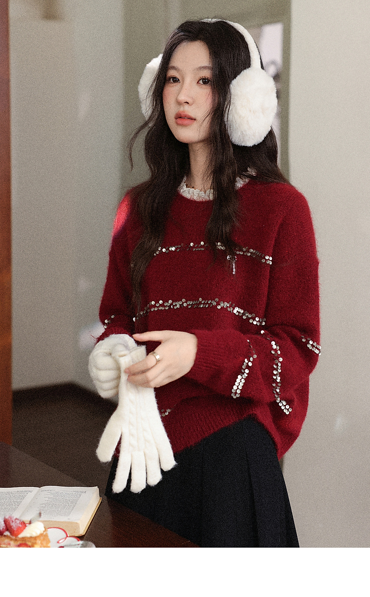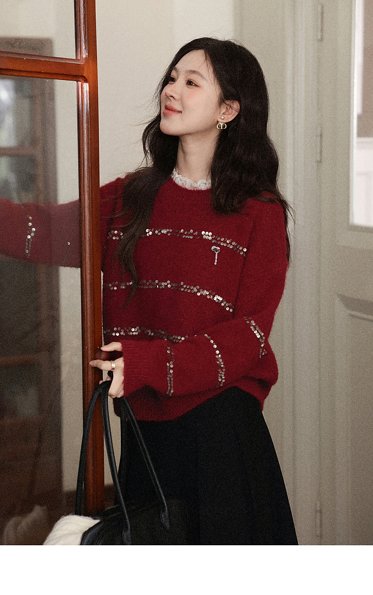 鹿向南「微醺甜茶」红色圆领长袖针织毛衣女冬季小众宽松叠穿上衣