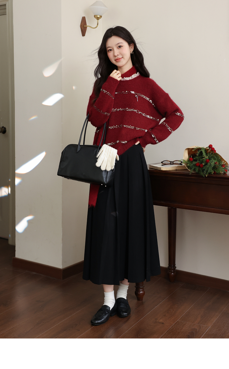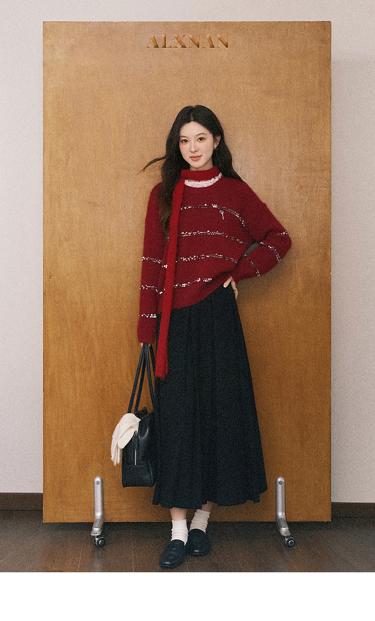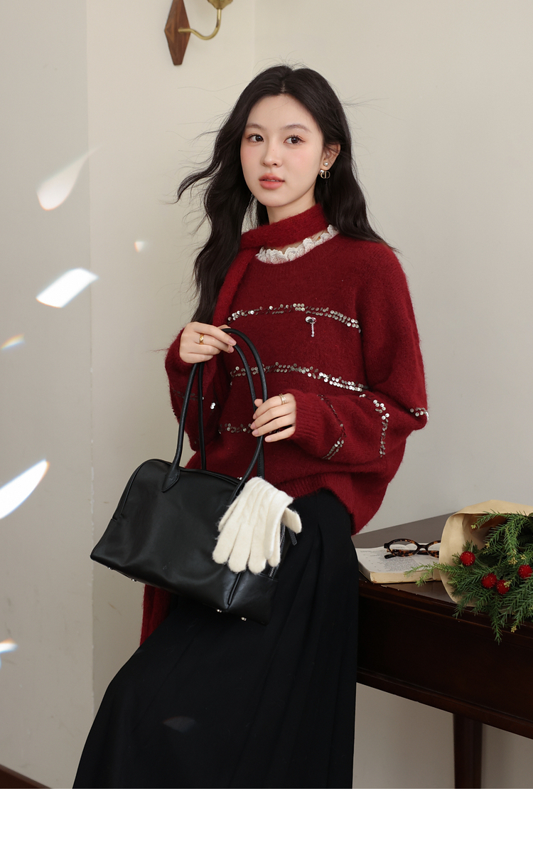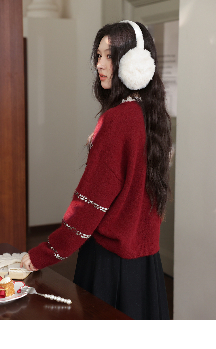 鹿向南「微醺甜茶」红色圆领长袖针织毛衣女冬季小众宽松叠穿上衣