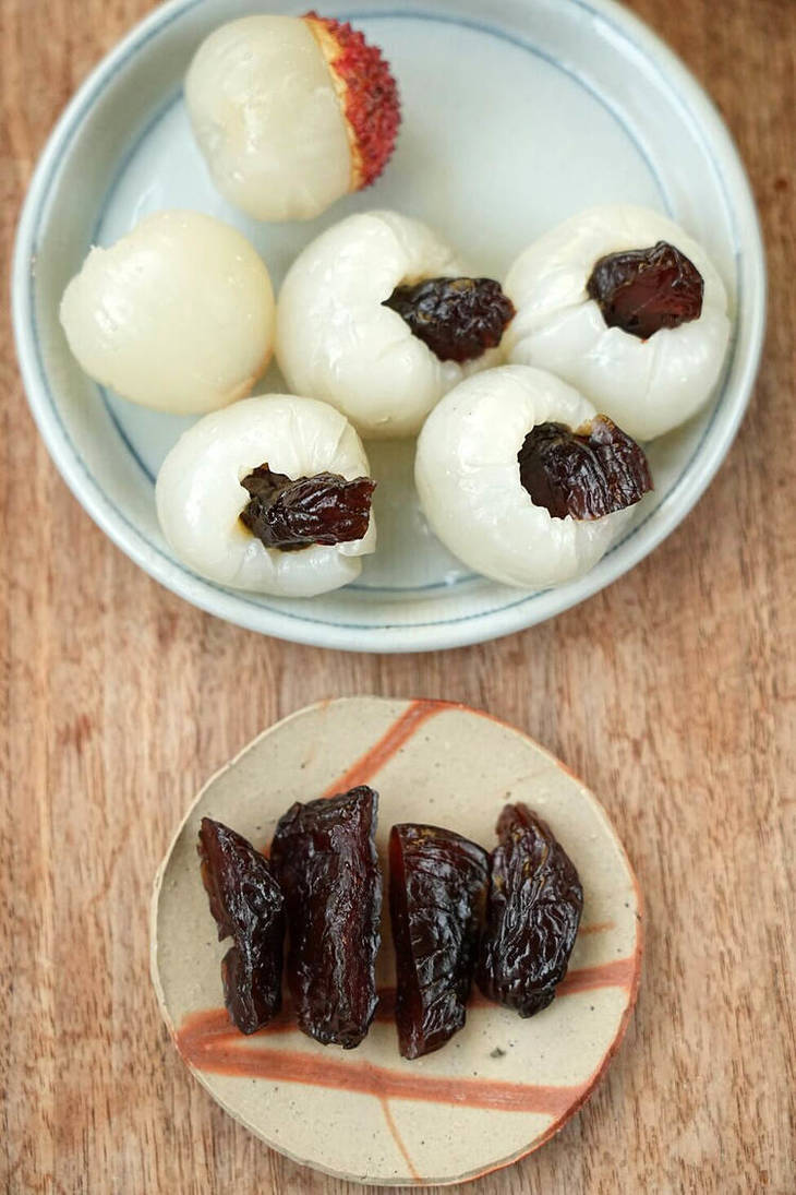 /甜品の革新/ 10. 梅子奶酪杯:奶油奶酪+乌梅条装饰 11. 梅香冰淇淋:香草冰淇淋撒乌梅碎 12. 梅子巧克力:融化巧克力包裹乌梅条