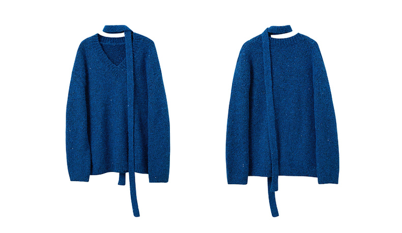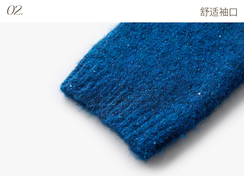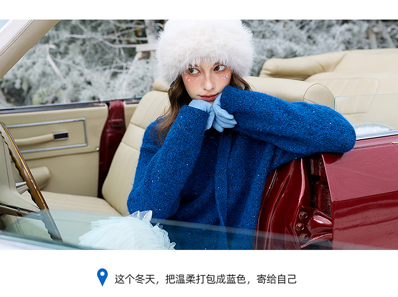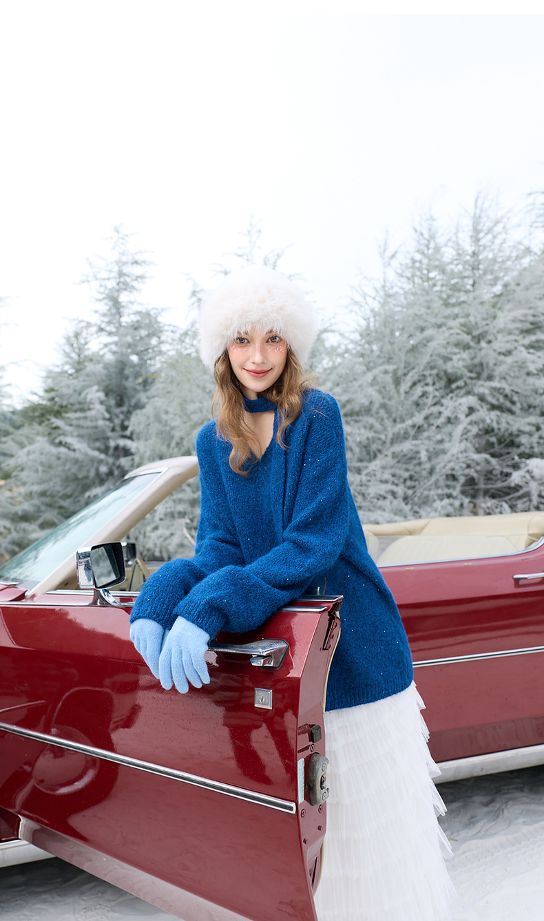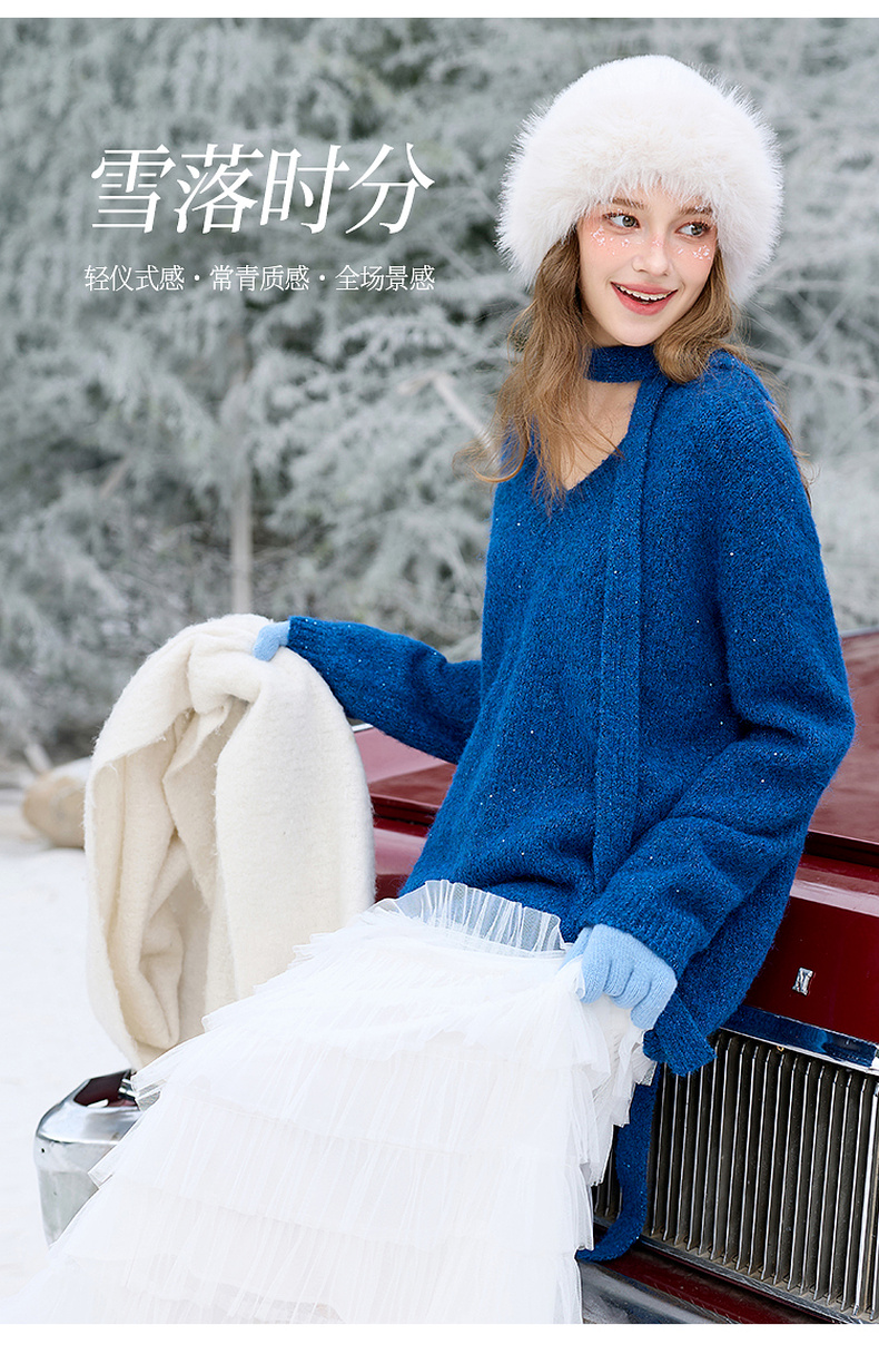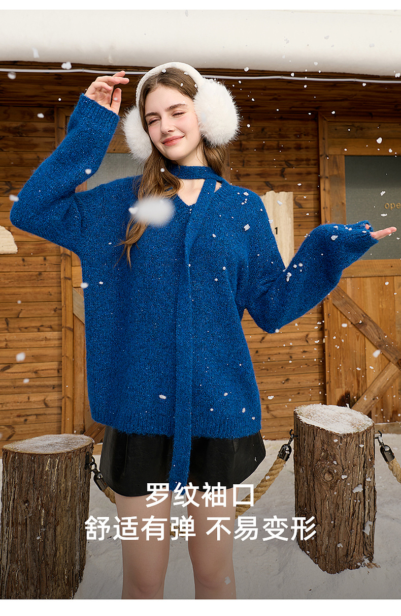 三彩2025冬季新款亮片针织衫V领飘带毛衫套头氛围感上衣M