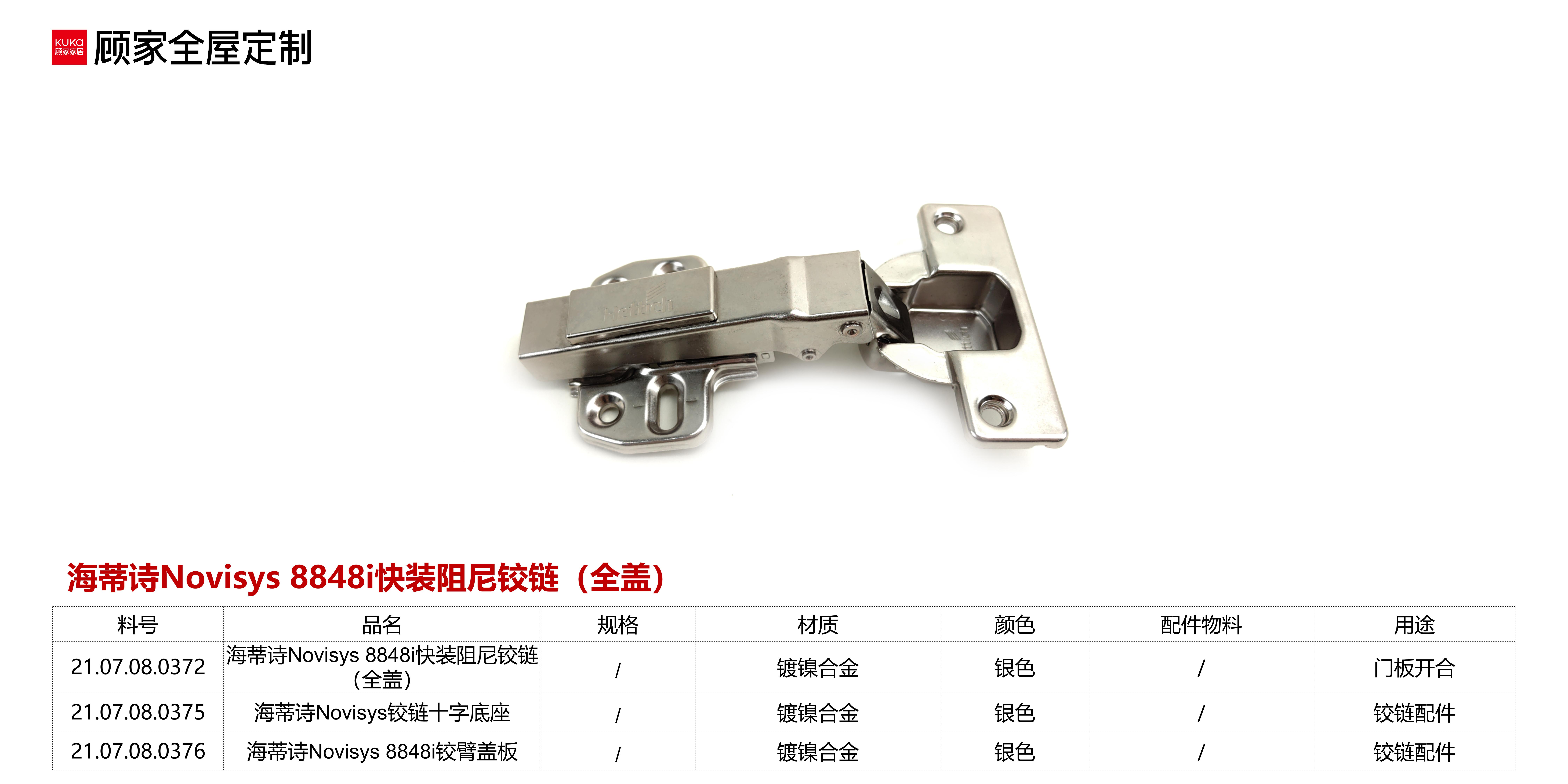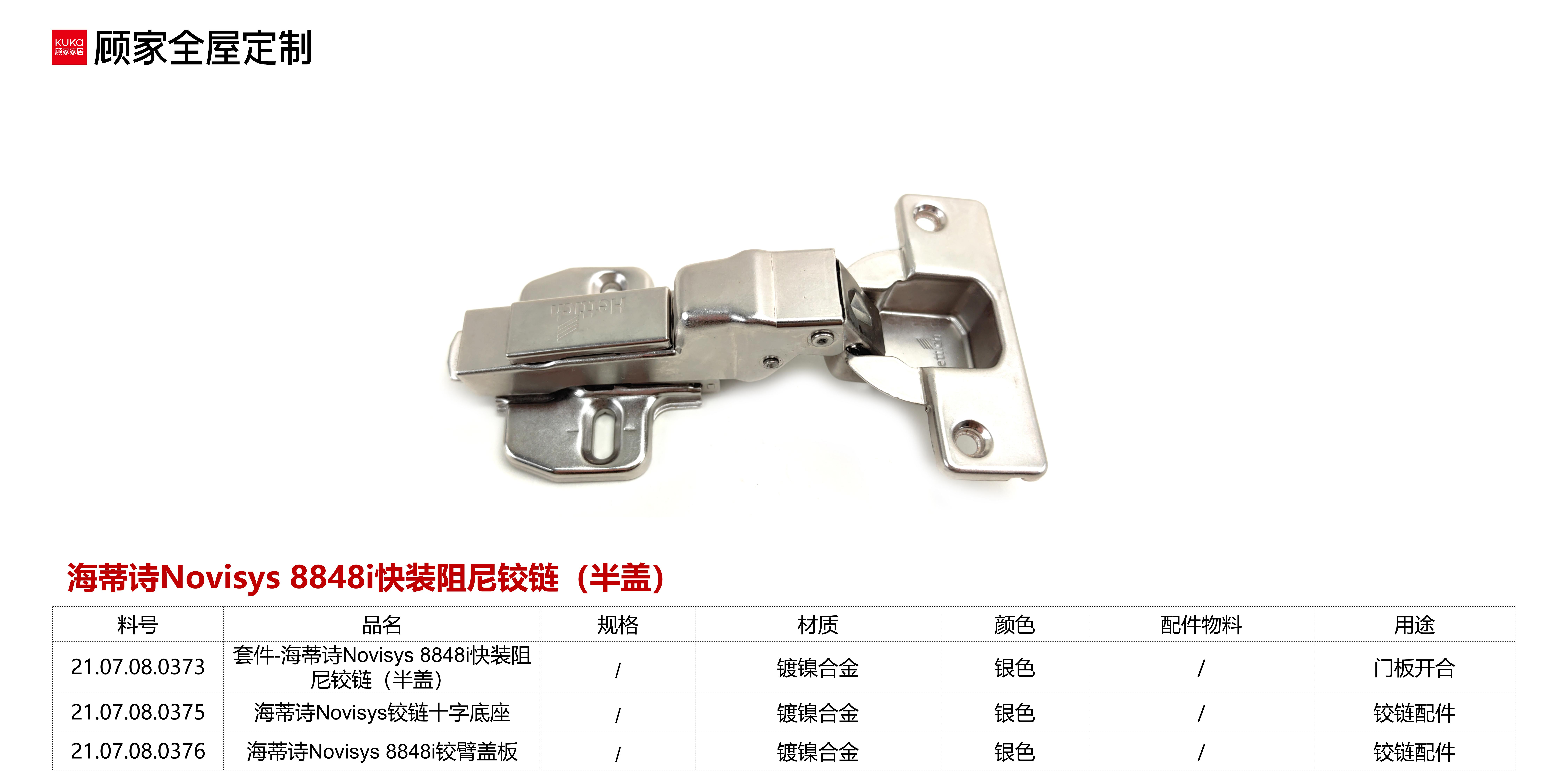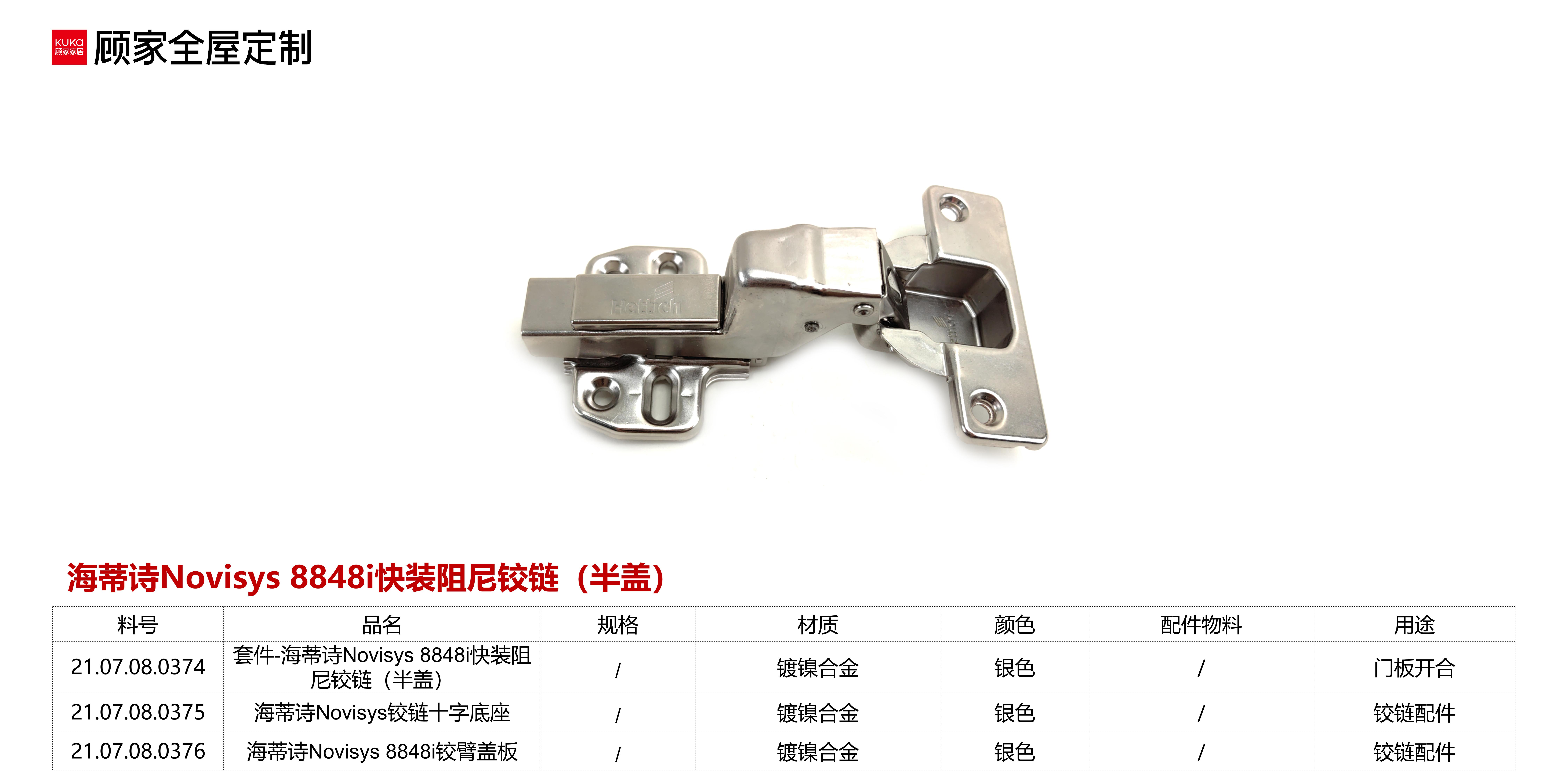 1-衣柜基础五金-1铰链类-13-套件-海蒂诗Novisys-8848i快装阻尼铰链