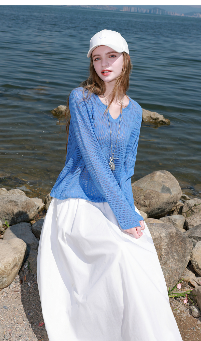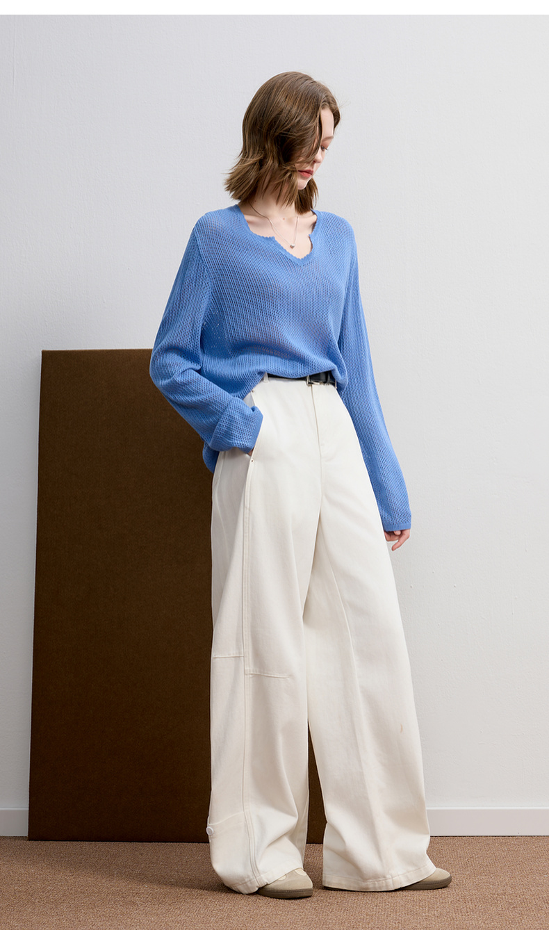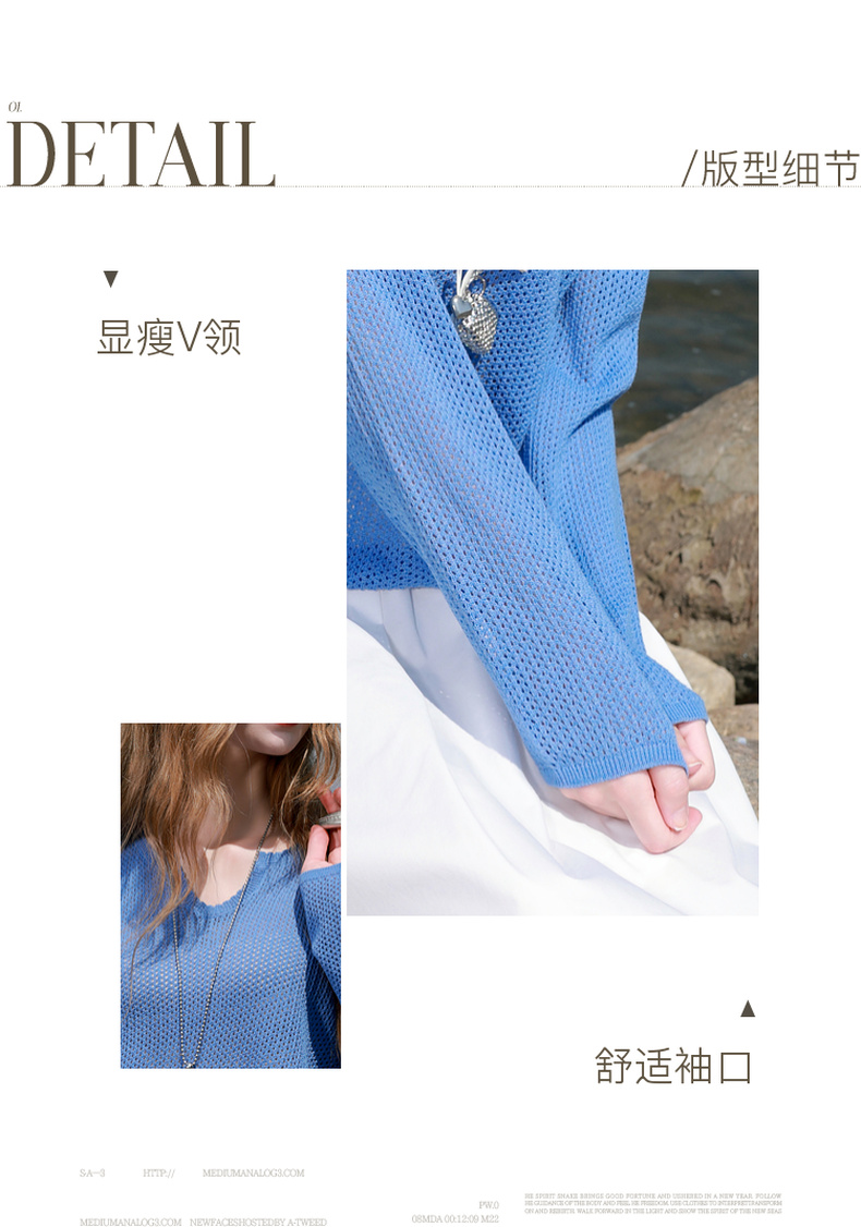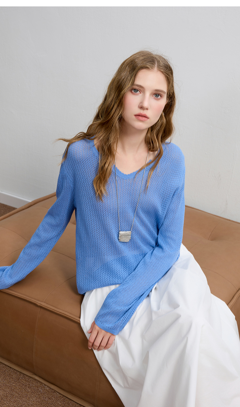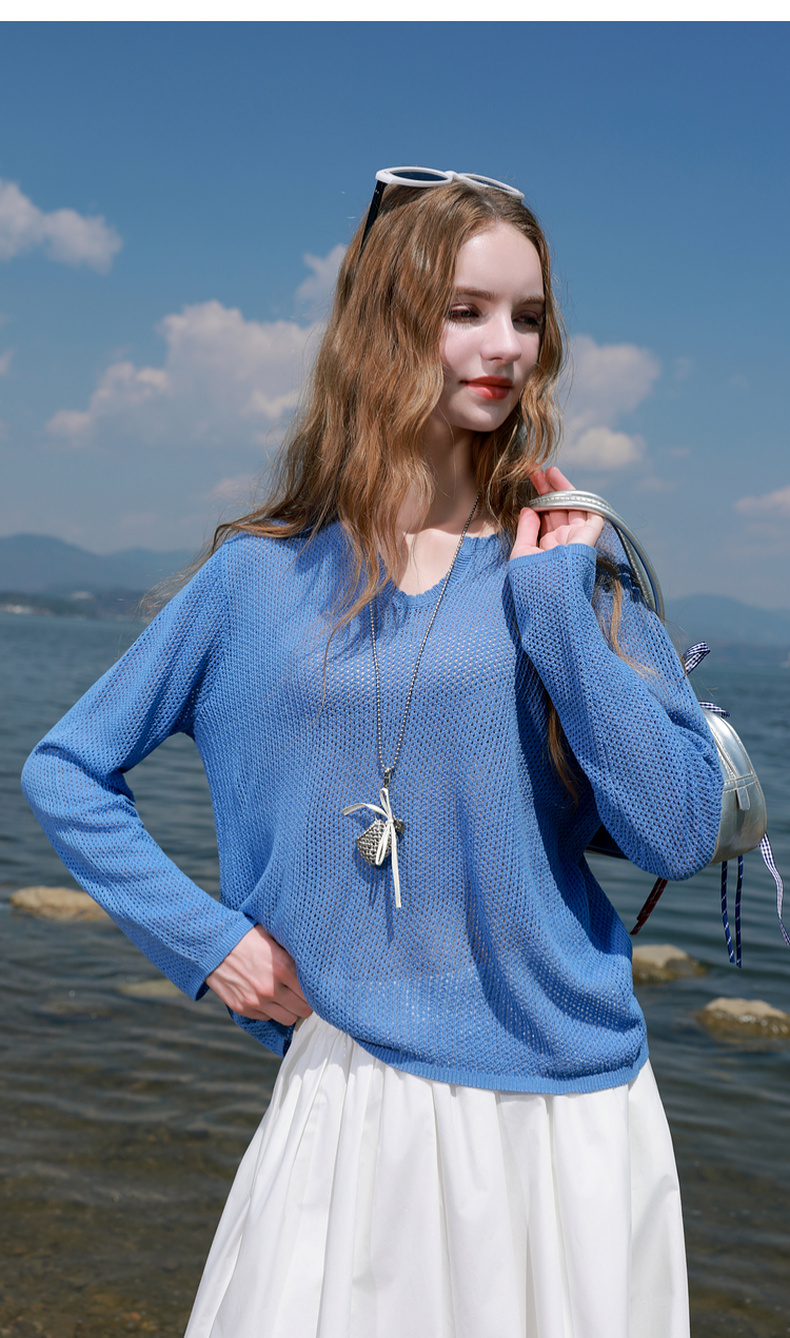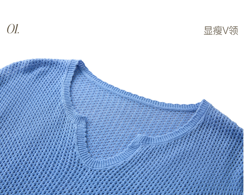 三彩2025秋季新款镂空针织衫V领宽松落肩袖毛衫休闲M