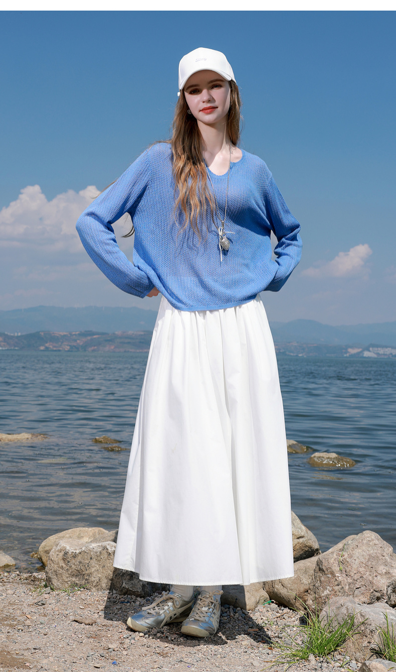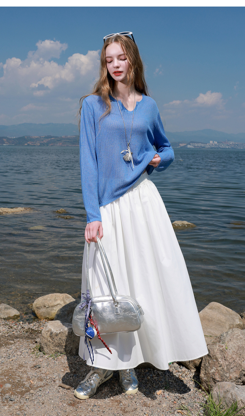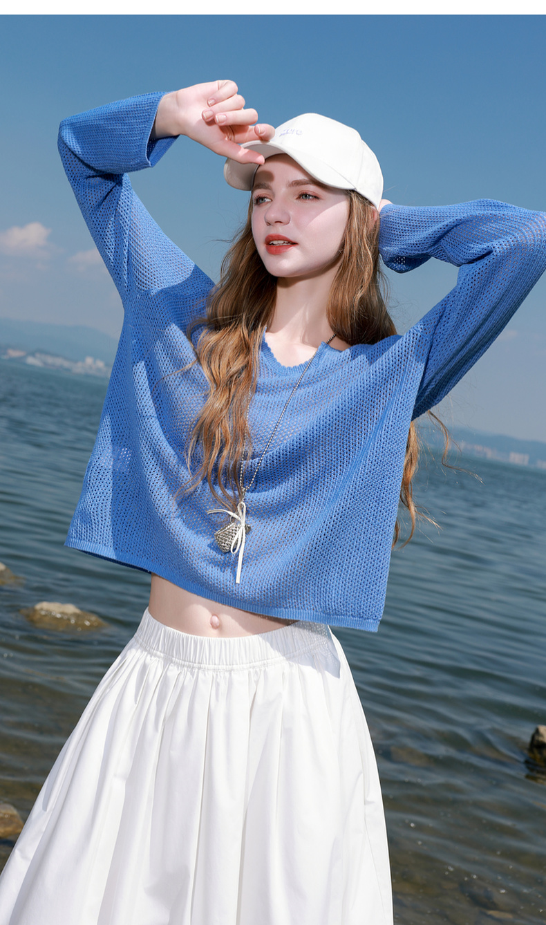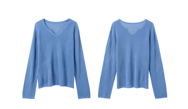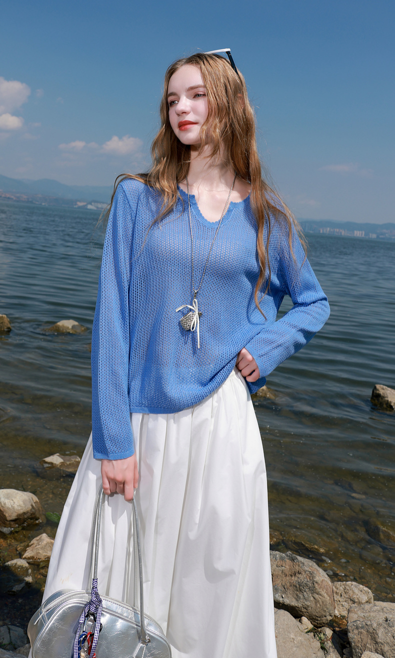 三彩2025秋季新款镂空针织衫V领宽松落肩袖毛衫休闲M