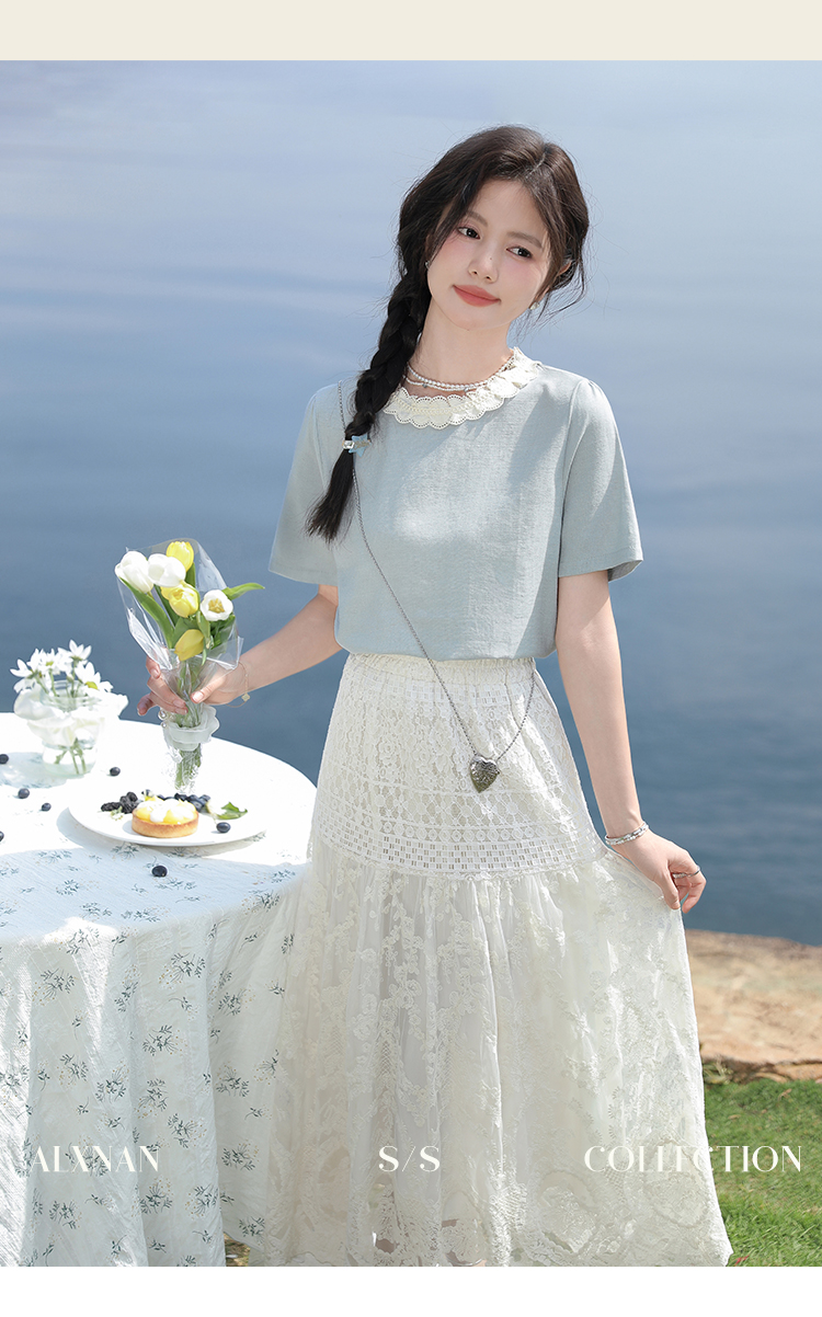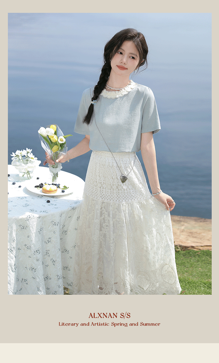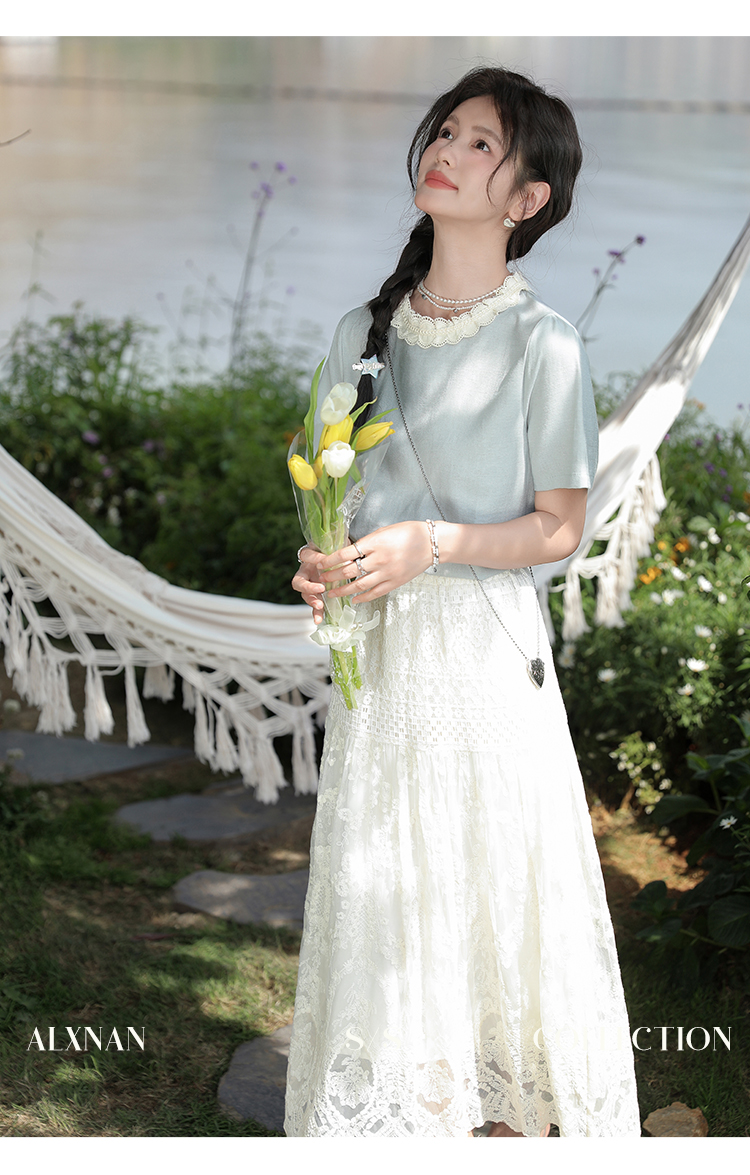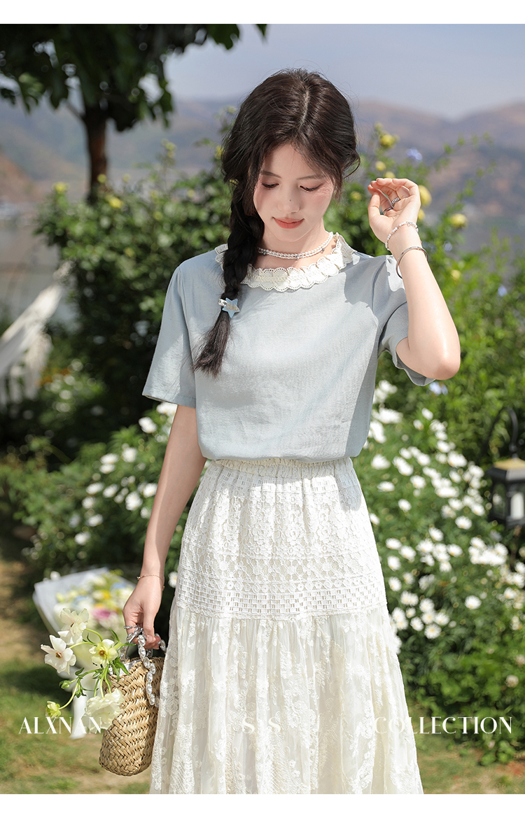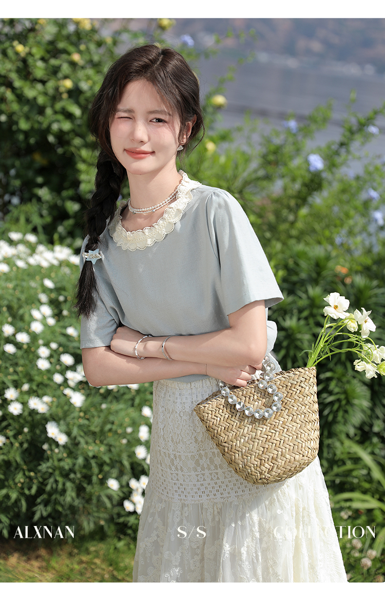 鹿向南「清新蓝语」圆领正肩休闲T恤2025夏季新款通勤短袖上衣女