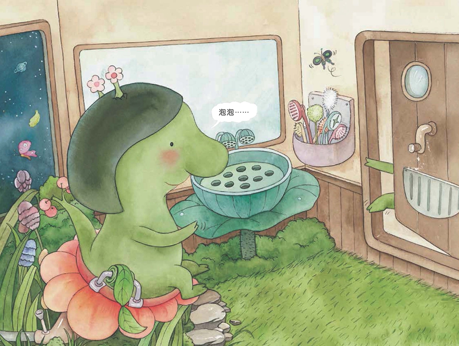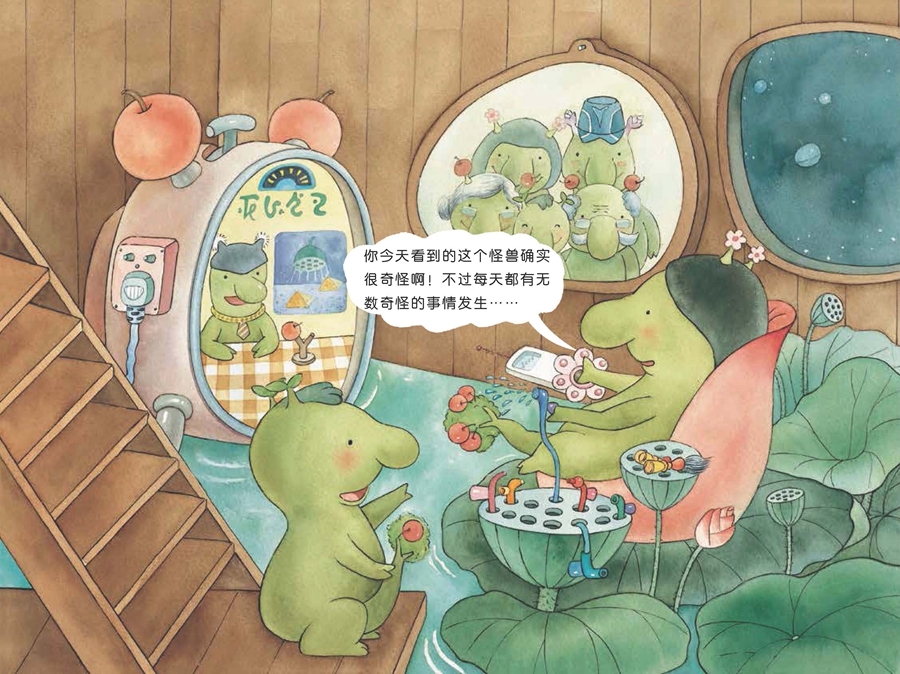 **惊喜的是,这里面有个非常可爱的小怪兽,胖胖的身体,头上发着小芽,大大的鼻子,只有三颗牙齿,尾巴像棵苹果树。它们住在莲花池一个神秘的空间里,洗手池是莲蓬,沙发是荷花,还有墙上的钟的指针是一只爬行的小蜗牛!