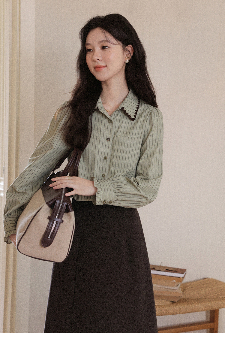 鹿向南「深邃松林」气质豆绿色条纹翻领衬衫百搭显瘦长袖上衣女秋