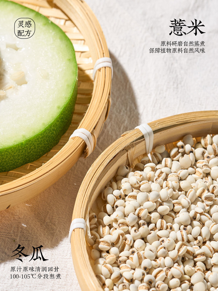 特别推出两种口味,口感反复调试,好喝到停不下来✨ 🔸五指毛桃薏米水:国家地理标志💎种植薏米基地📍烘炒慢熬煮,淡淡"椰香" 🔸冬瓜薏米水:精选优质冬瓜,整个冬瓜削皮后一起熬煮,营养不流失,口感清甜有回甘!
