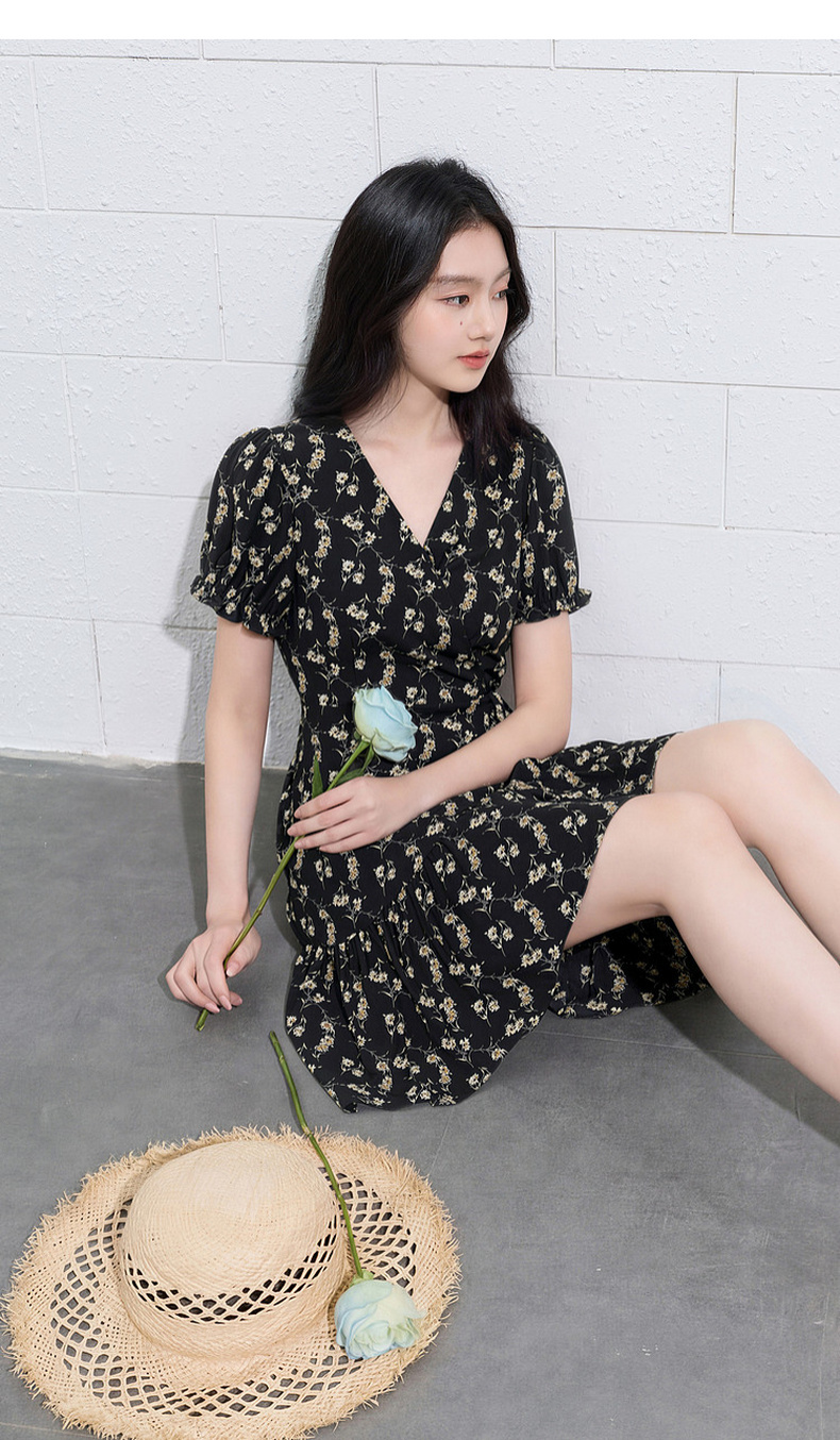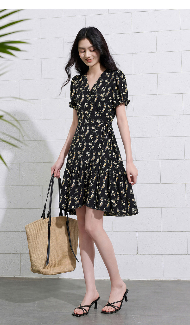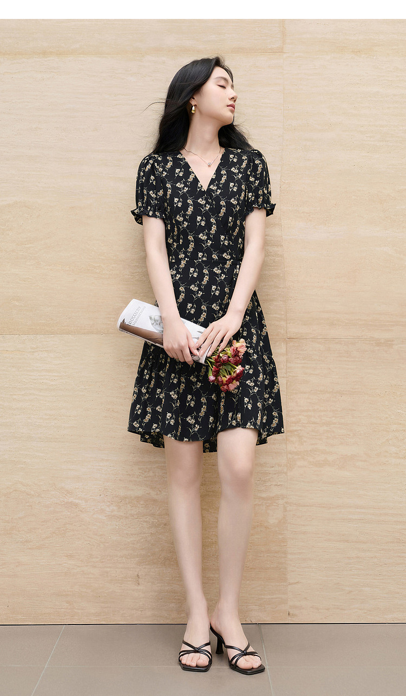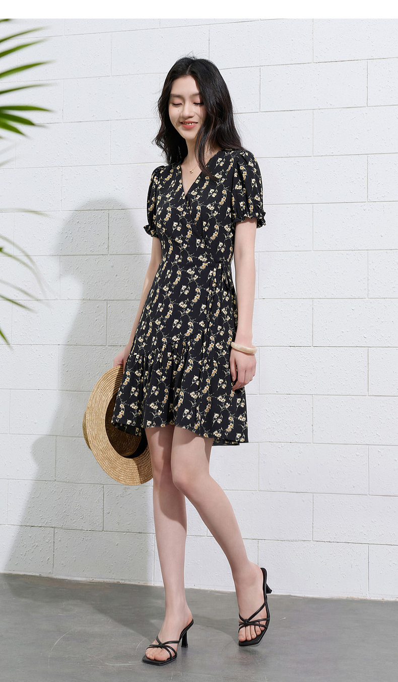 三彩2026夏季新款碎花连衣裙法式V领收腰A字裙短裙S