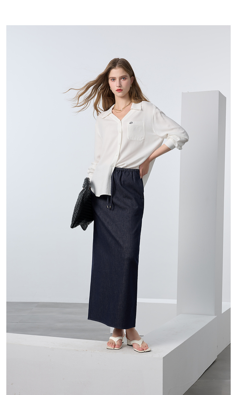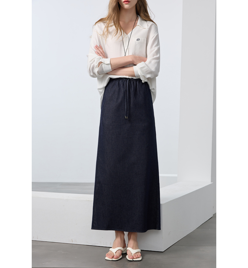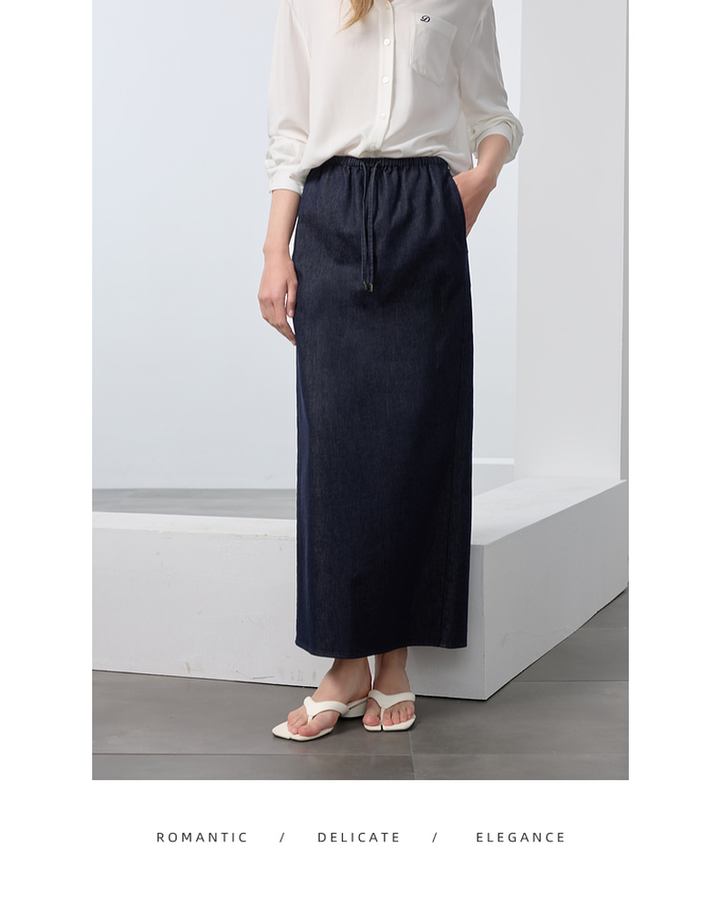 三彩2025春季新款深色牛仔半身裙高腰松紧直筒裙长裙休闲M