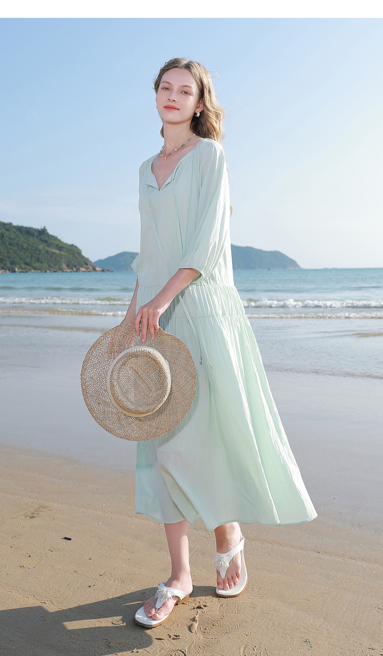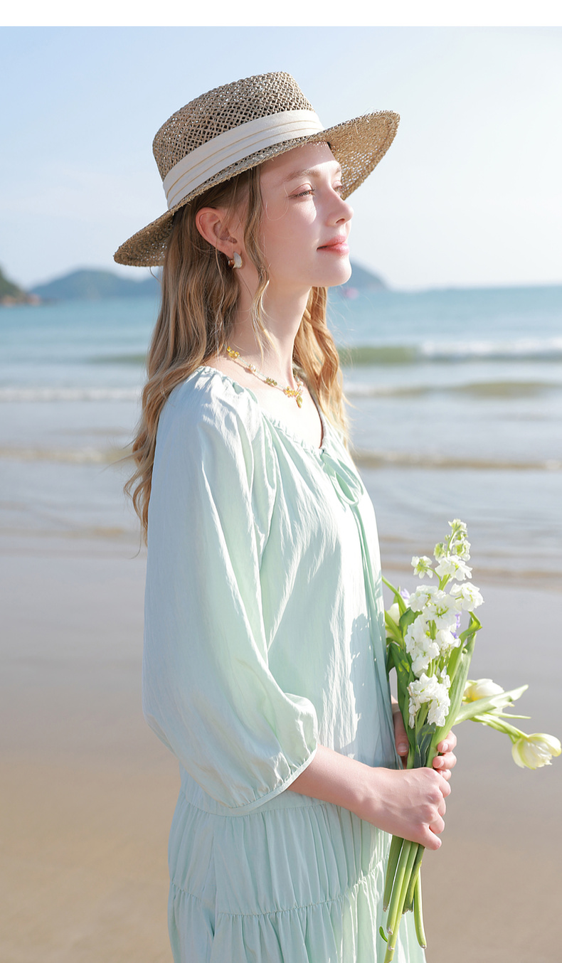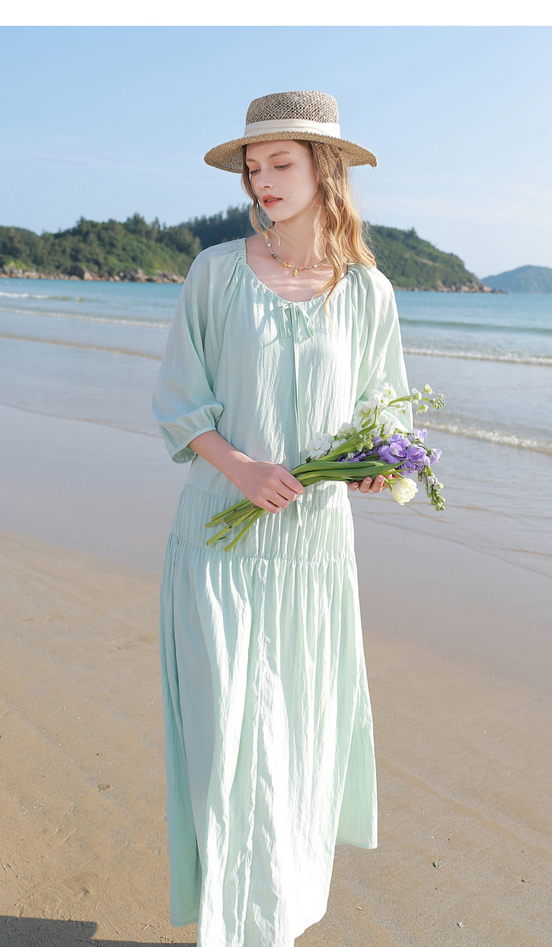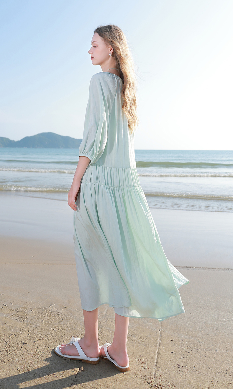 三彩2026春季新款灯笼袖A字裙法式连衣裙宽松长裙系带圆领M