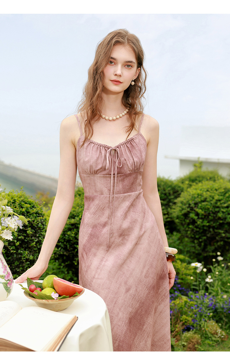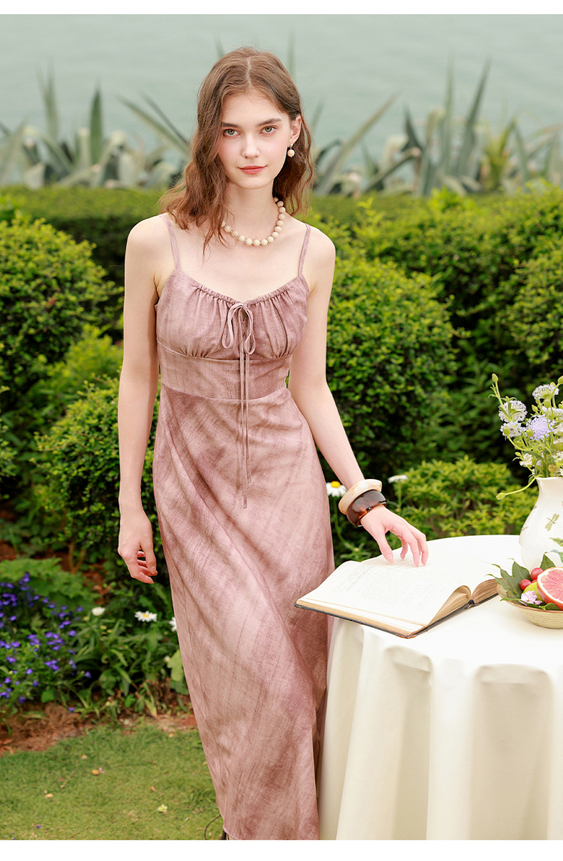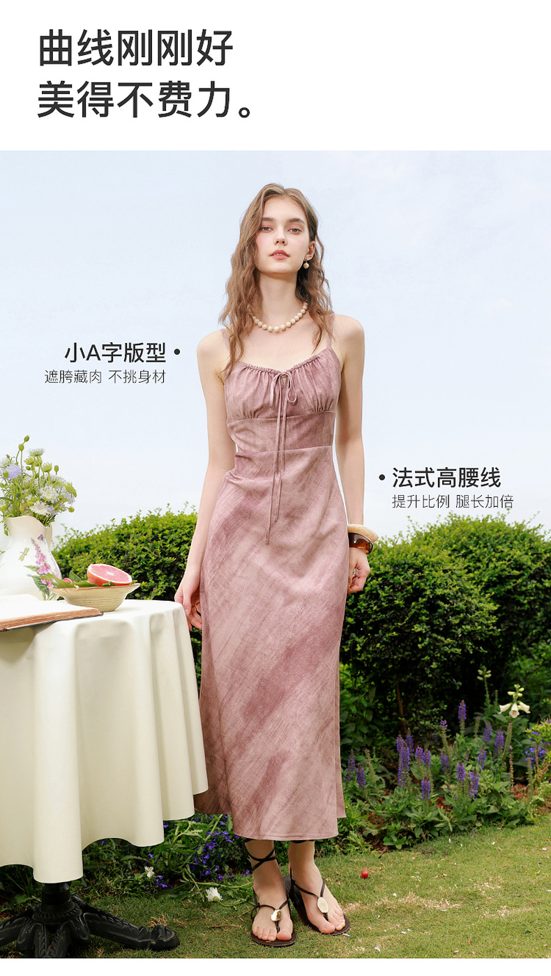 三彩独醒2025夏季新款系带V领吊带裙晕染印花连衣裙收腰长裙F