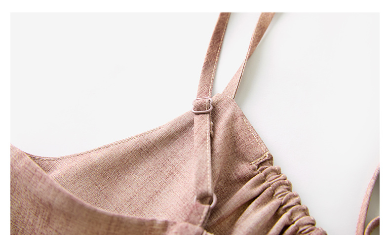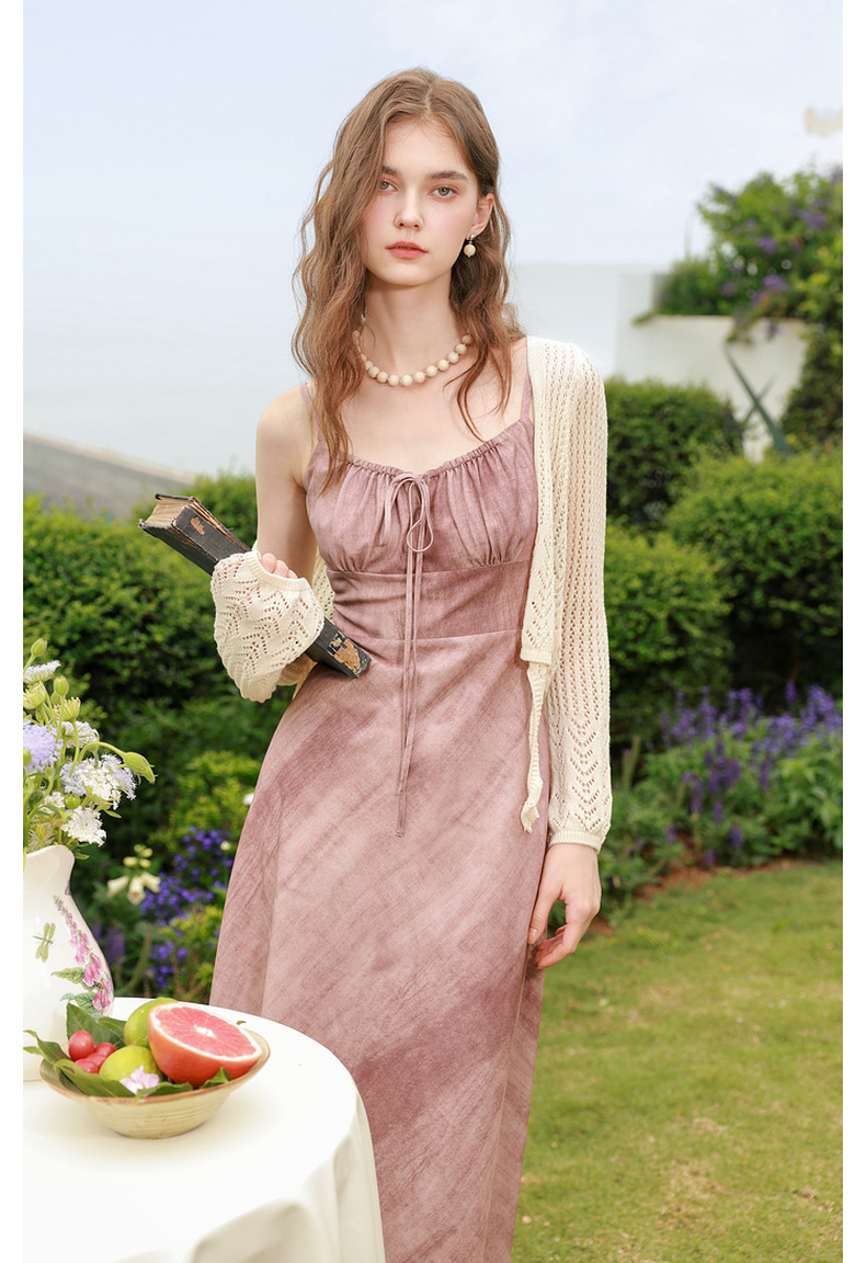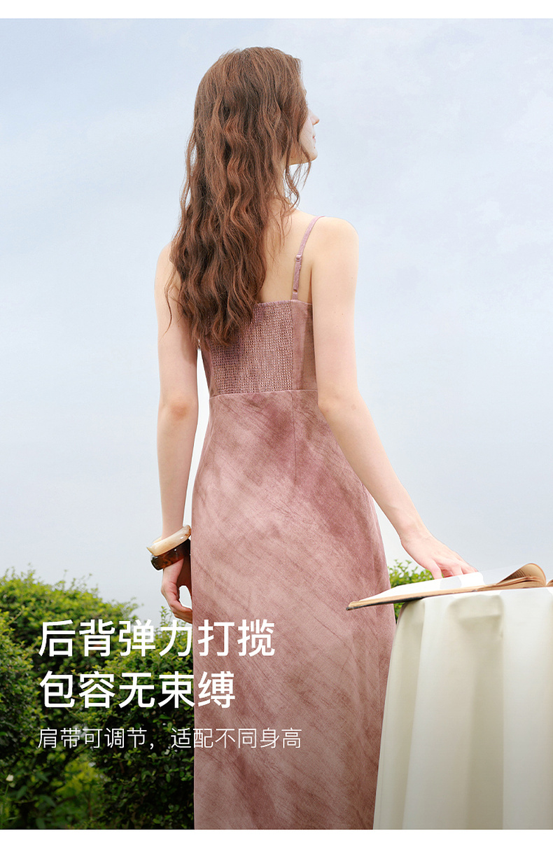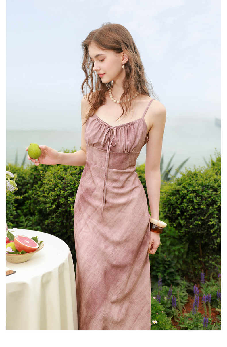 三彩独醒2025夏季新款系带V领吊带裙晕染印花连衣裙收腰长裙F