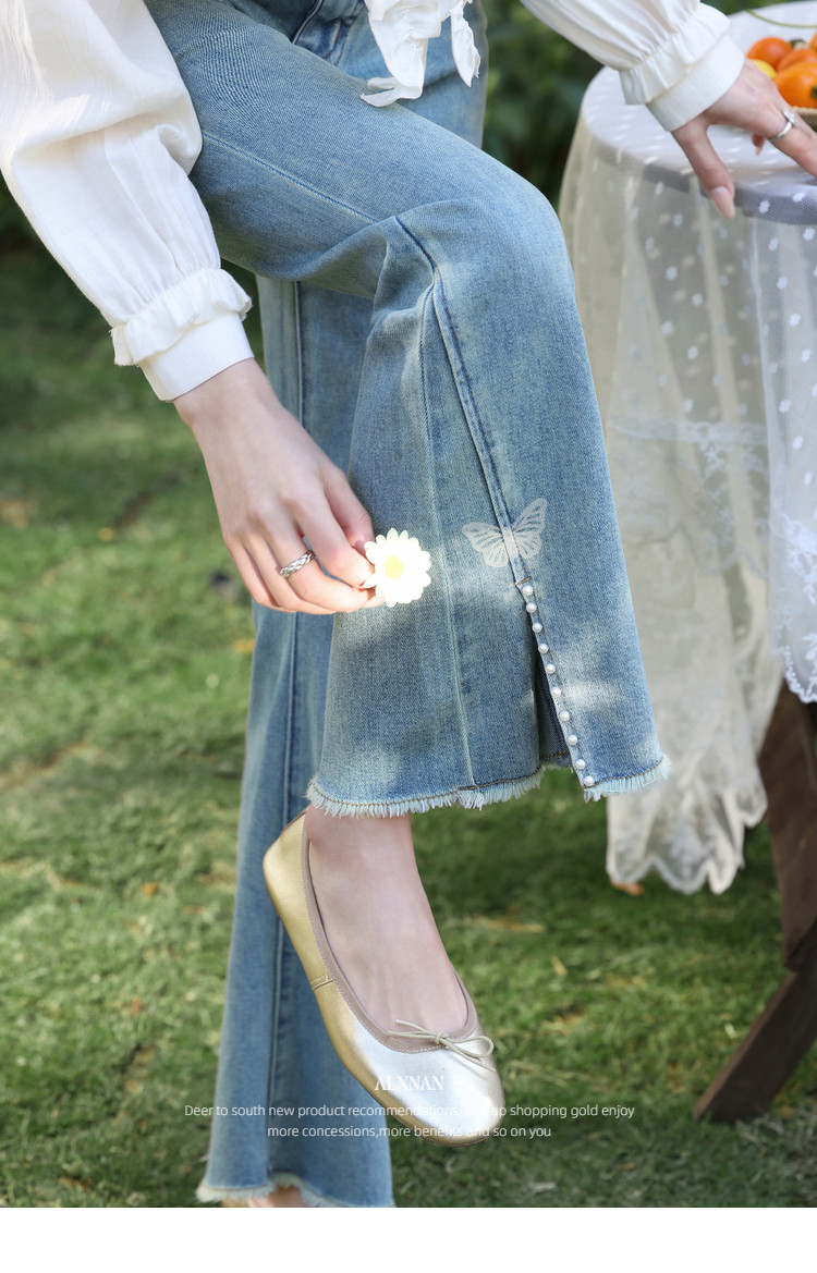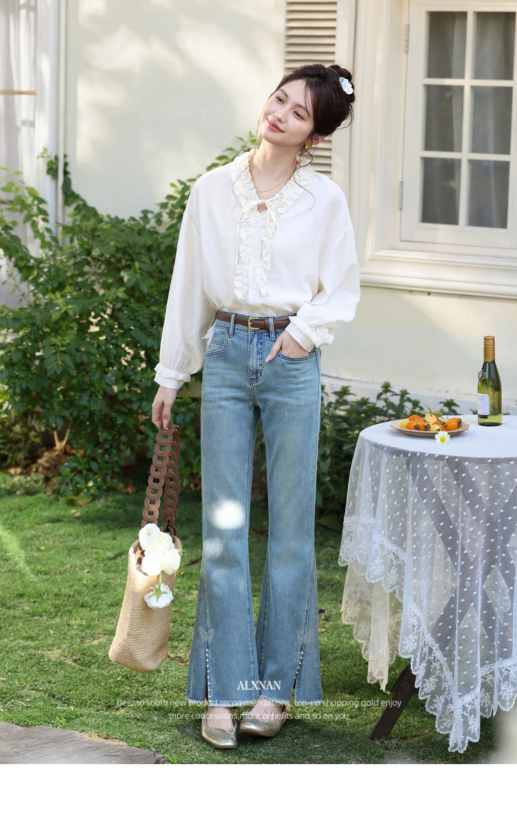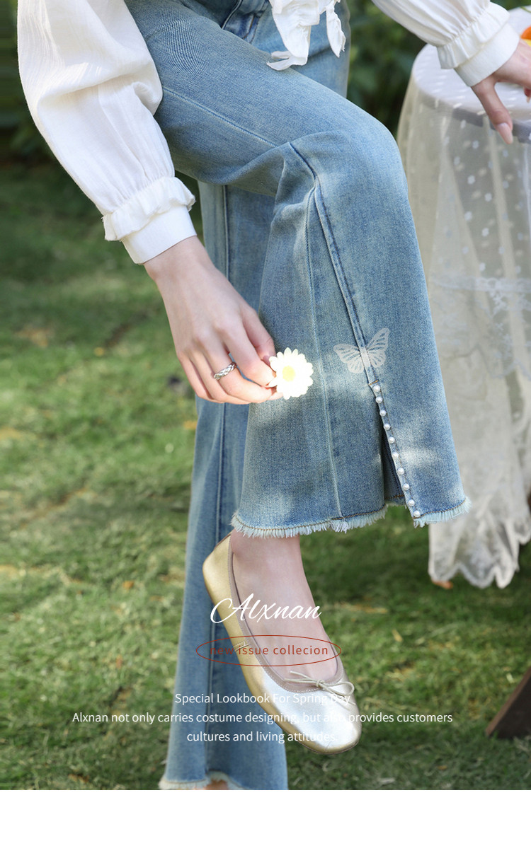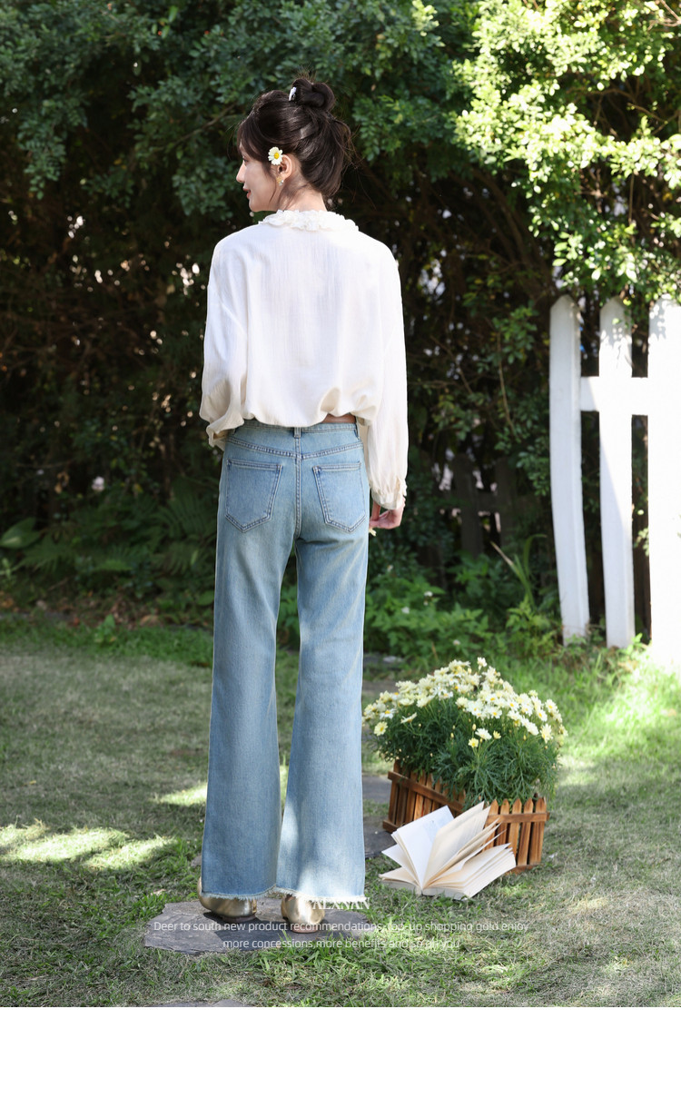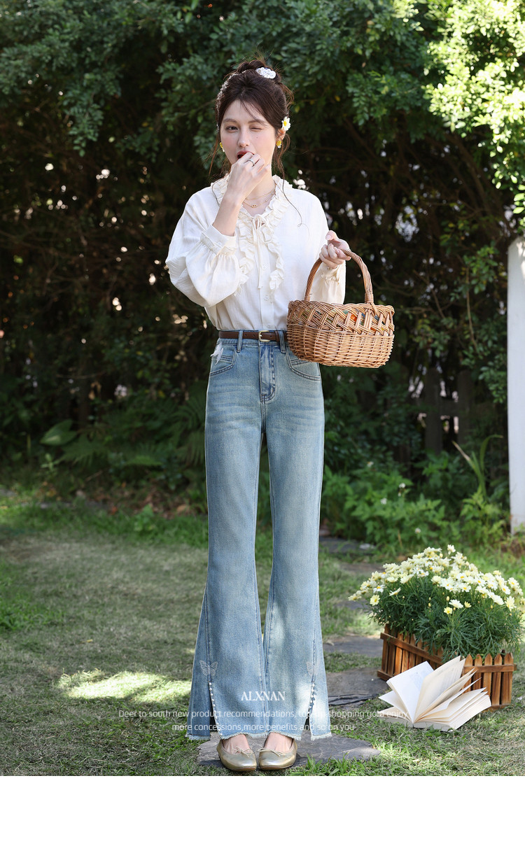 鹿向南「慵懒时光」蓝色微喇牛仔裤女春季新款设计感开叉直筒裤子