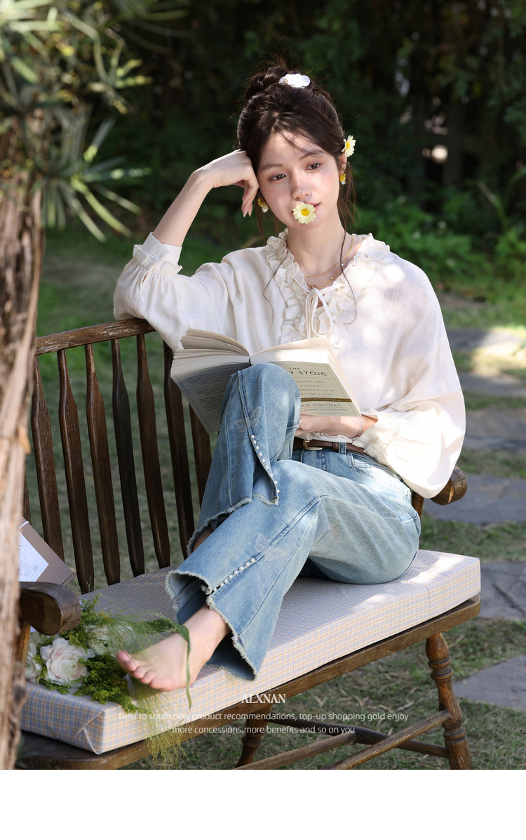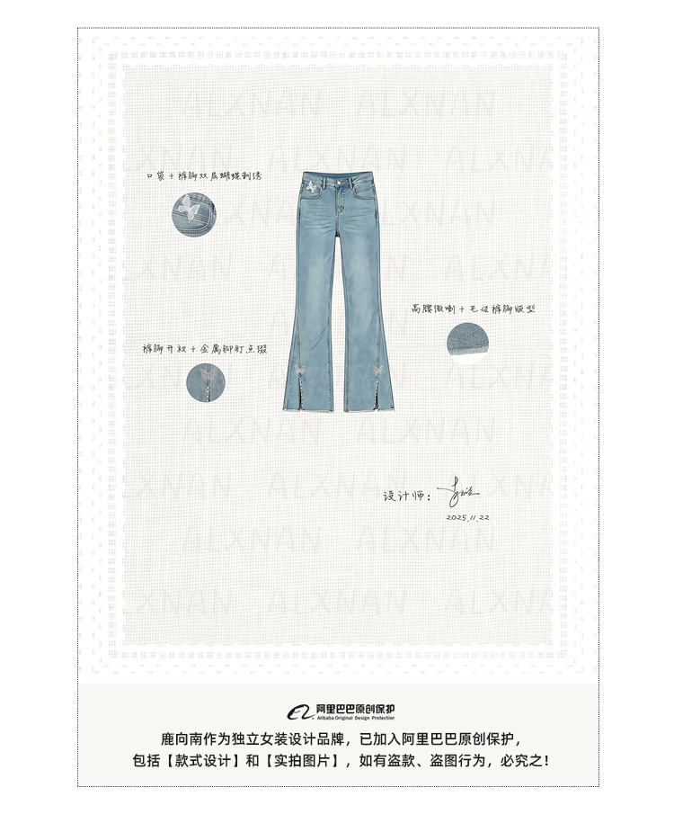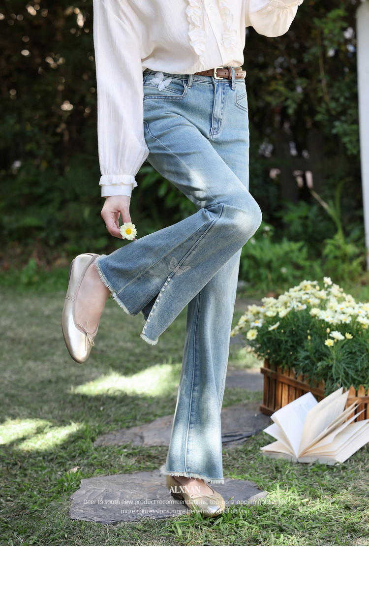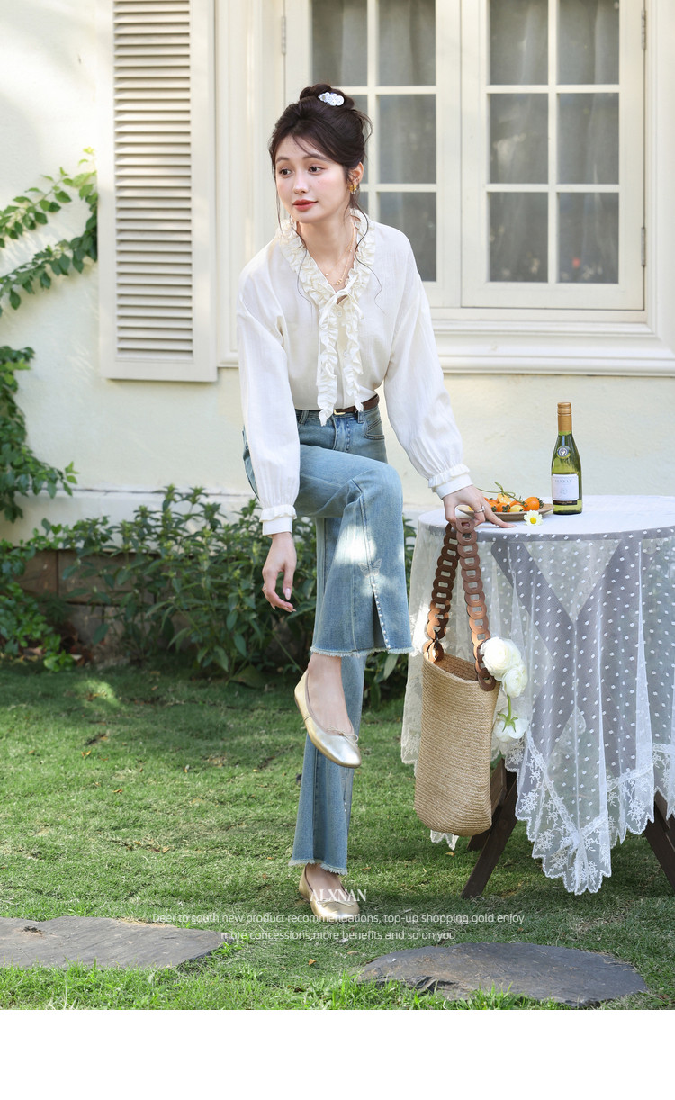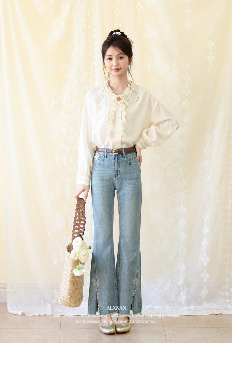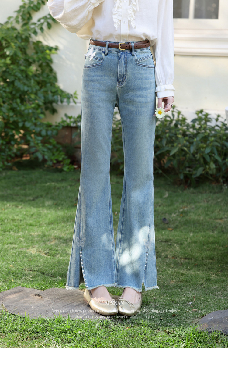 鹿向南「慵懒时光」蓝色微喇牛仔裤女春季新款设计感开叉直筒裤子