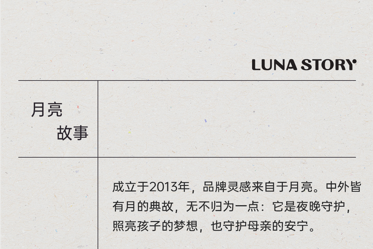 - Lunastory是2017年全新推出的母婴用品高端品牌,致力于维护孩子的安全与健康。以父母之心,开发多种母婴用品,目标是让客户只用Lunastory就能打造出温馨的儿童房。