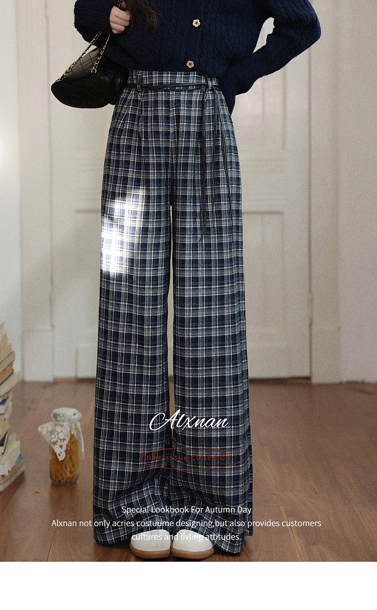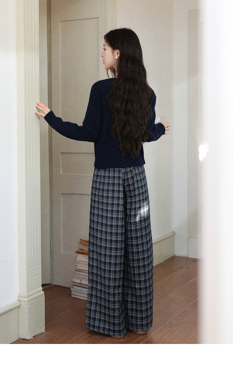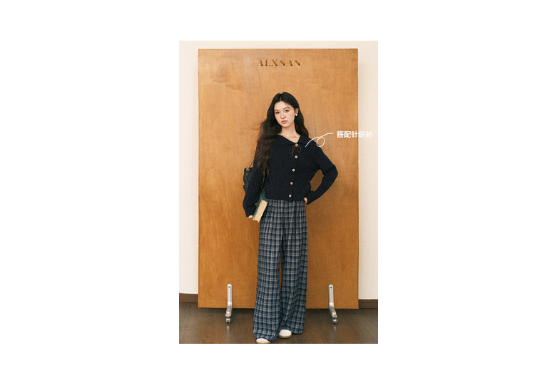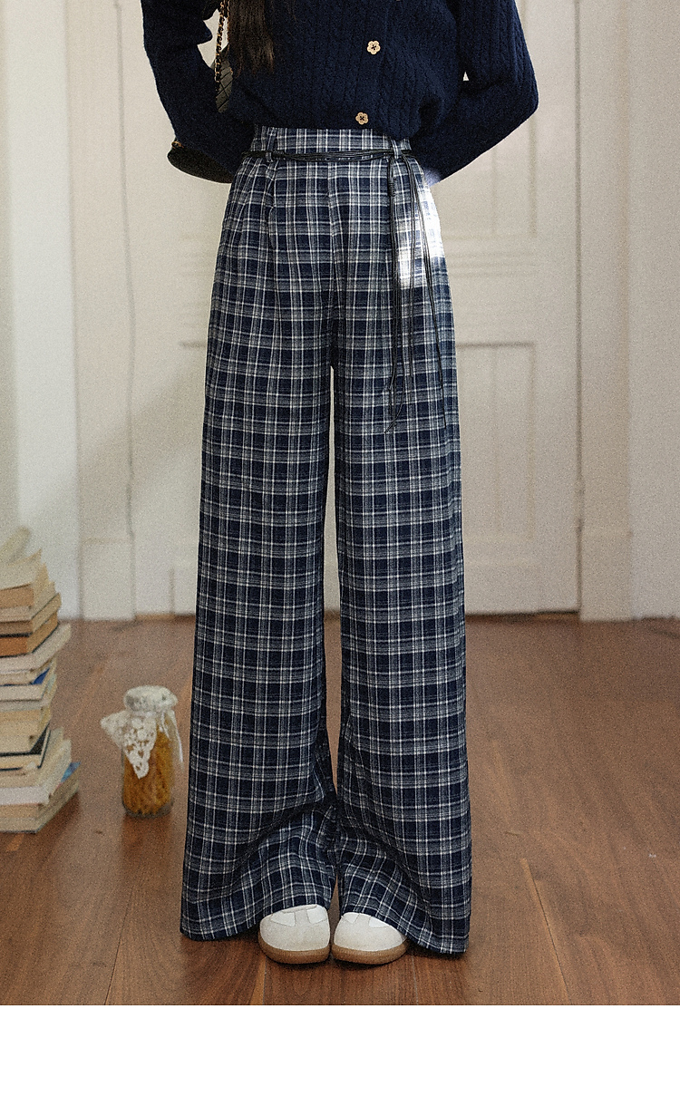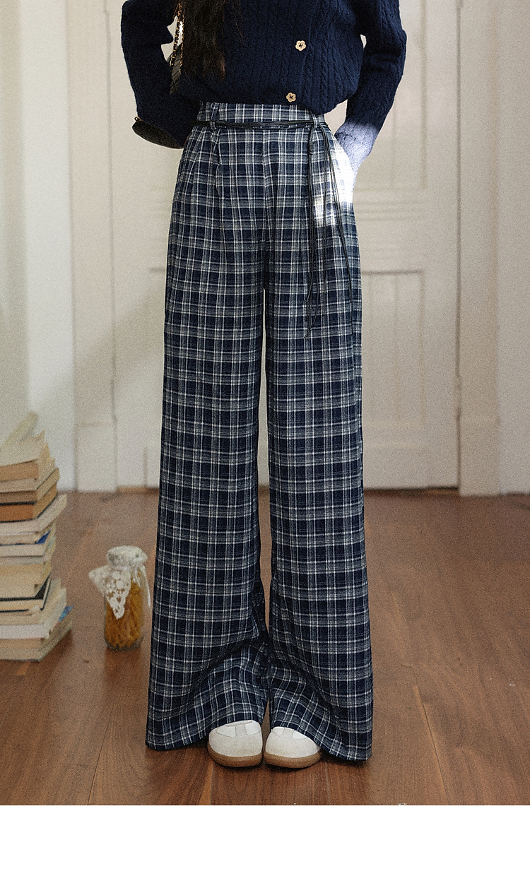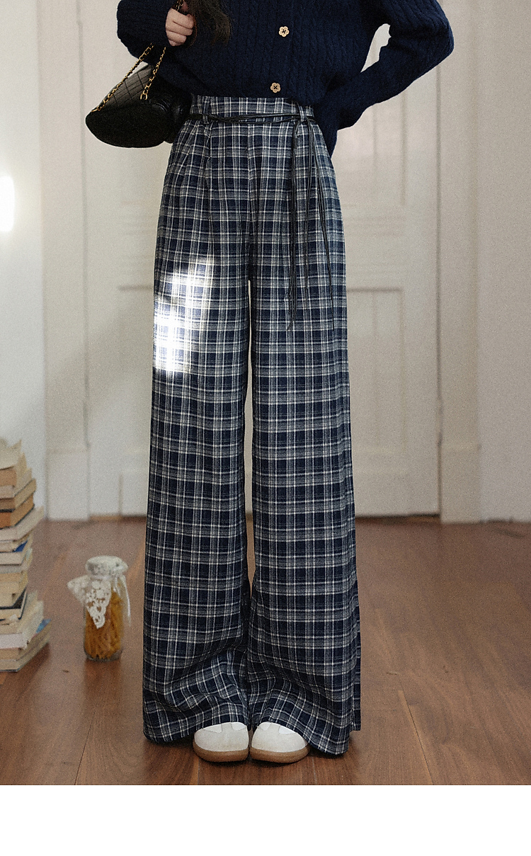 鹿向南「长廊漫步」复古蓝灰格宽松休闲裤女秋新款垂感直筒阔腿裤L58837