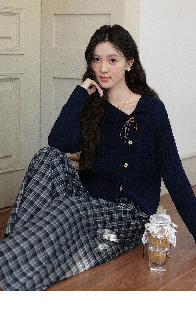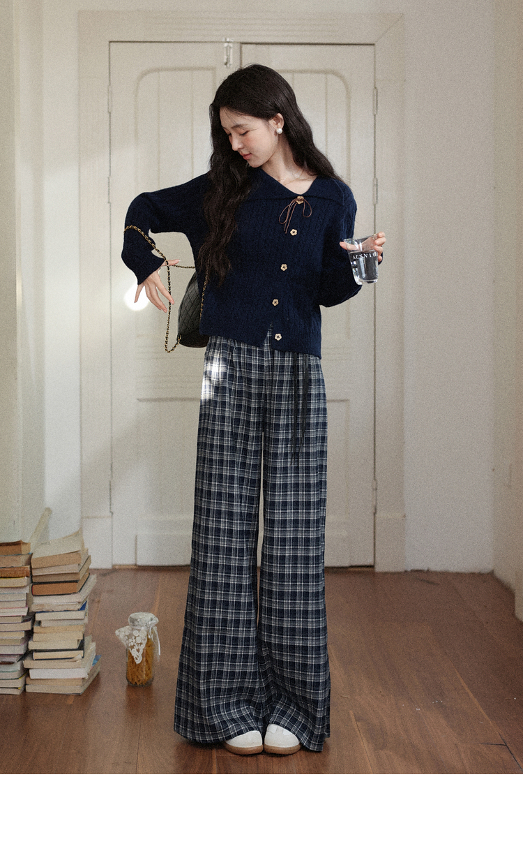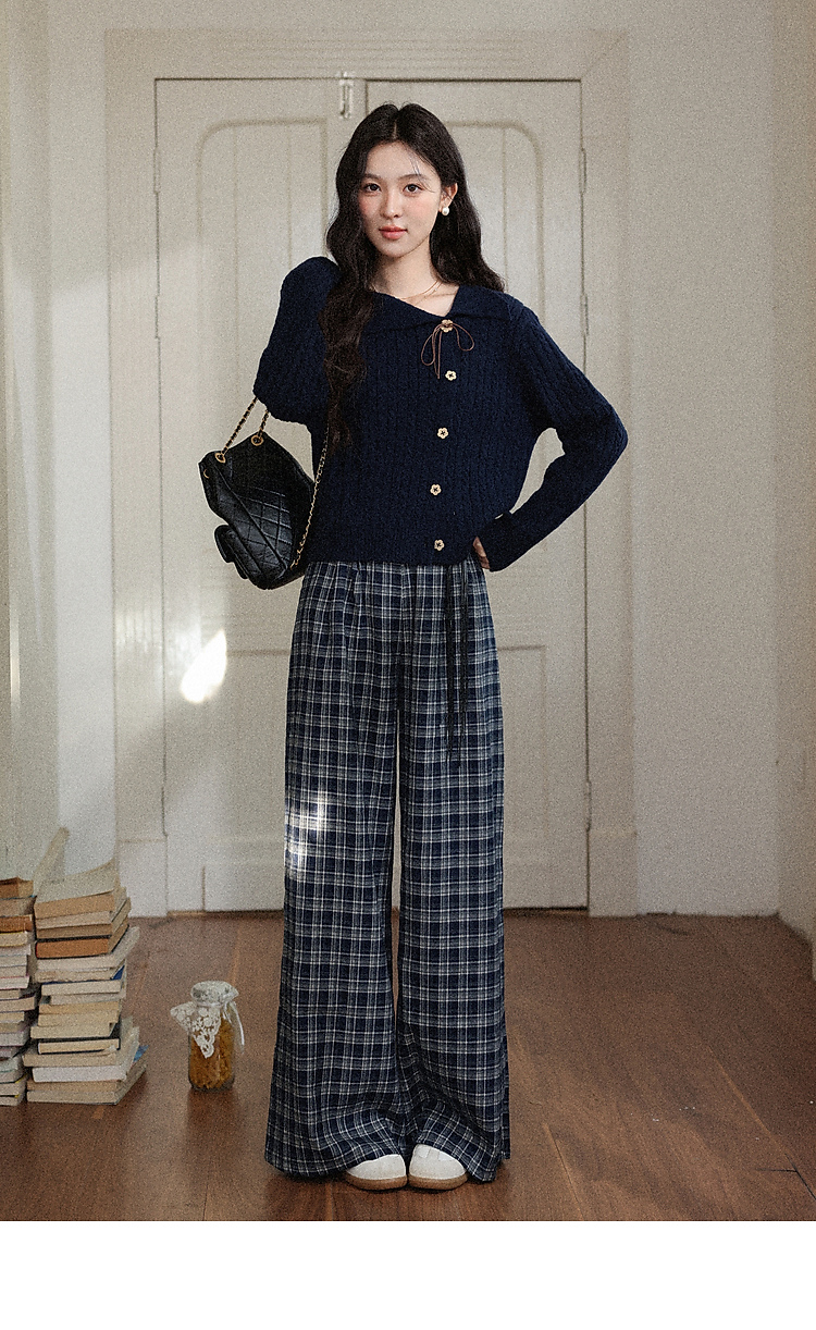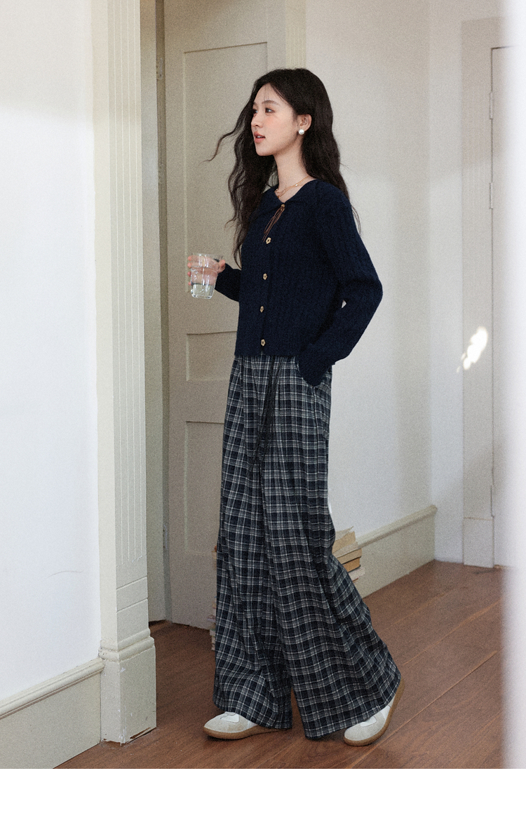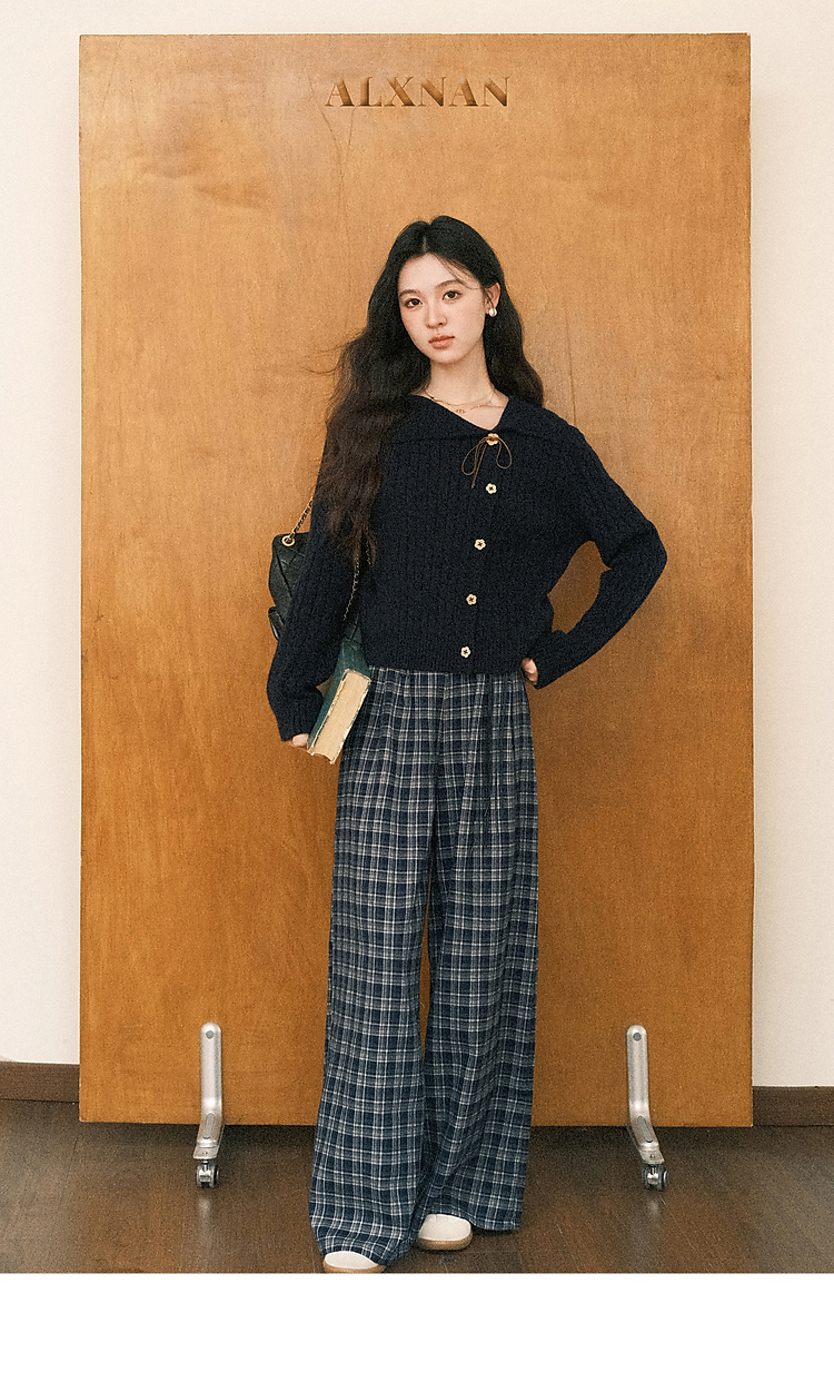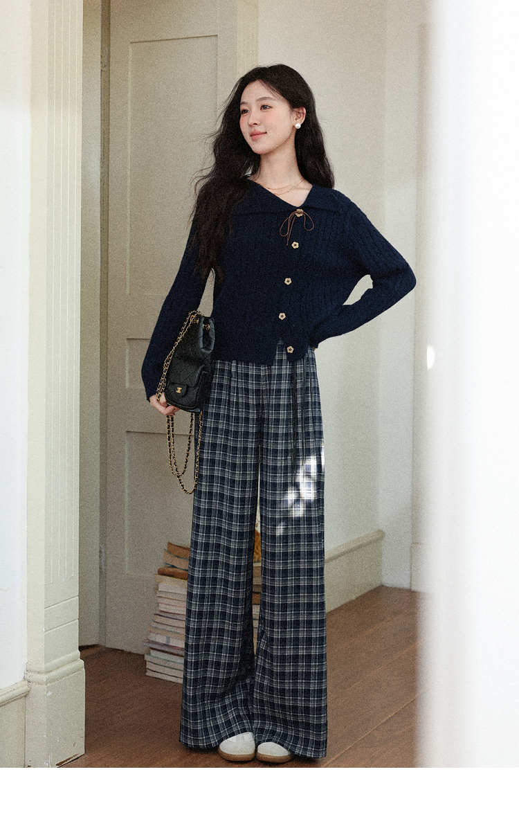鹿向南「长廊漫步」复古蓝灰格宽松休闲裤女秋新款垂感直筒阔腿裤L58837