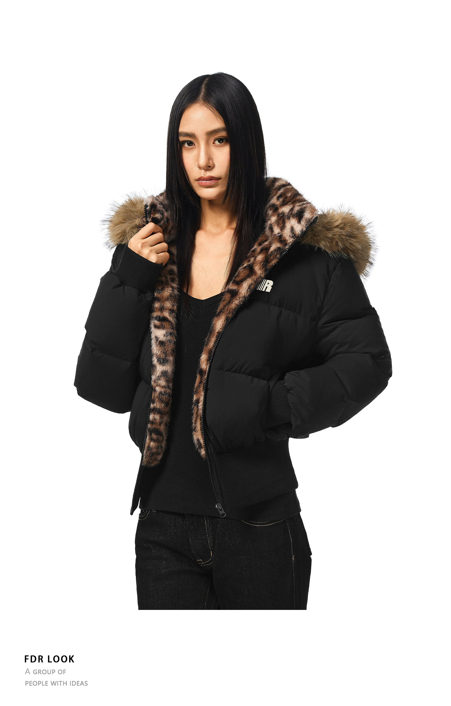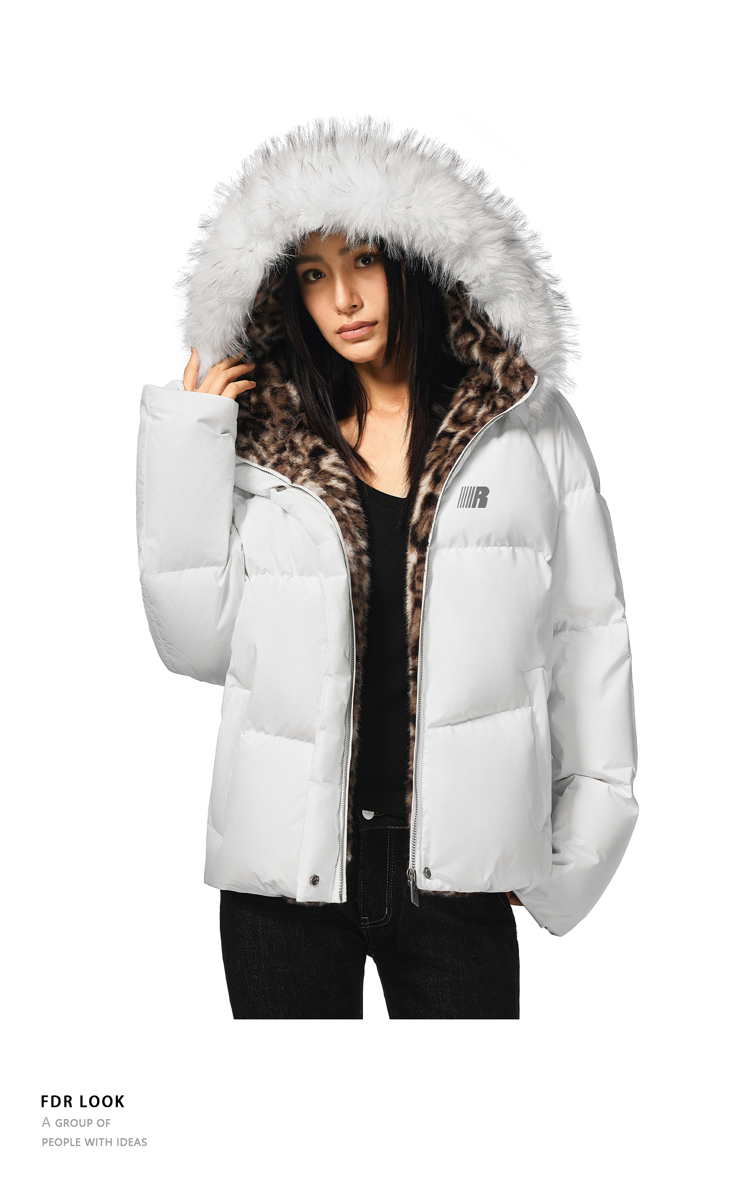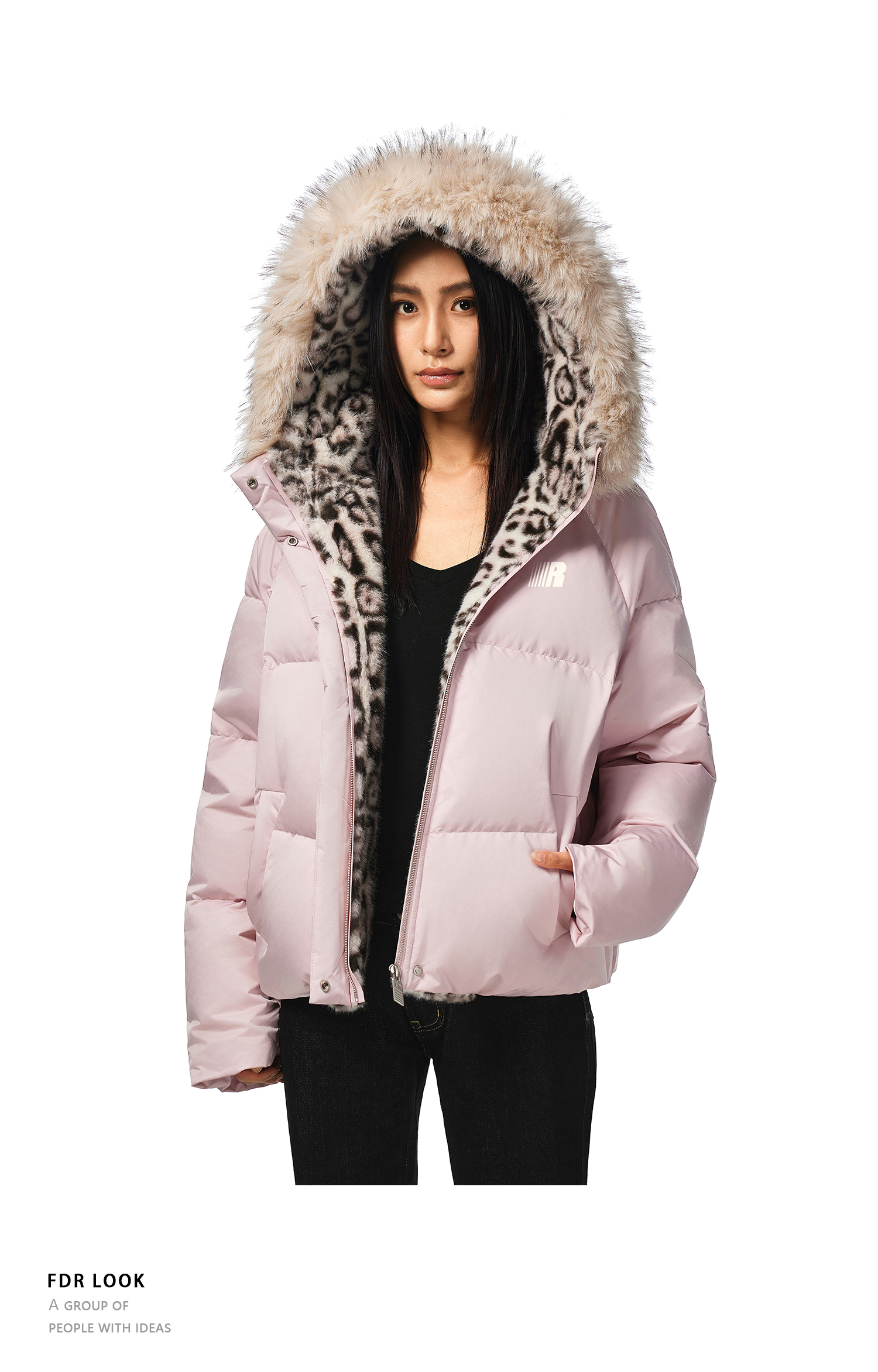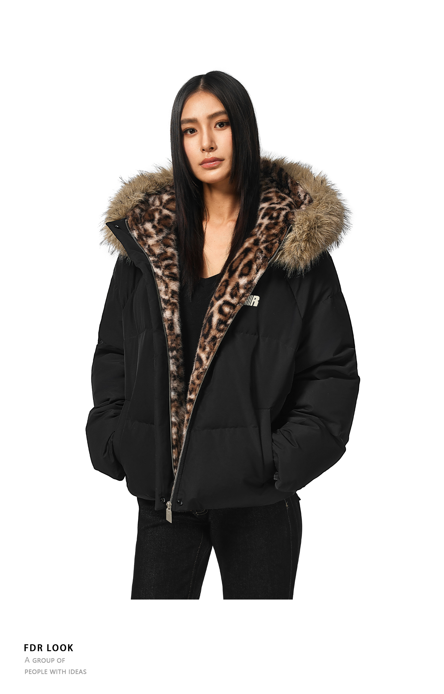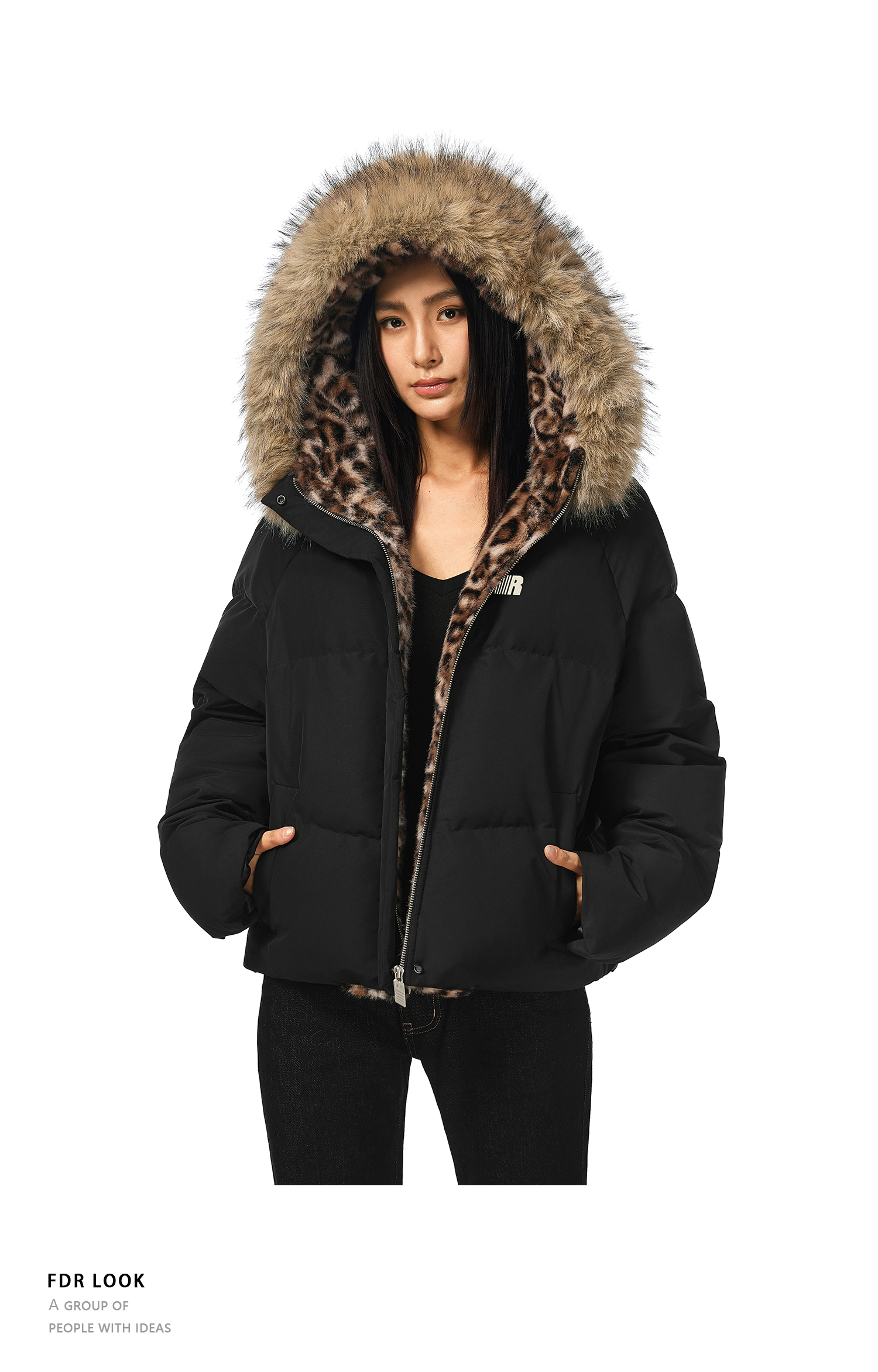 FDR官方店 连帽毛领拼接豹纹外套男款2025巨好看的羽绒服冬季女款