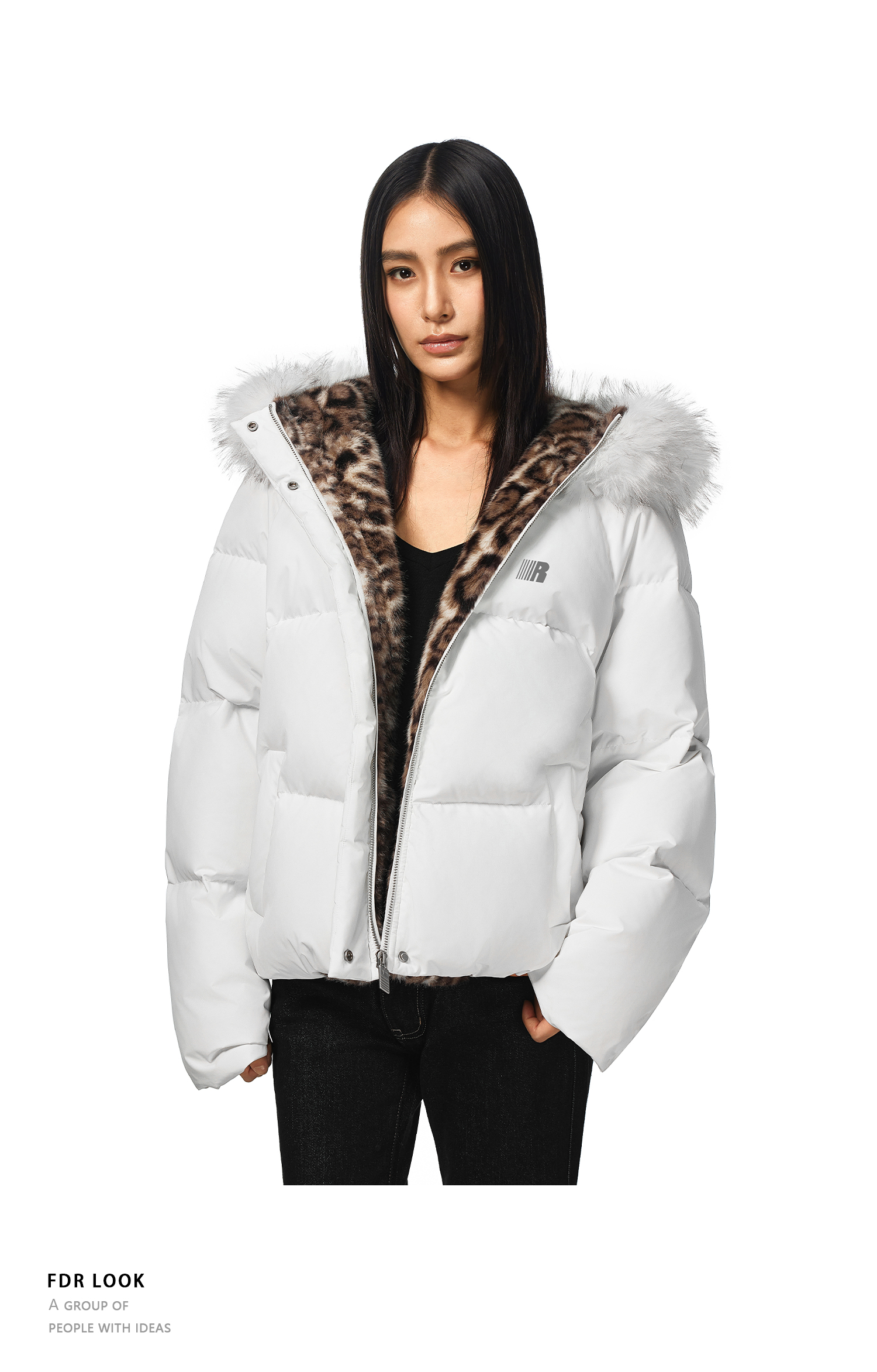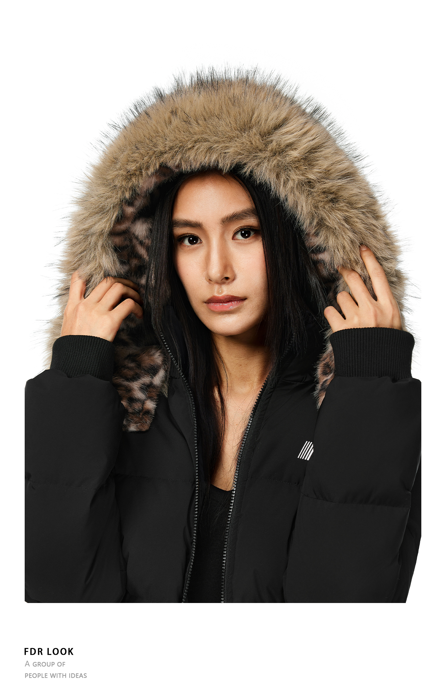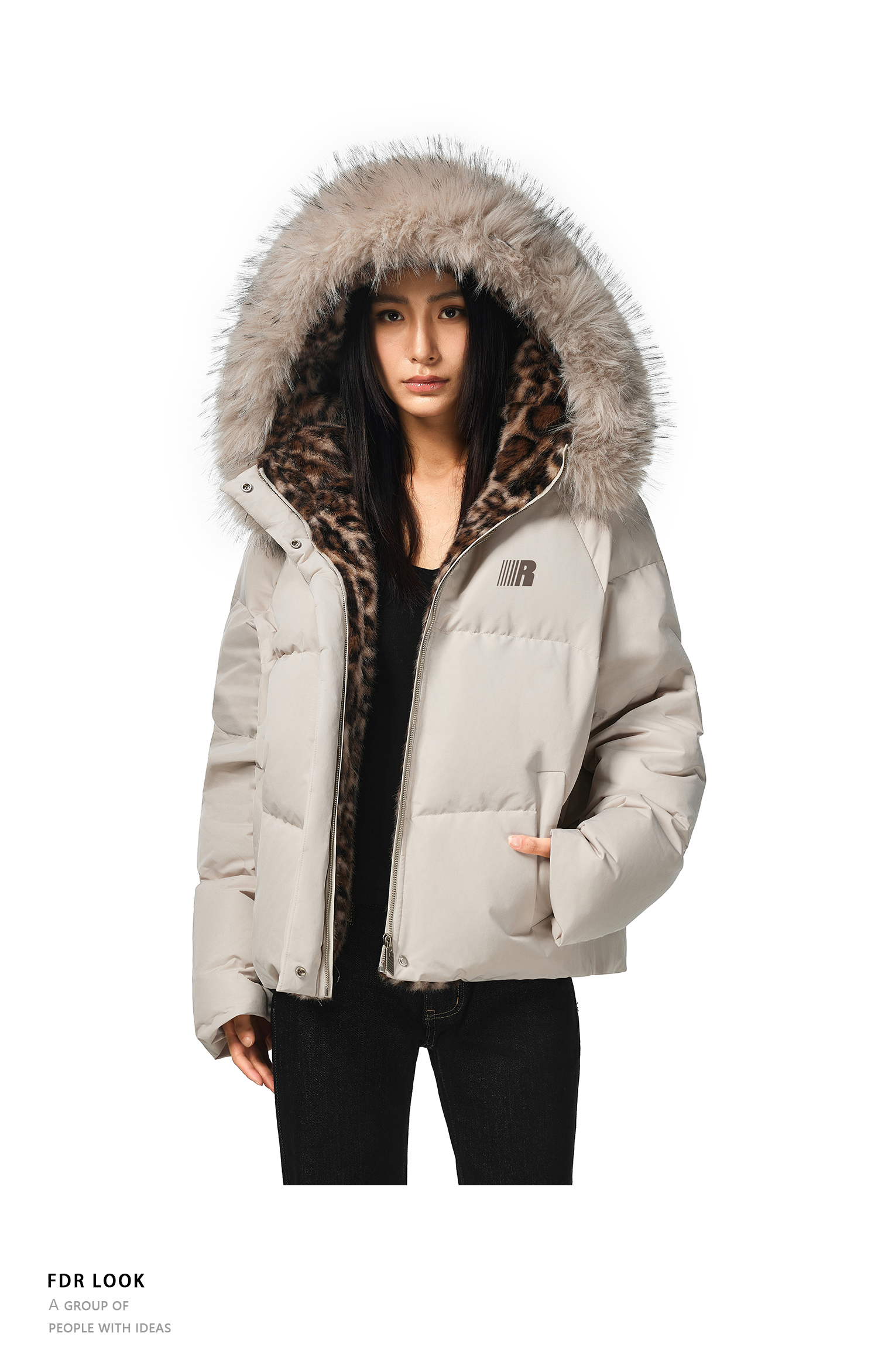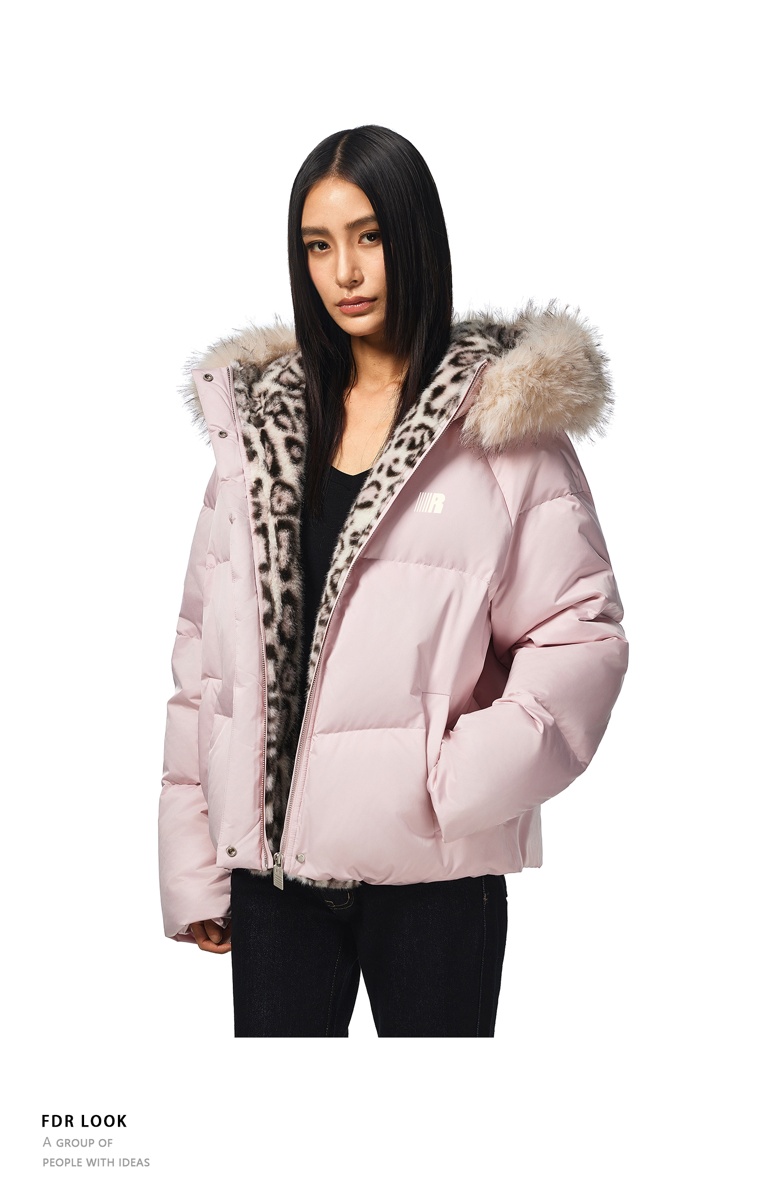 FDR官方店 连帽毛领拼接豹纹外套男款2025巨好看的羽绒服冬季女款