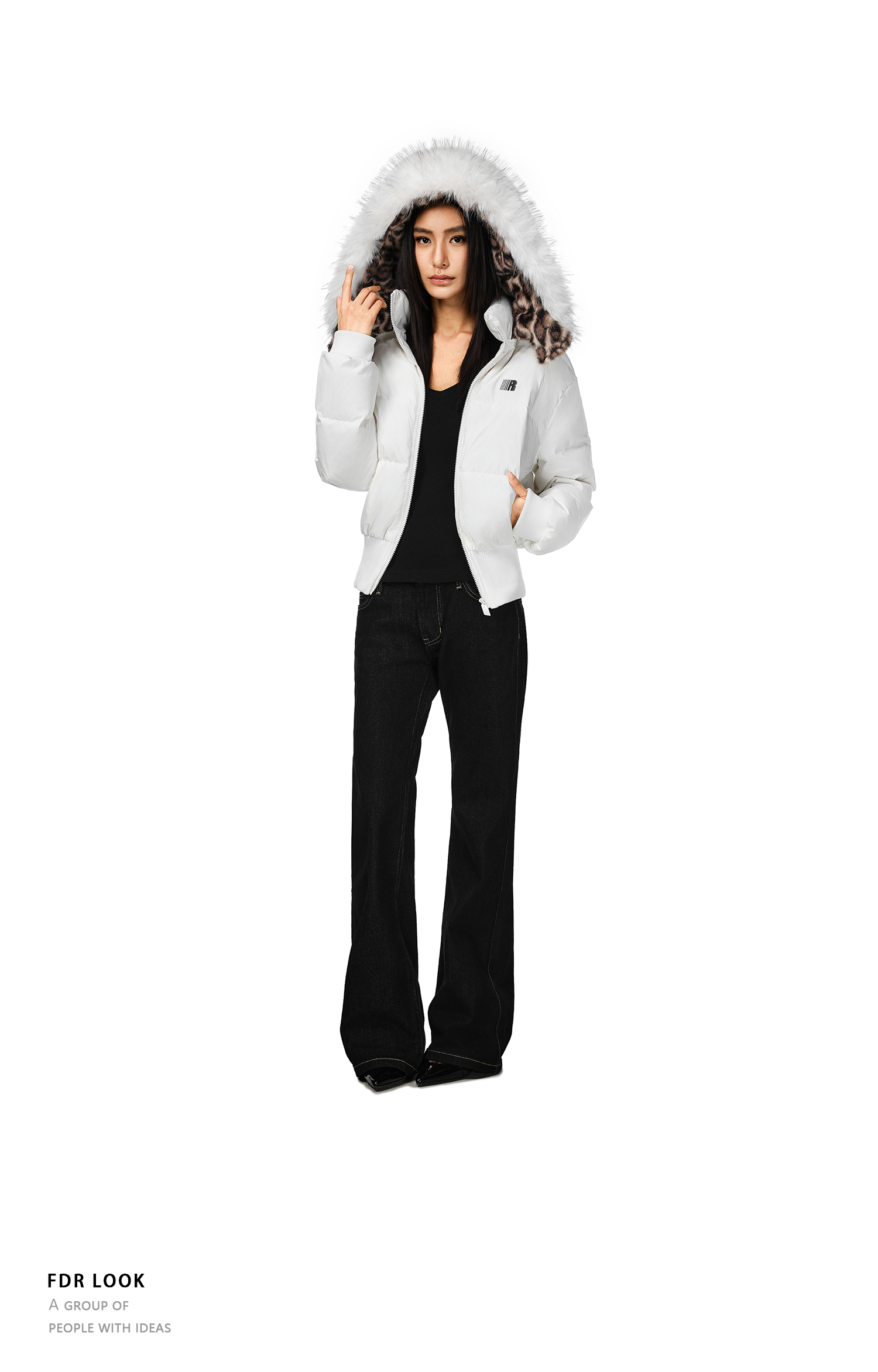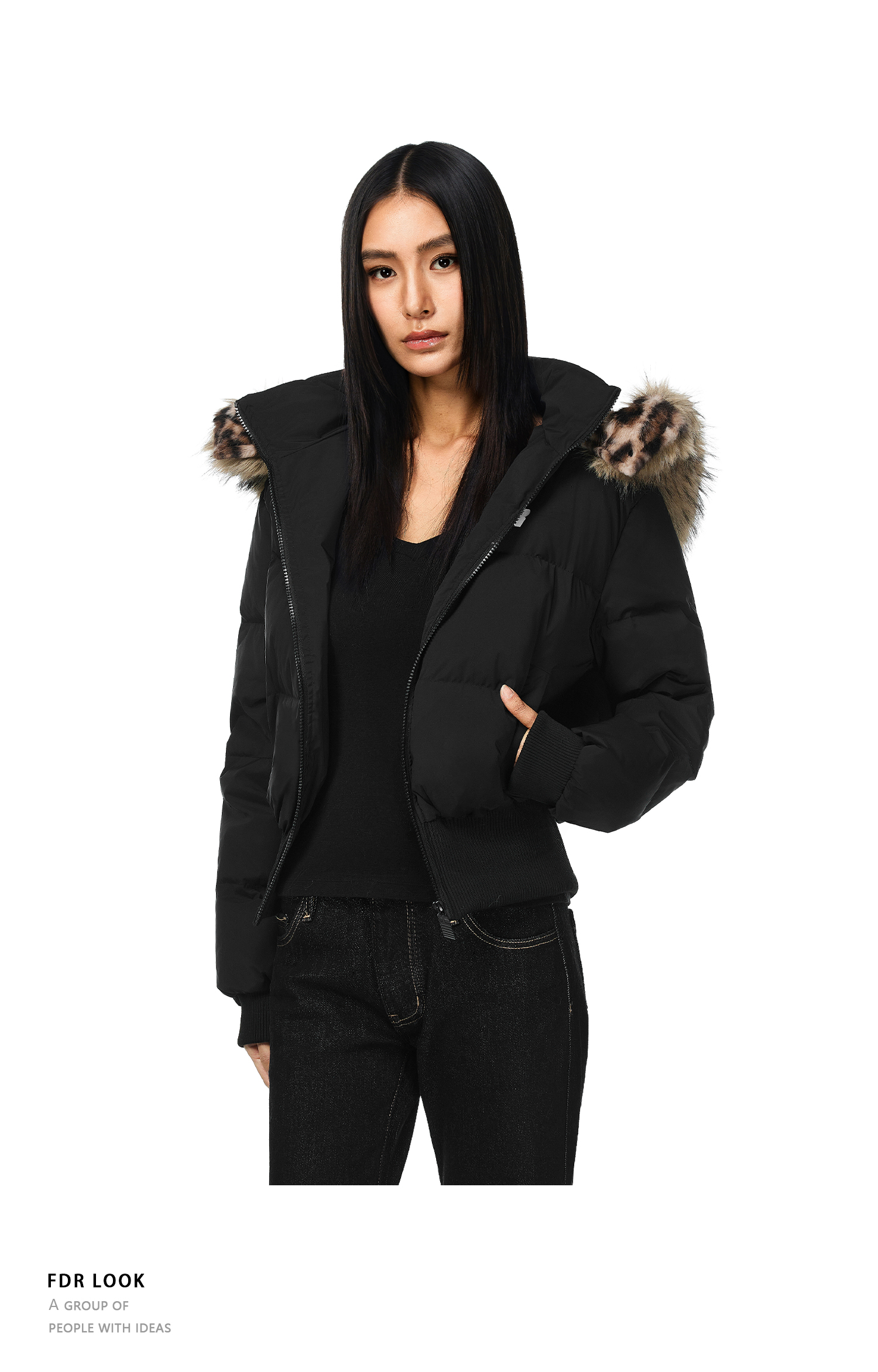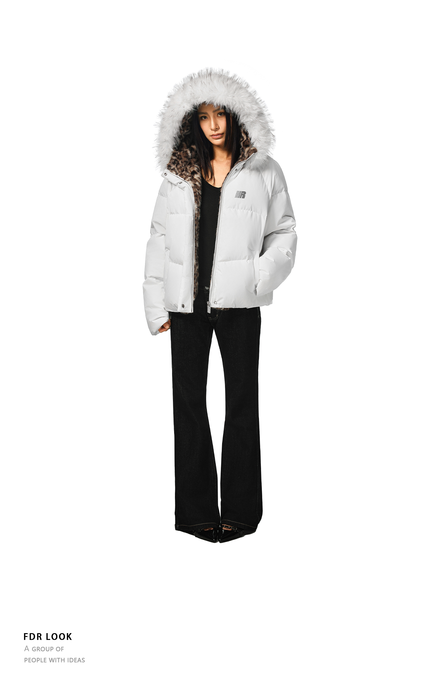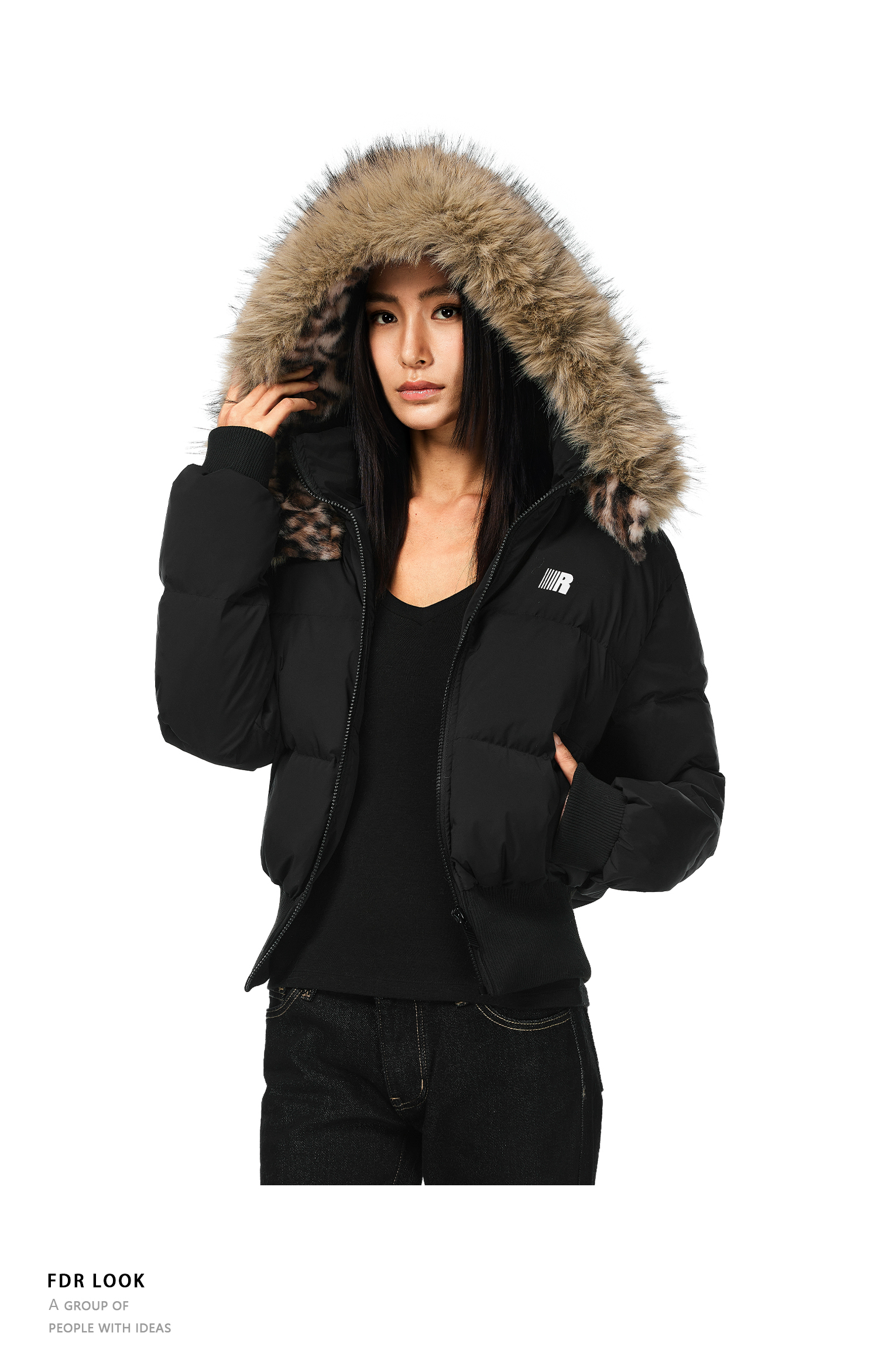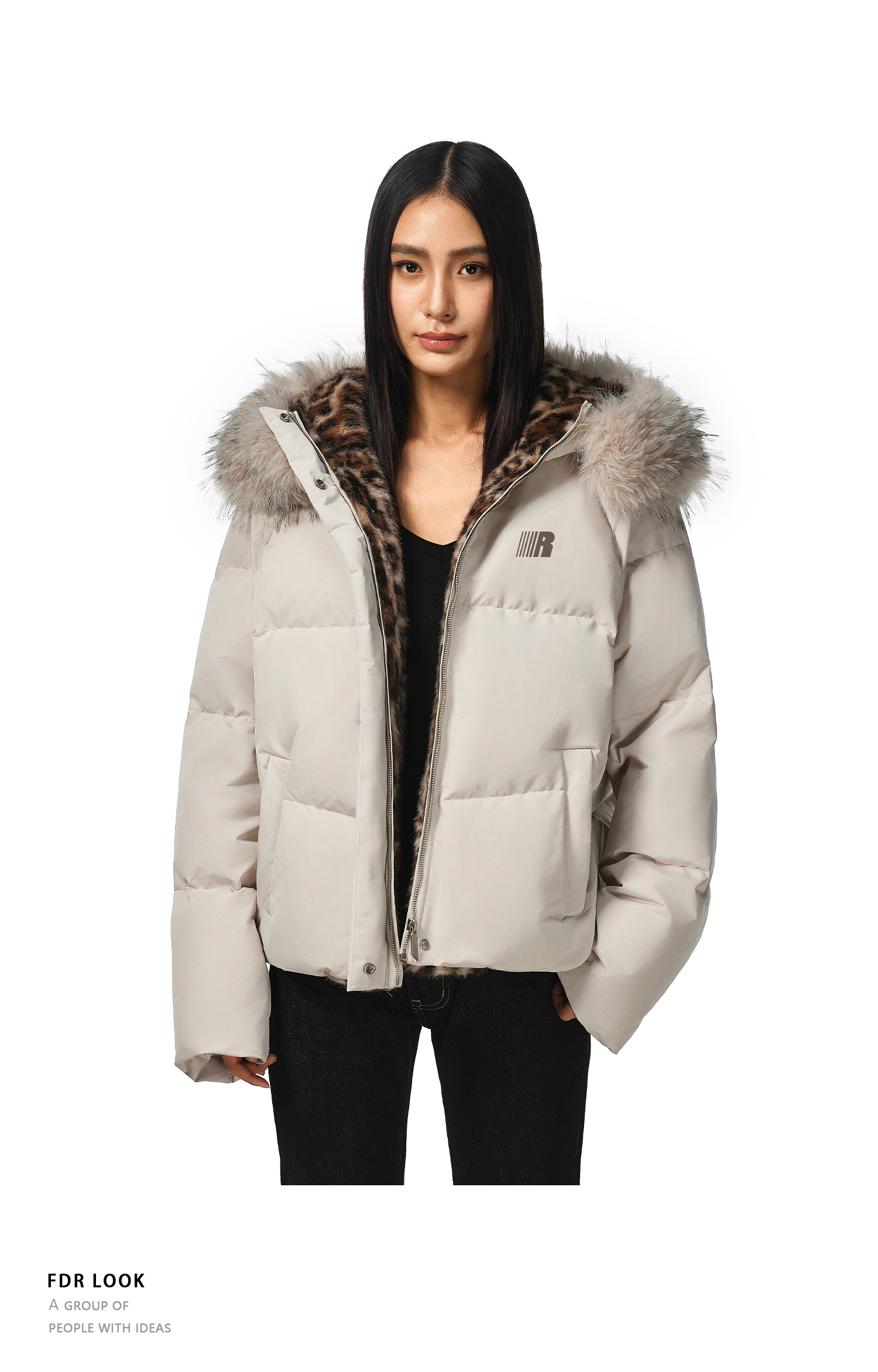 FDR官方店 连帽毛领拼接豹纹外套男款2025巨好看的羽绒服冬季女款