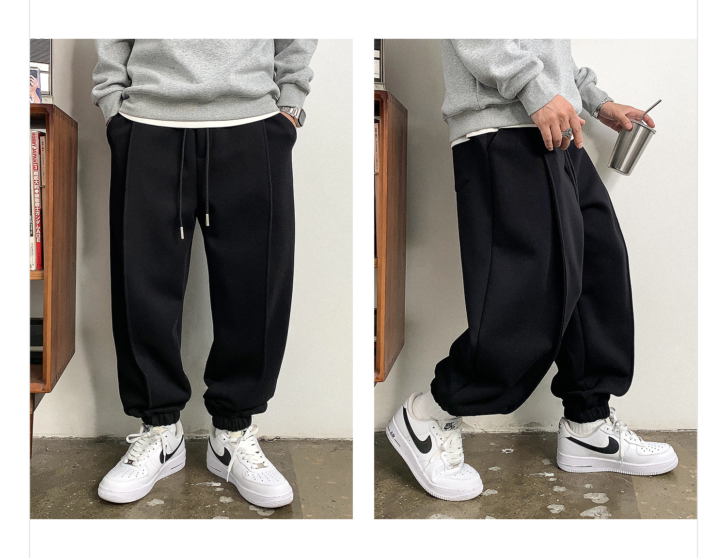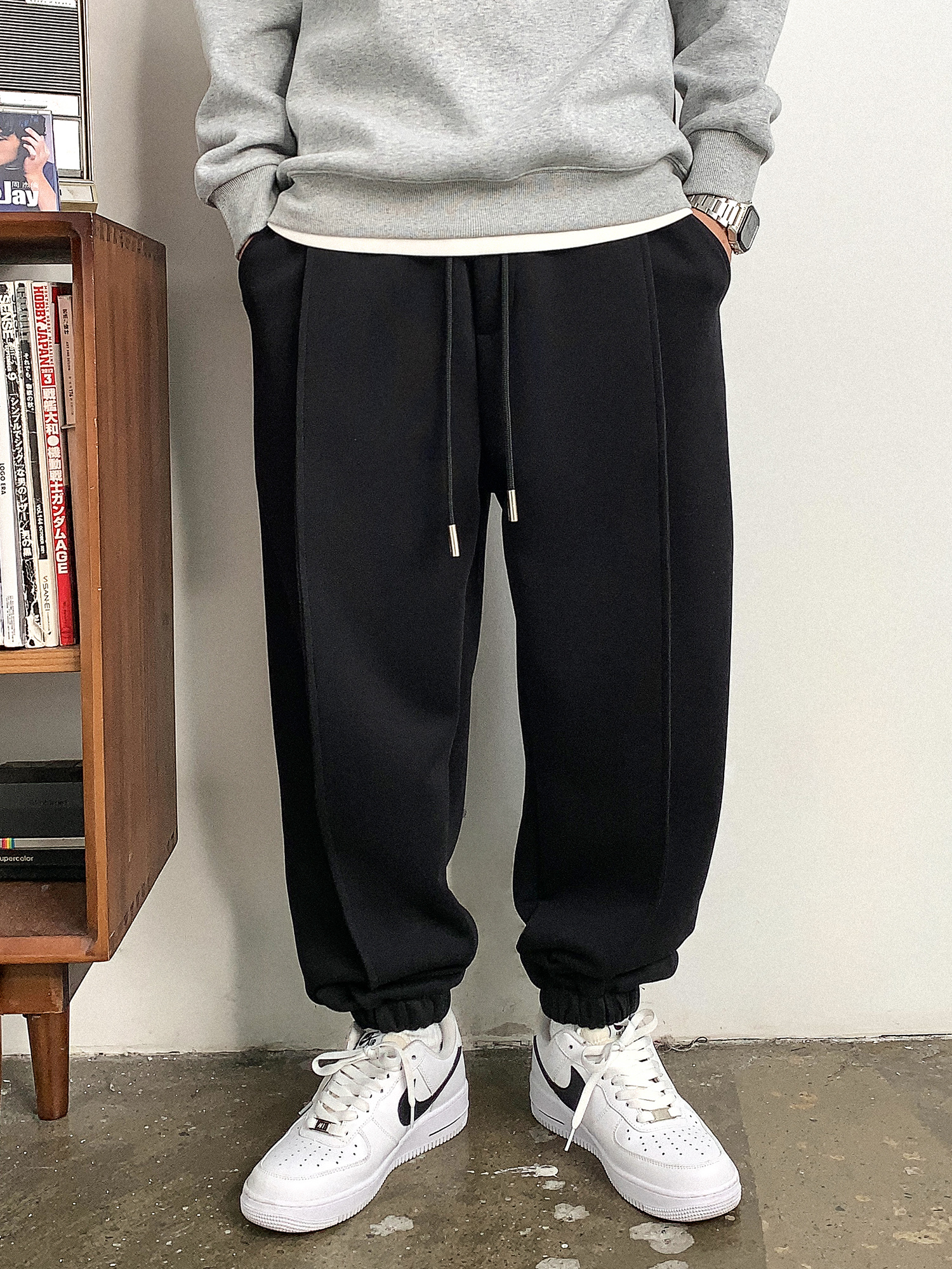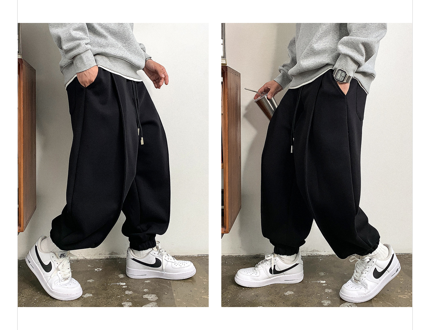 徐太浪设计感褶皱黑色束脚卫裤男秋冬美式休闲宽松阔腿运动长裤子