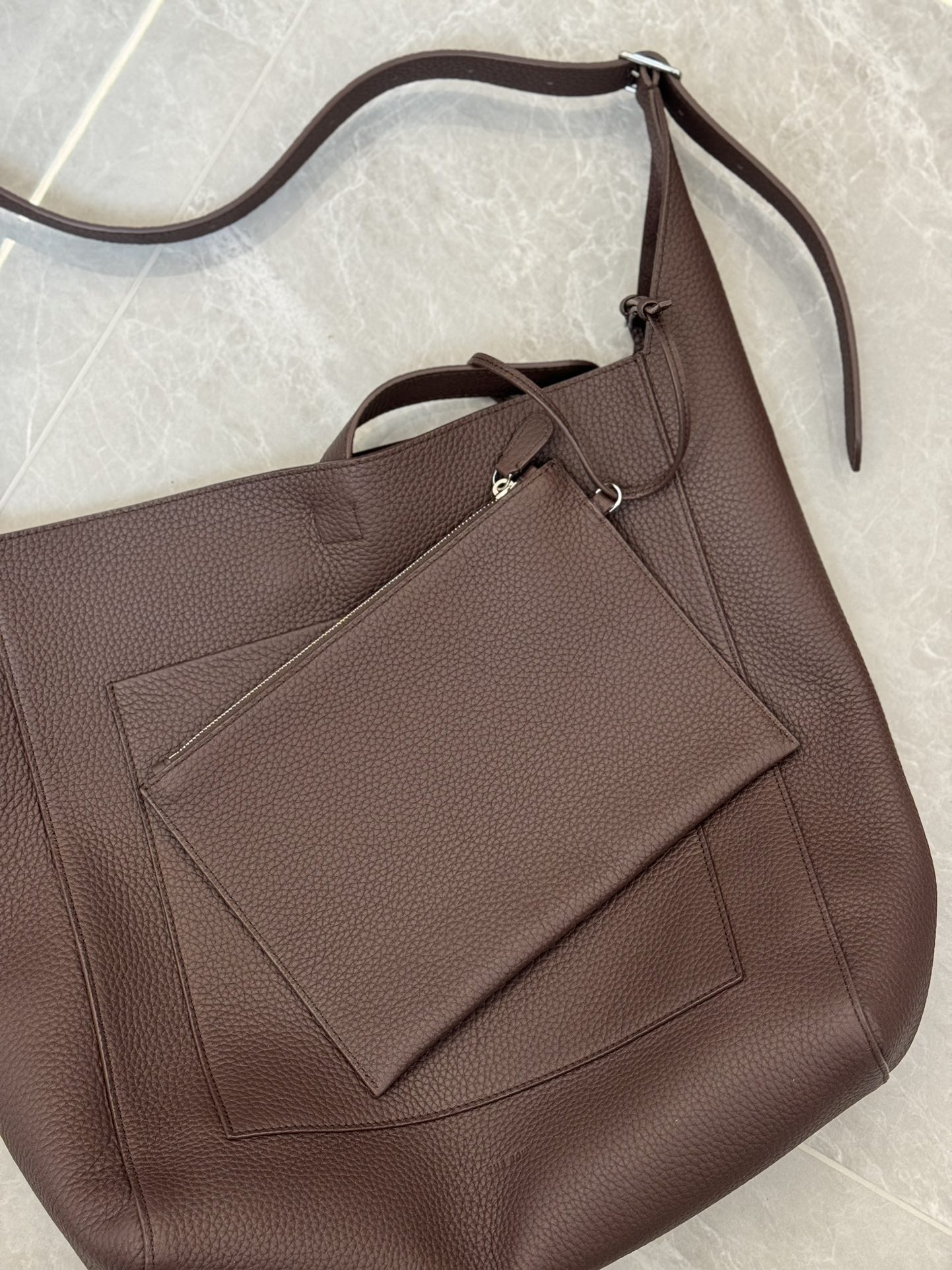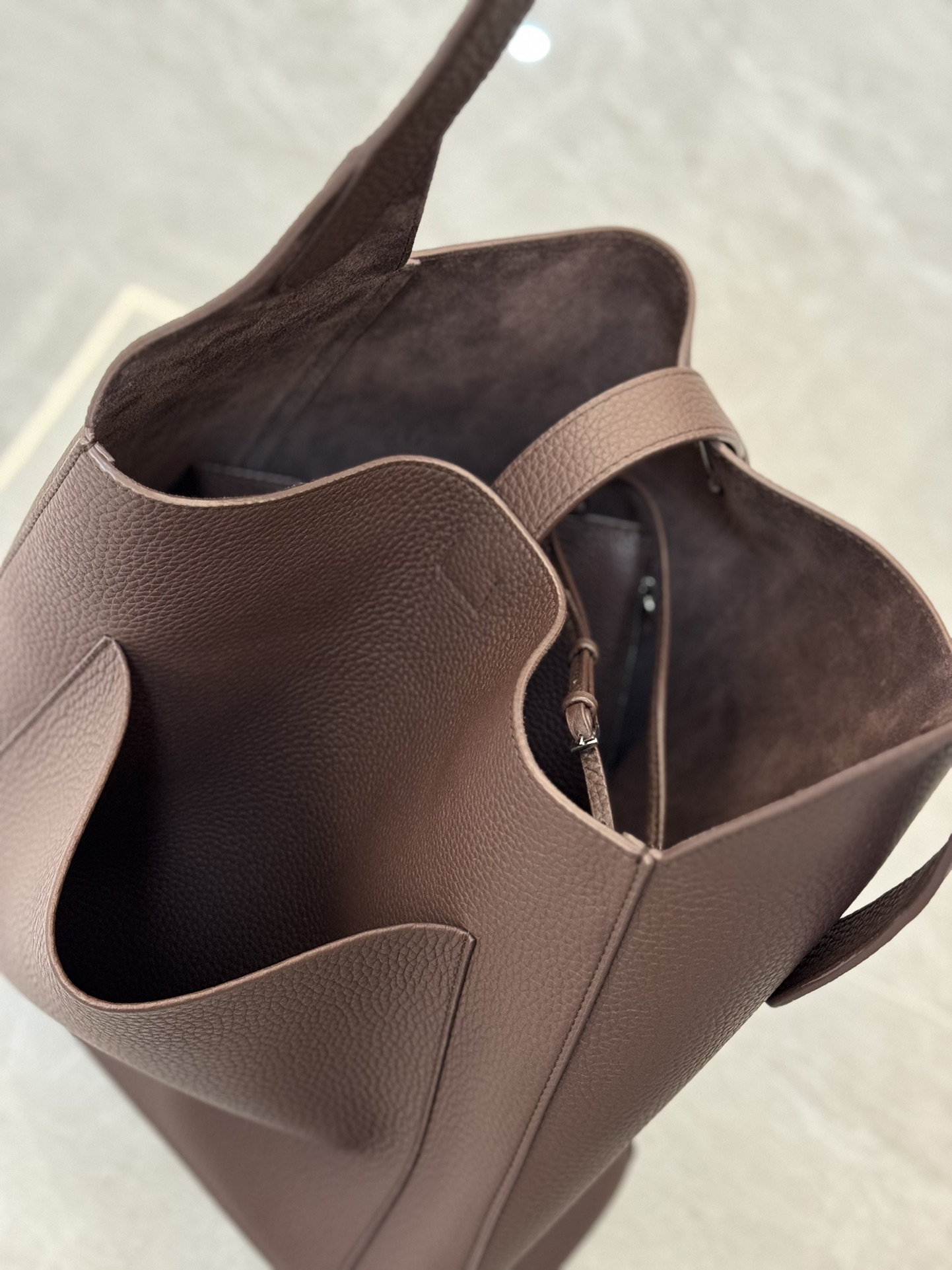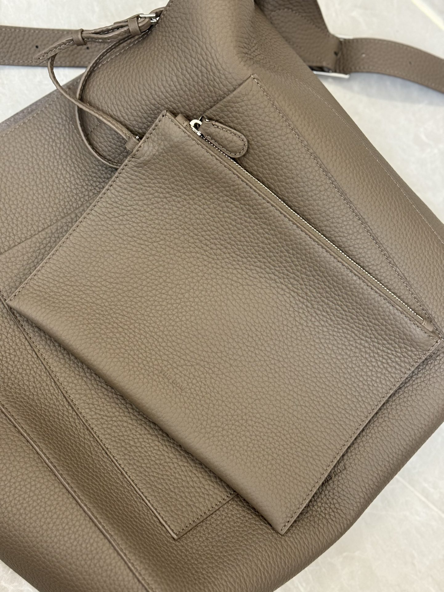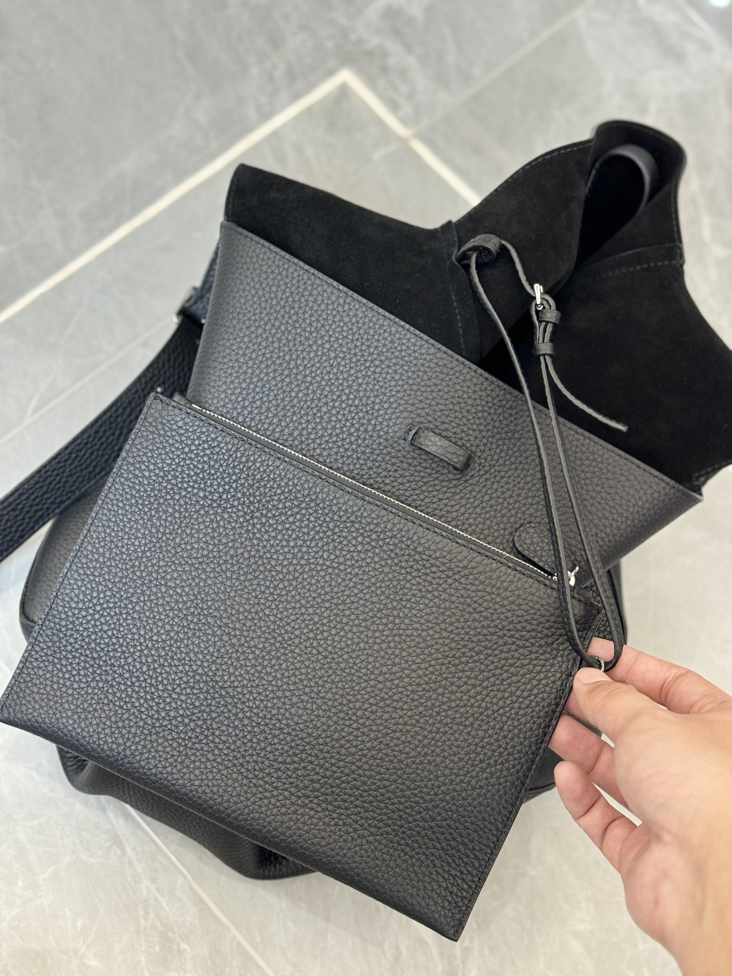 子母袋款式,内里有一个可拆卸的拉链袋,结构简单没有多余的五金点缀,包身是意大利产小牛皮,内里也是反绒和大手提同款皮料