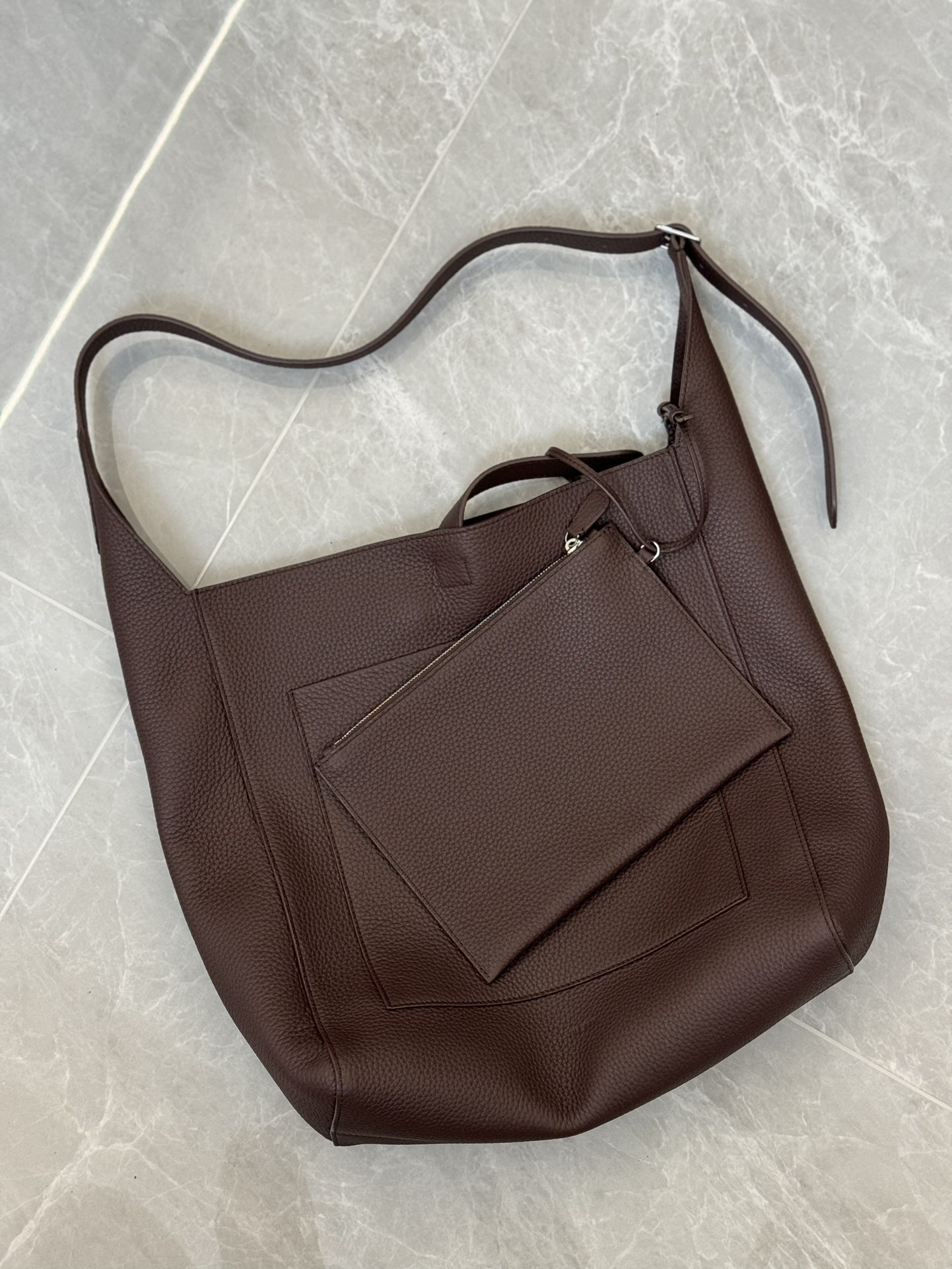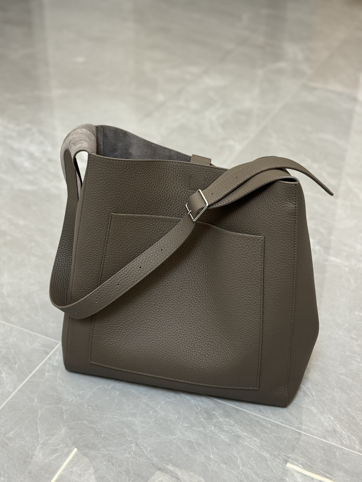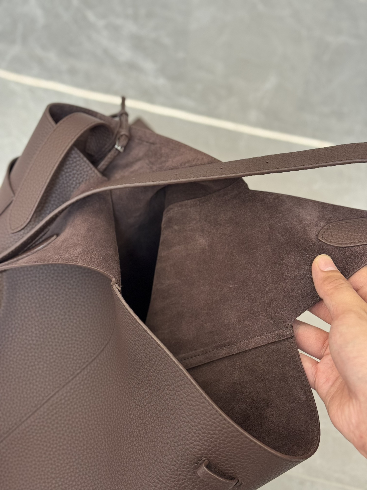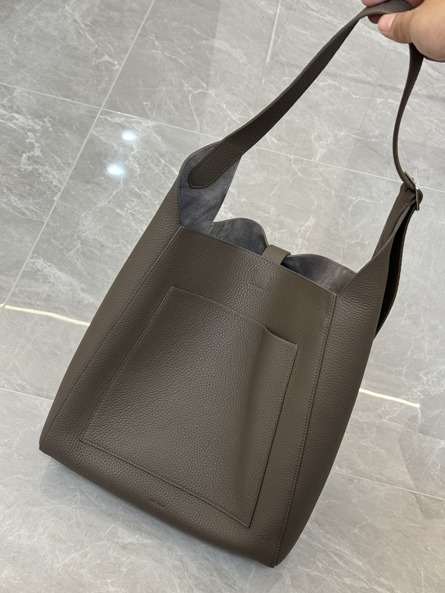 子母袋款式,内里有一个可拆卸的拉链袋,结构简单没有多余的五金点缀,包身是意大利产小牛皮,内里也是反绒和大手提同款皮料