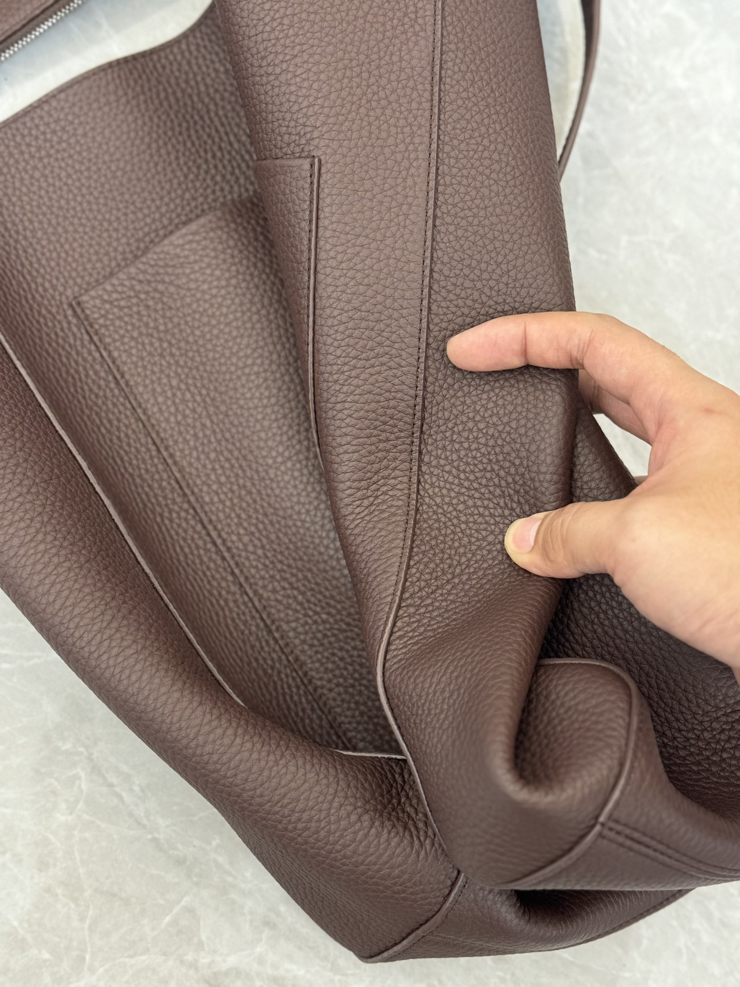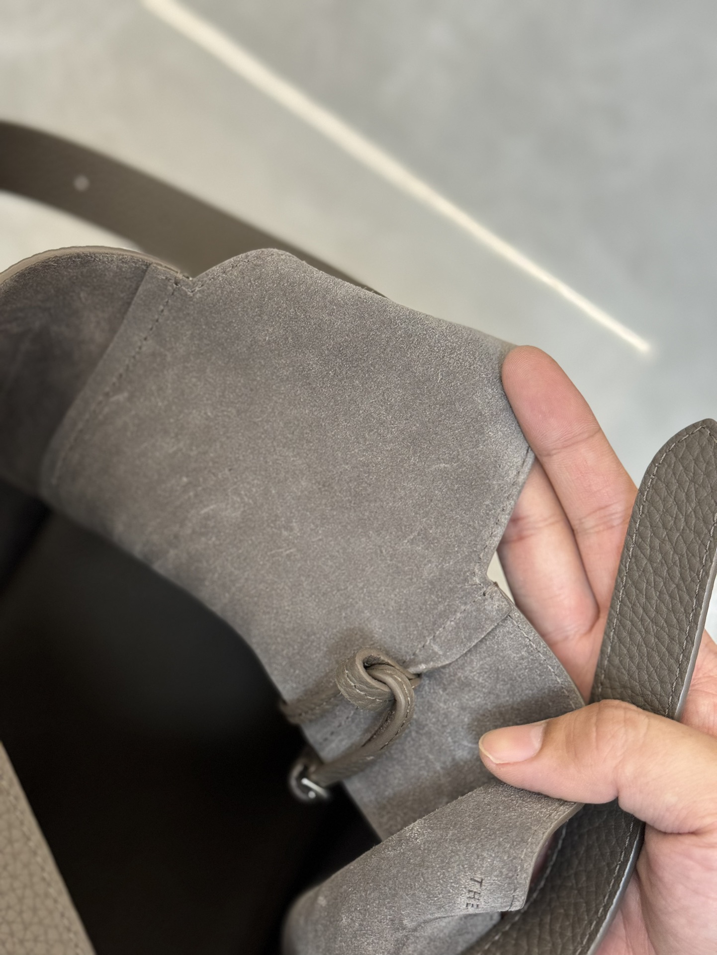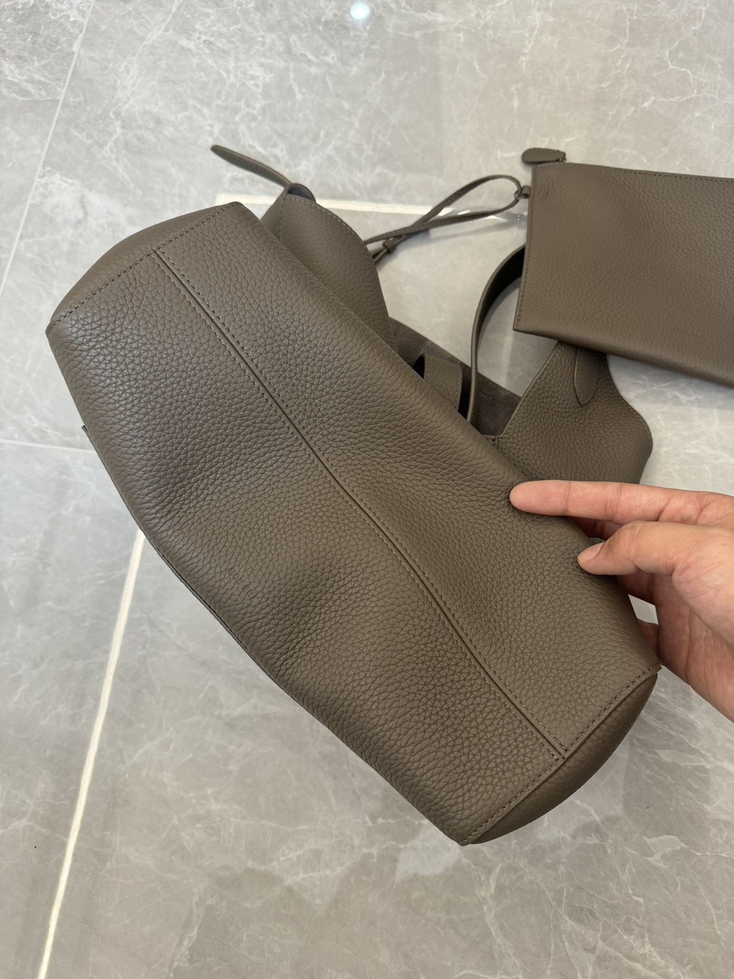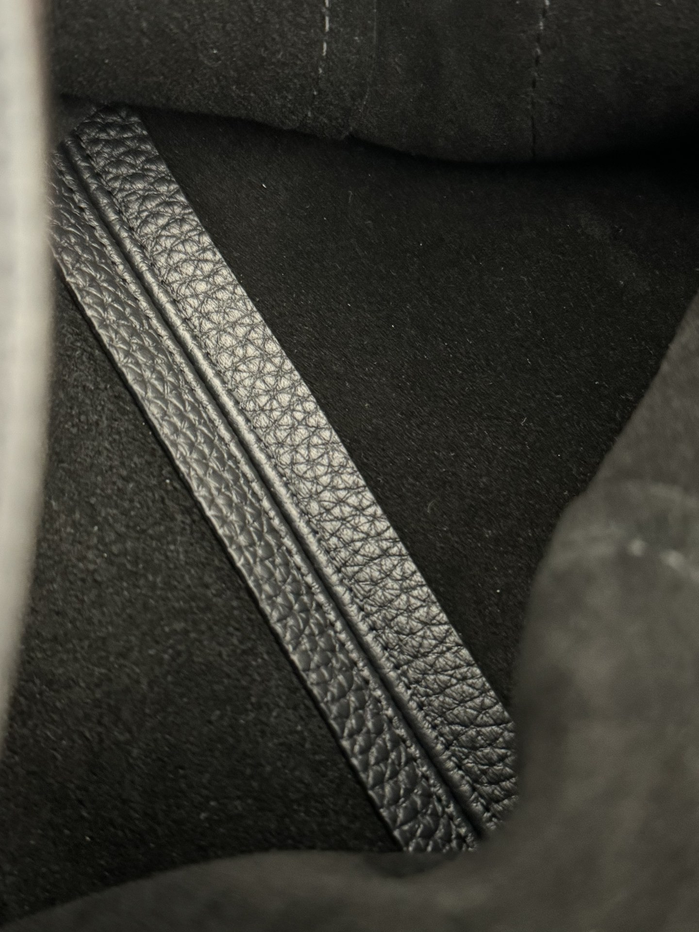 子母袋款式,内里有一个可拆卸的拉链袋,结构简单没有多余的五金点缀,包身是意大利产小牛皮,内里也是反绒和大手提同款皮料