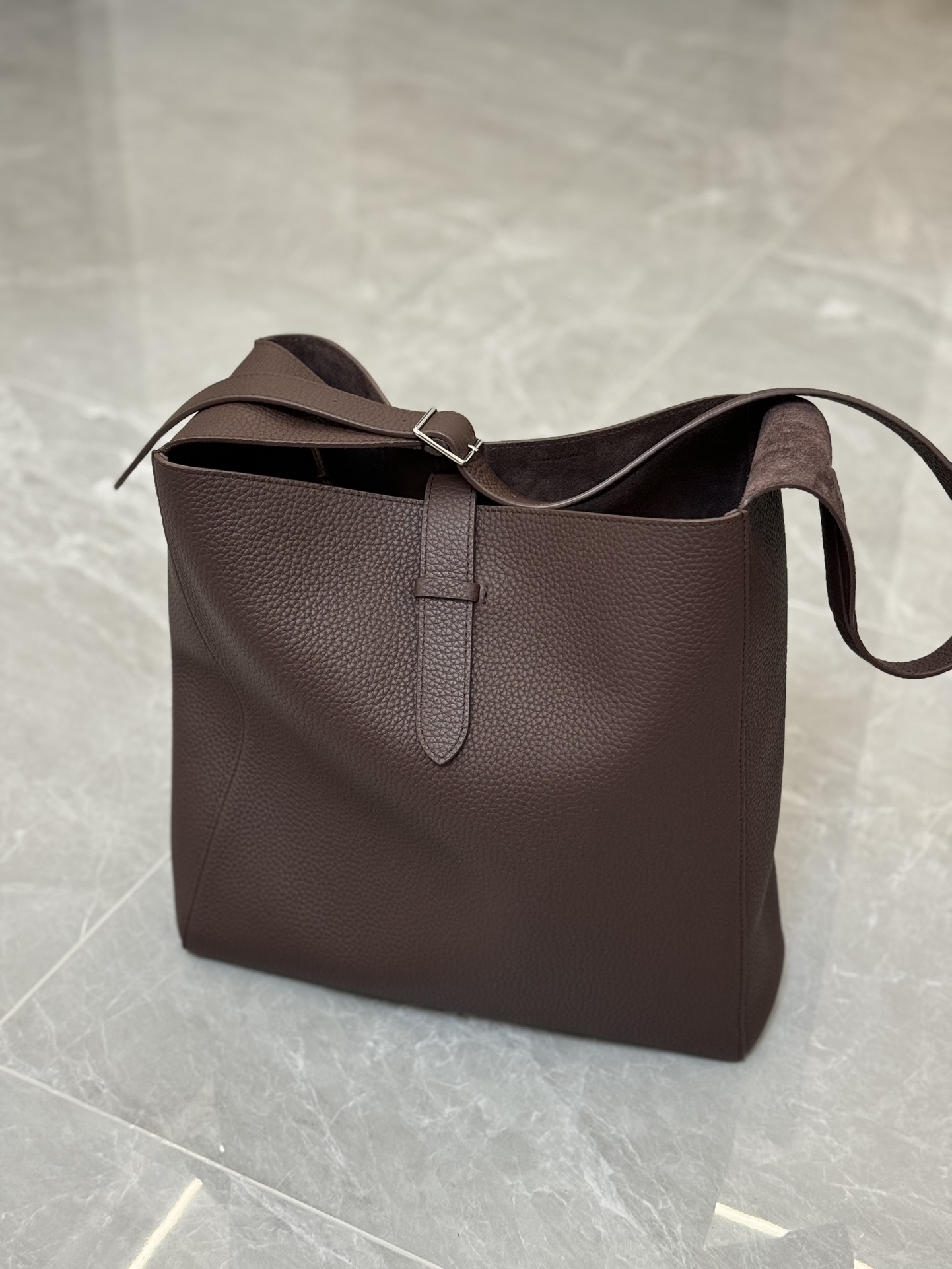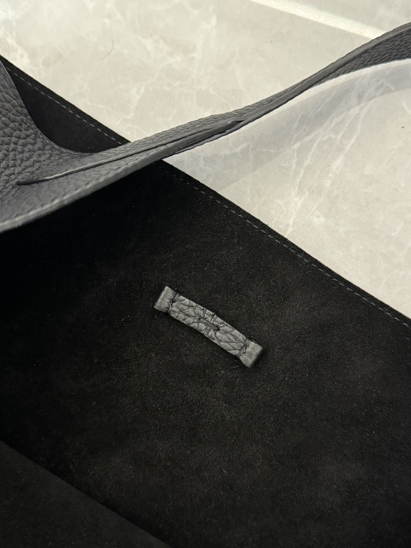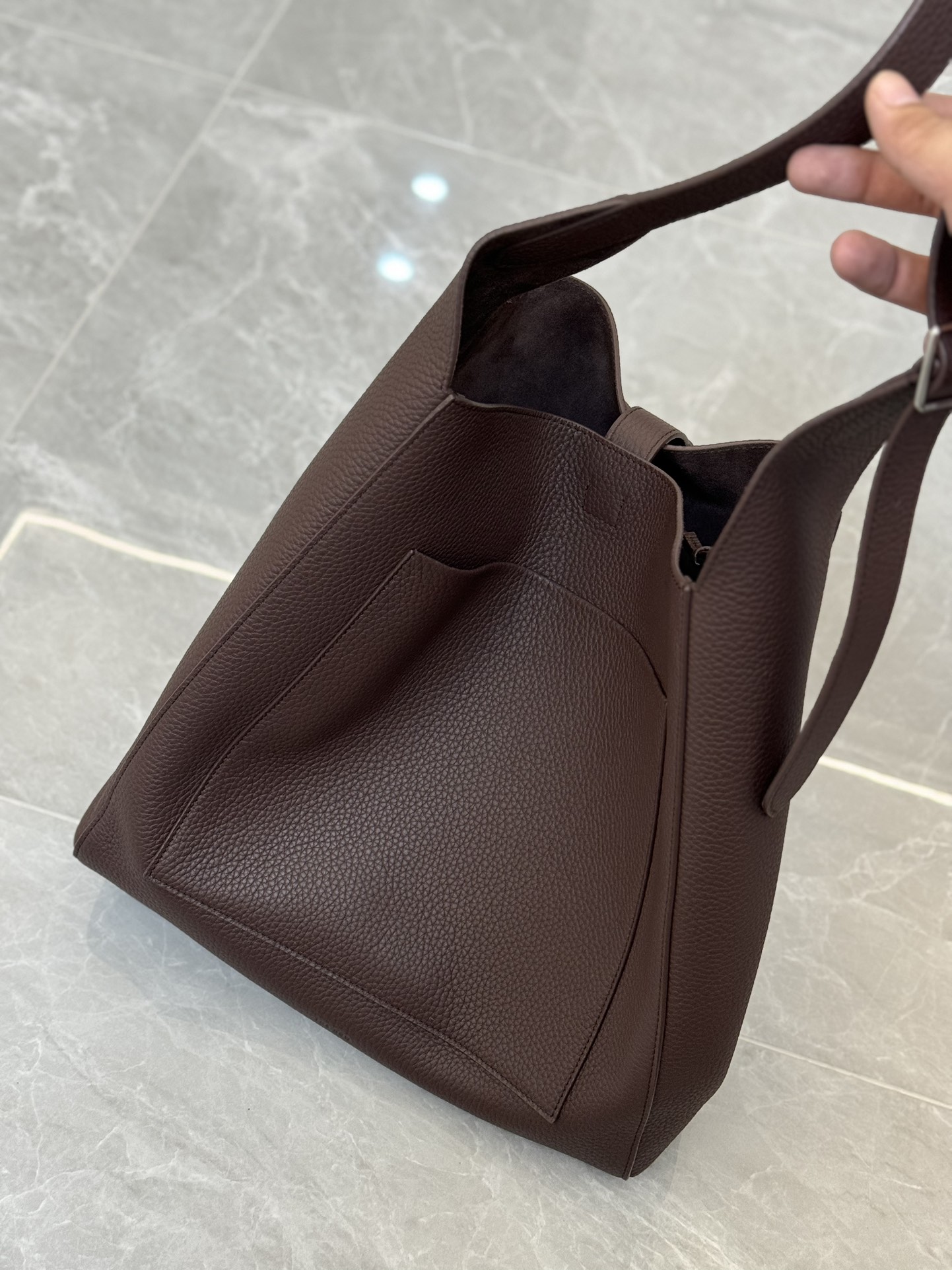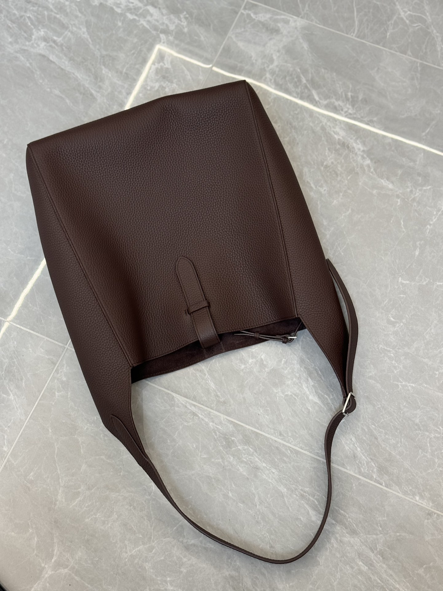 子母袋款式,内里有一个可拆卸的拉链袋,结构简单没有多余的五金点缀,包身是意大利产小牛皮,内里也是反绒和大手提同款皮料