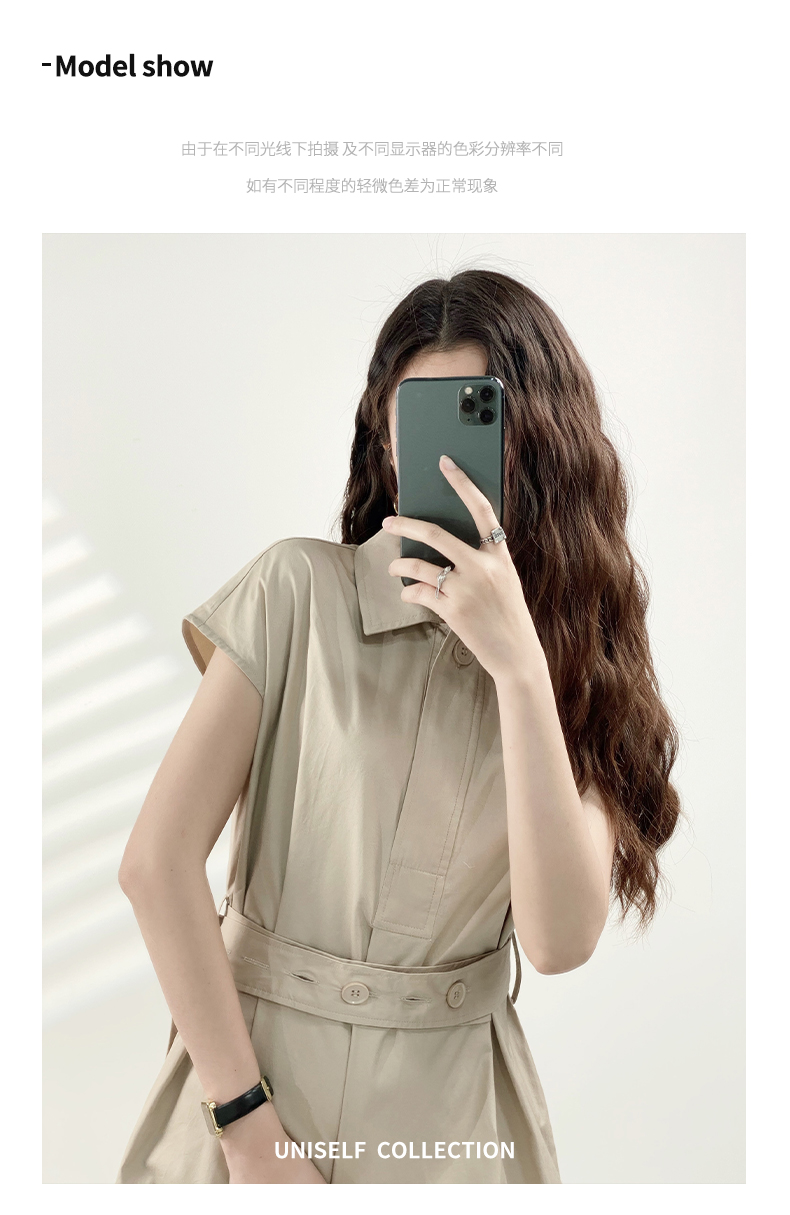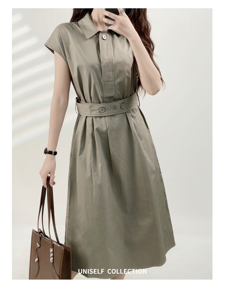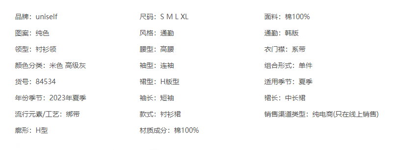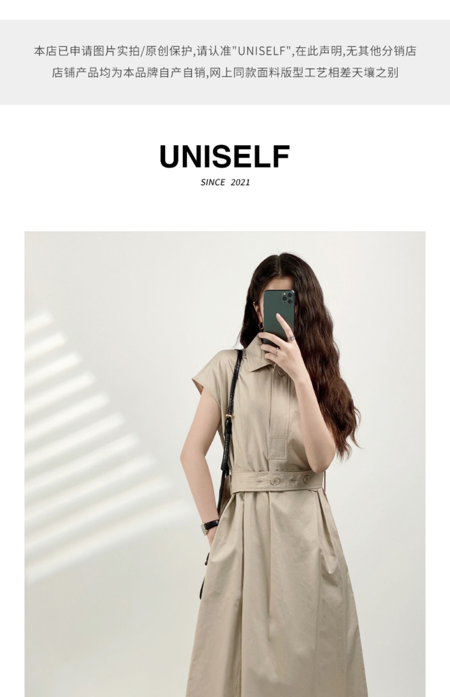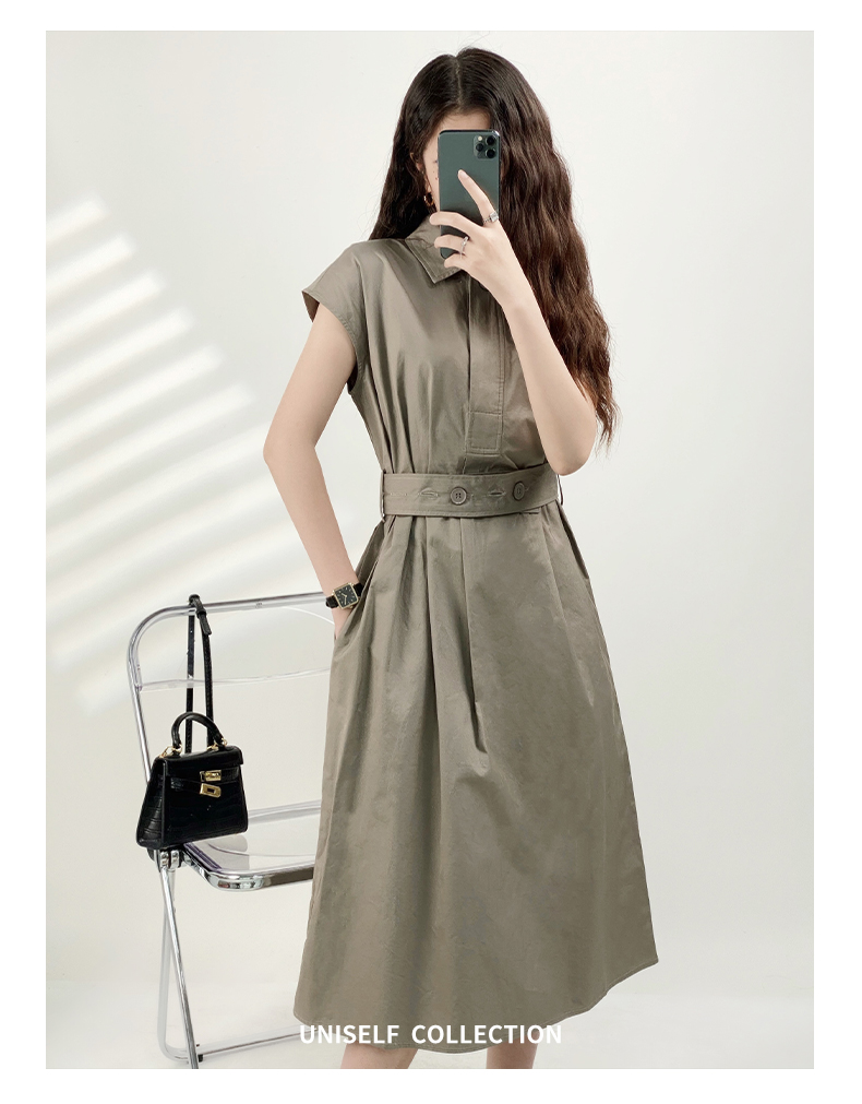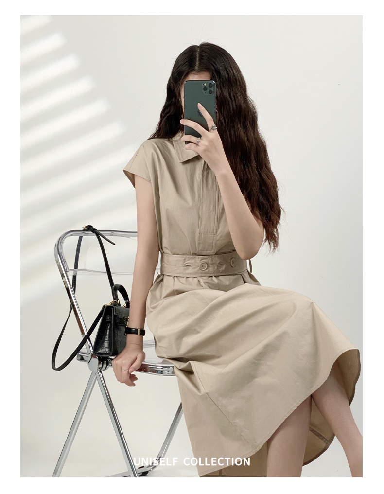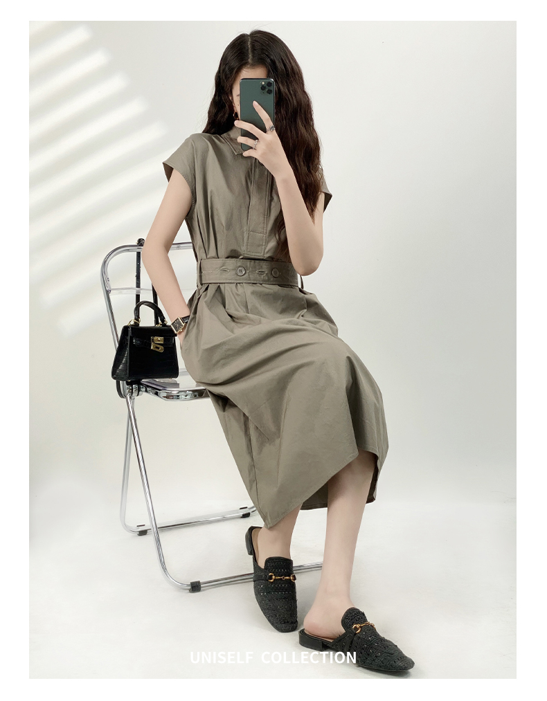 YX【现货7天】简约通勤气质衬衫连衣裙女2023夏季新款韩版设计感系带收腰中长裙