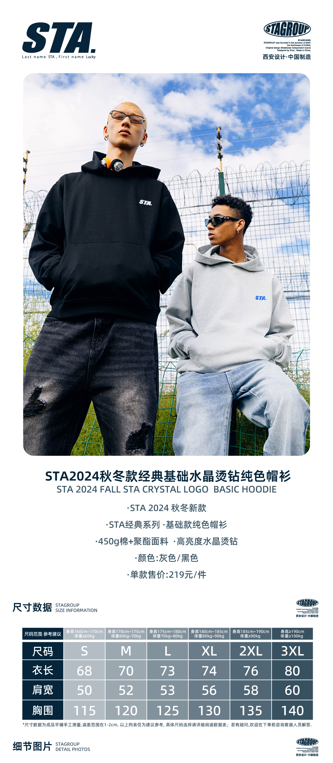 STA2024秋冬款经典基础水晶烫钻纯色帽衫