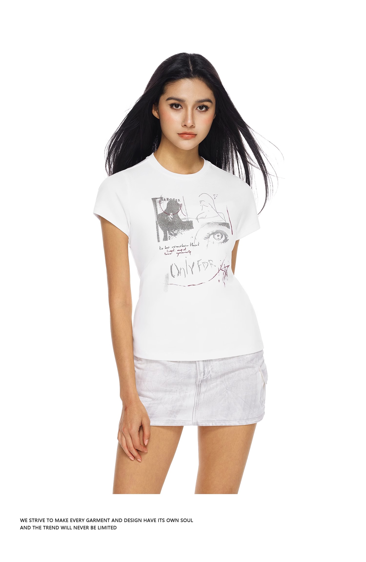 FDR官方店 抽象印花正肩辣妹短袖t恤女夏季修身显瘦上衣