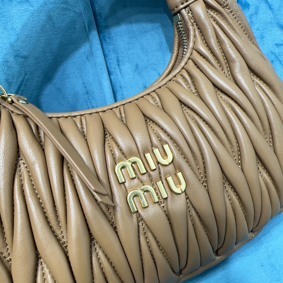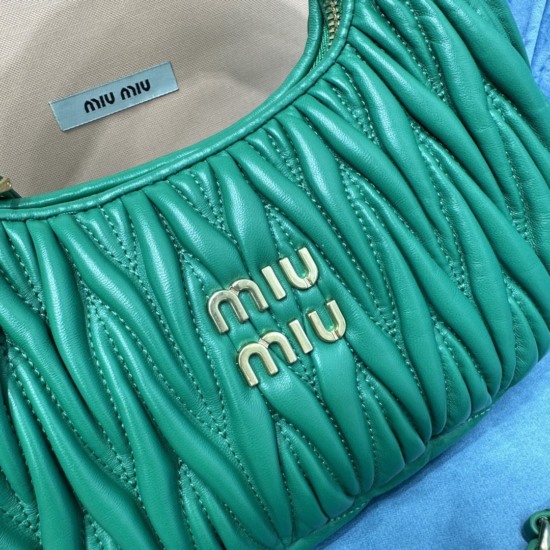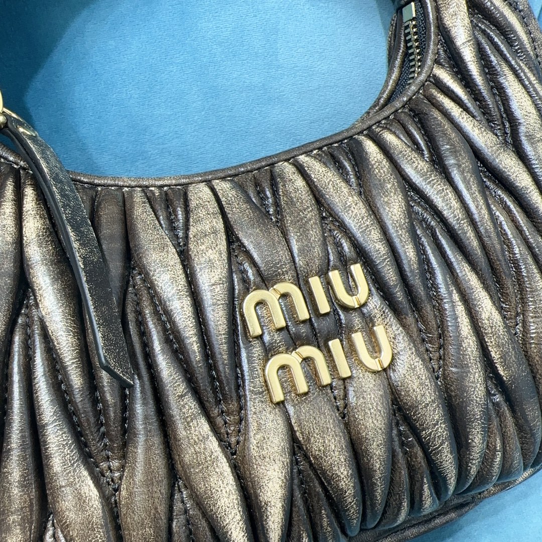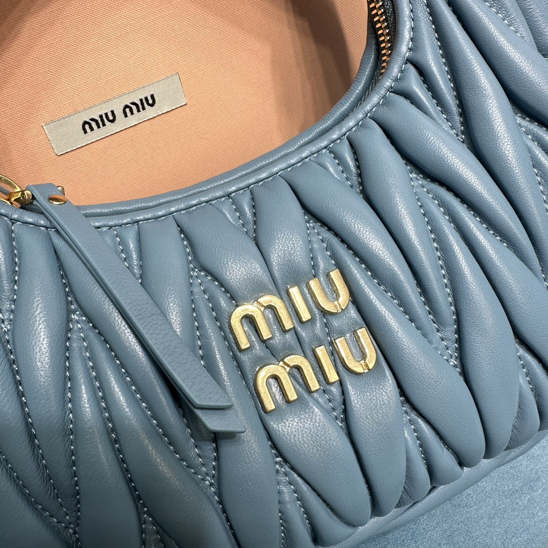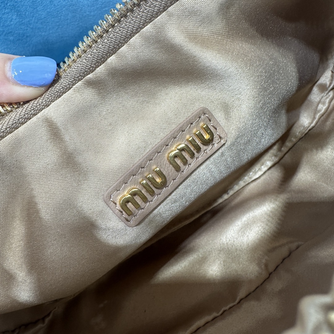 MiuMiu新品MiuWander手袋,采用进口小羊皮经典品牌标志性Matelasse纹理绣花,复古磨砂五金,利用圆孤的曲线,