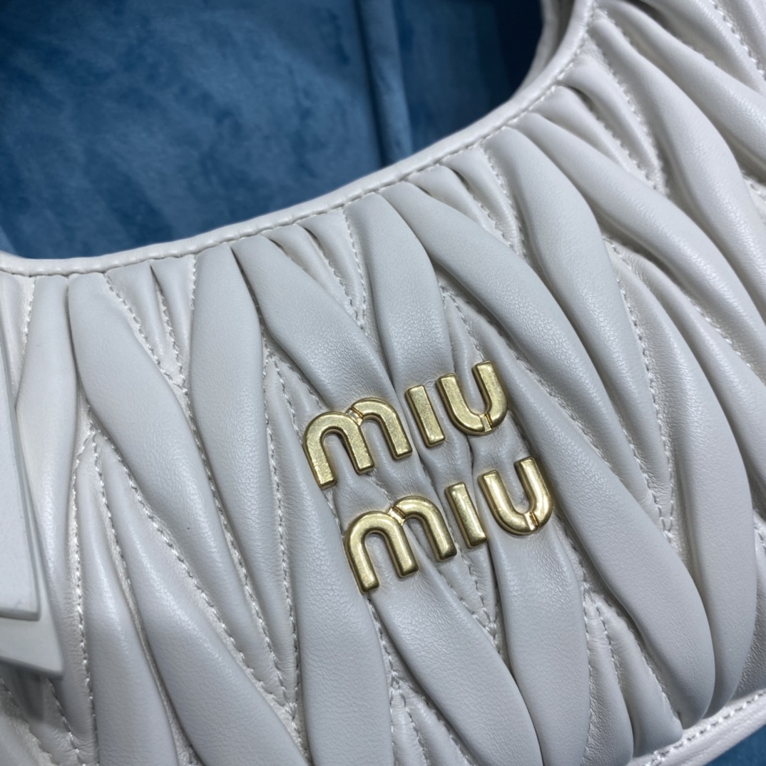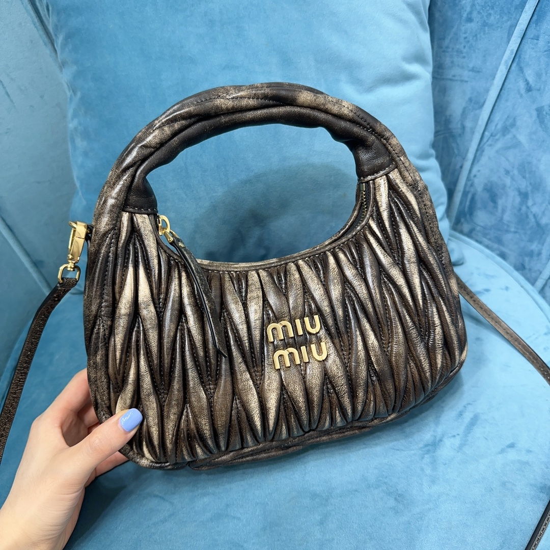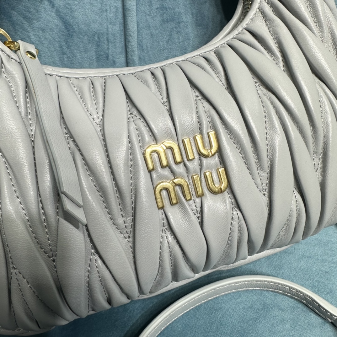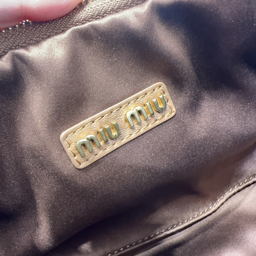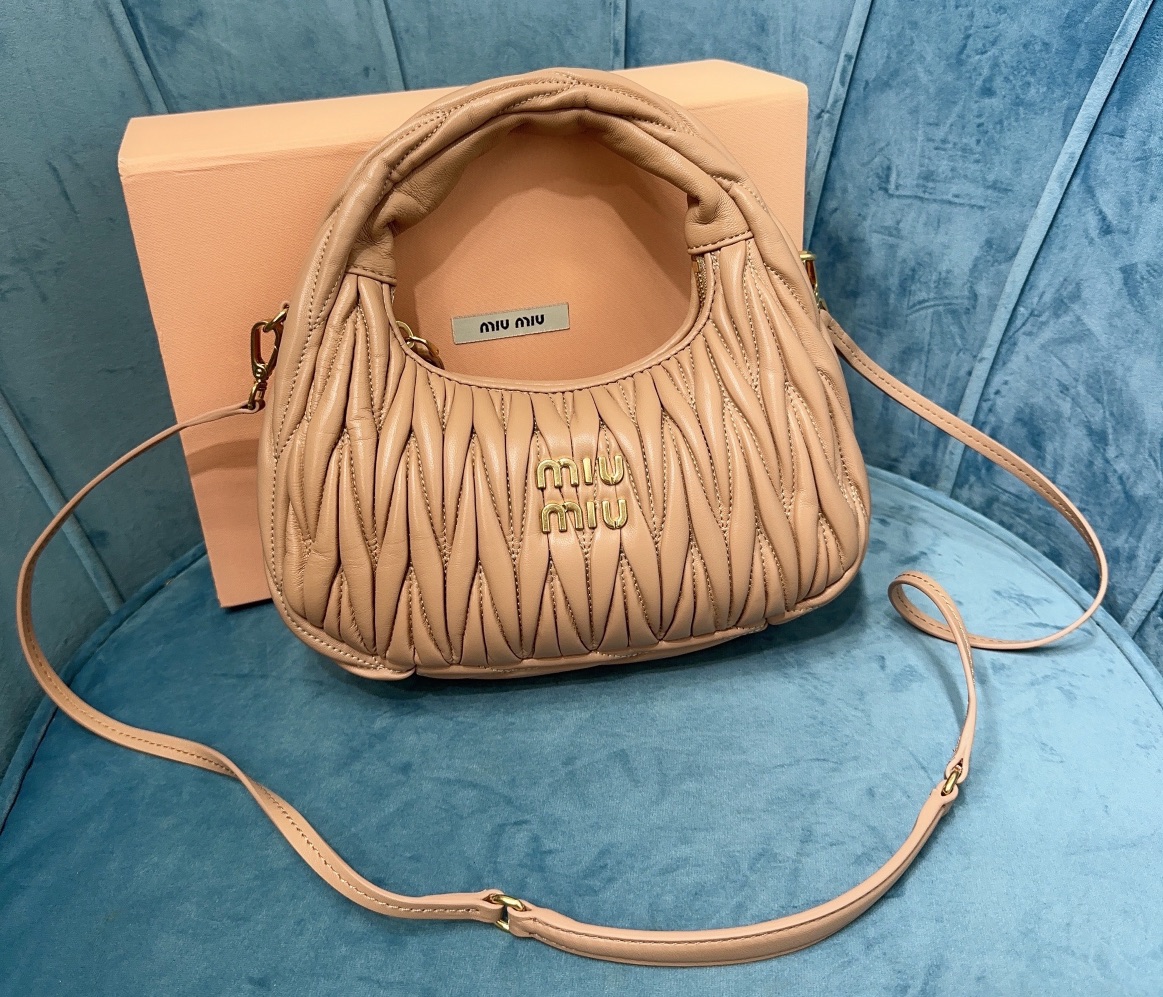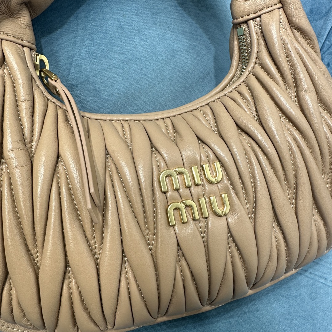MiuMiu新品MiuWander手袋,采用进口小羊皮经典品牌标志性Matelasse纹理绣花,复古磨砂五金,利用圆孤的曲线,