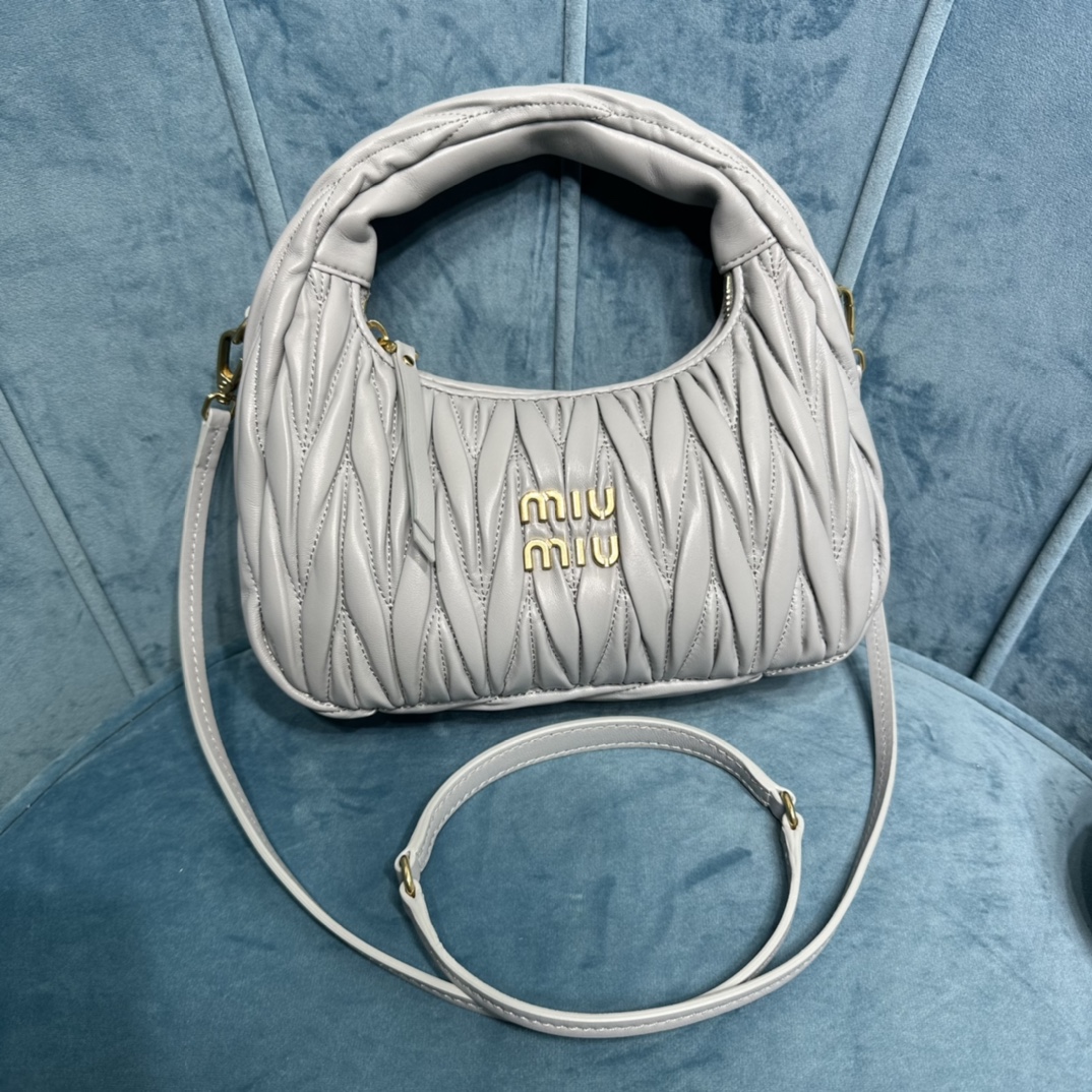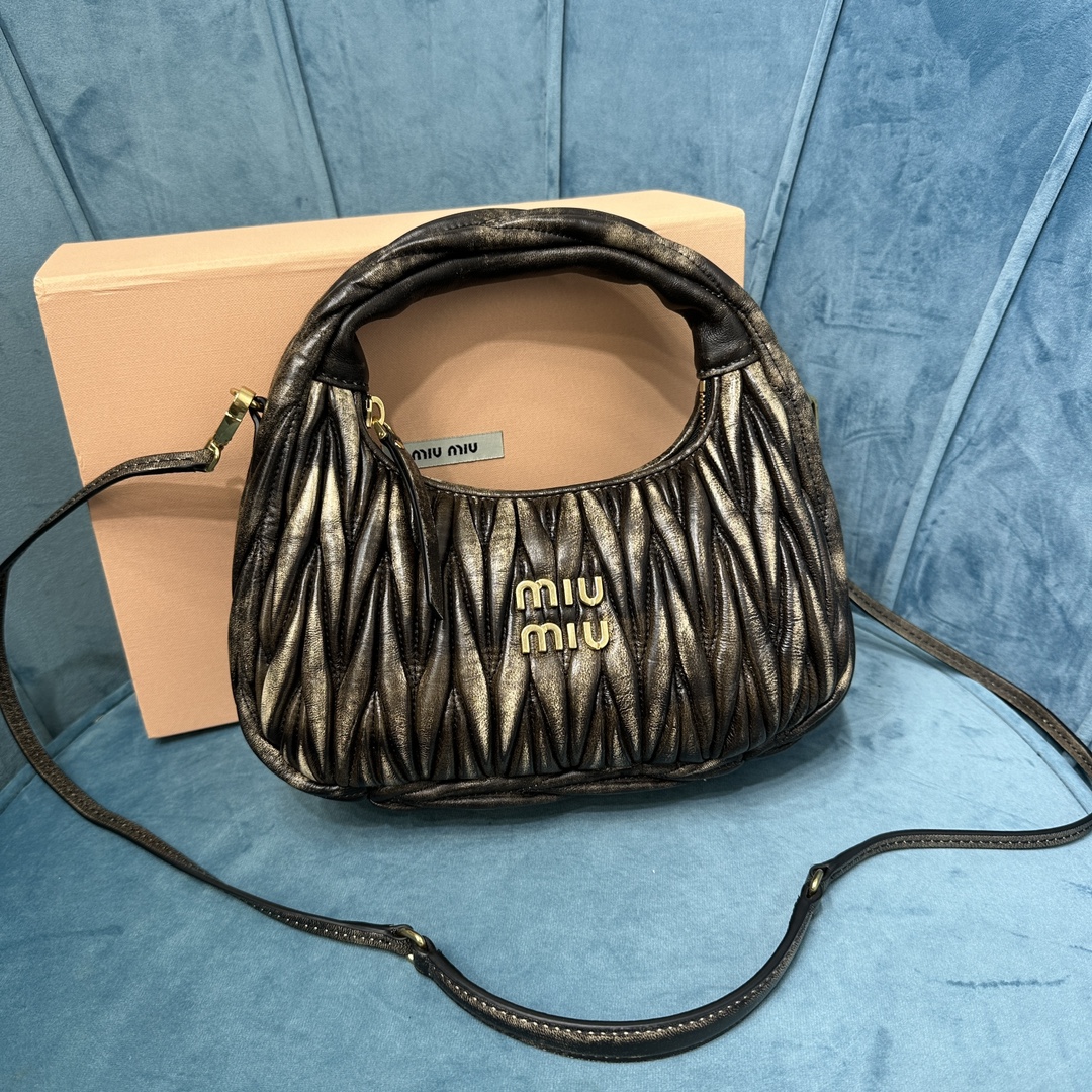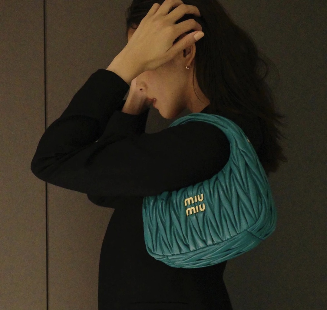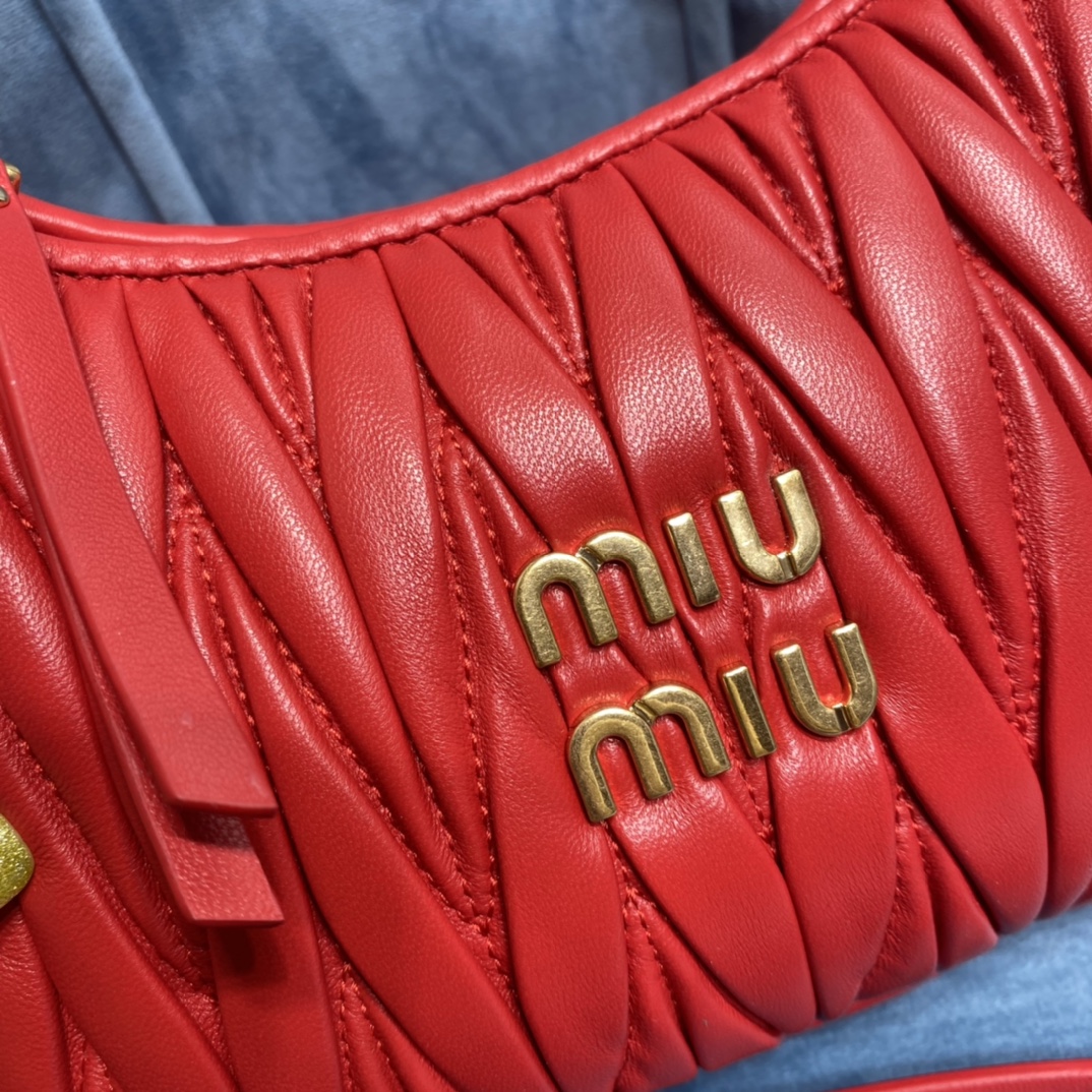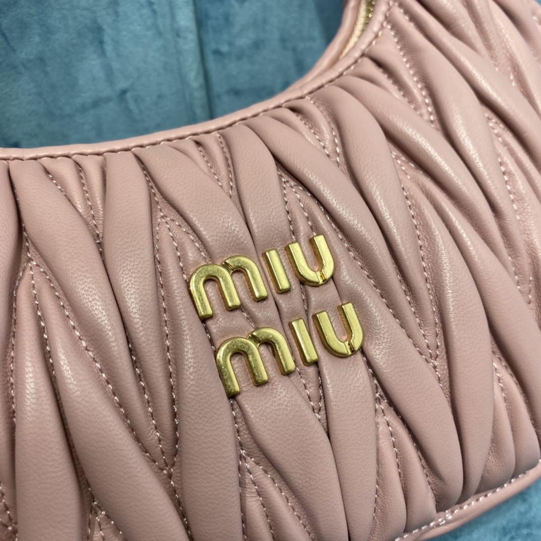 MiuMiu新品MiuWander手袋,采用进口小羊皮经典品牌标志性Matelasse纹理绣花,复古磨砂五金,利用圆孤的曲线,