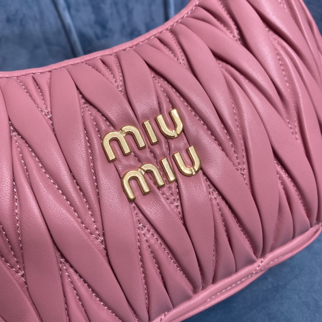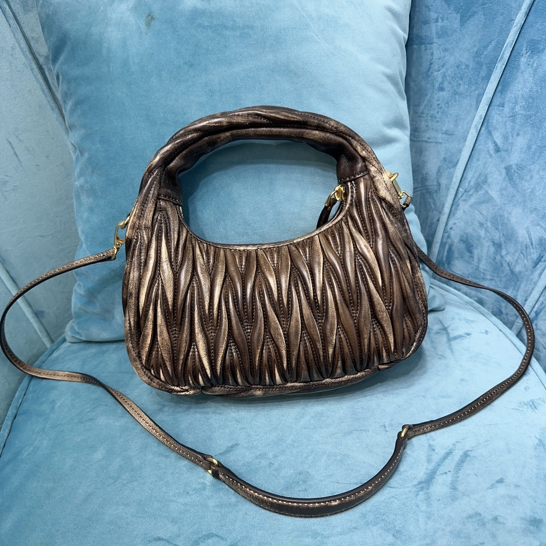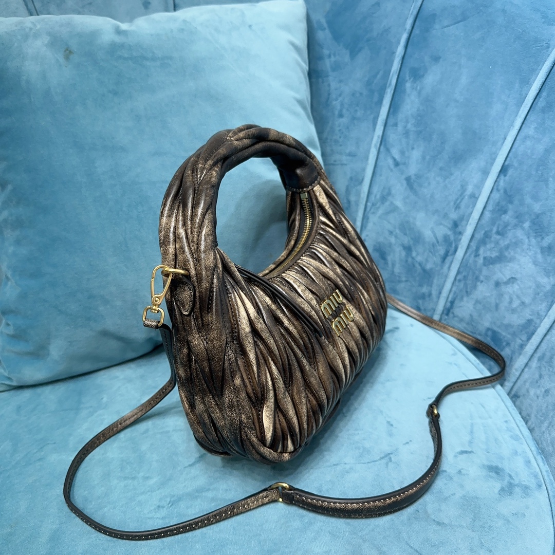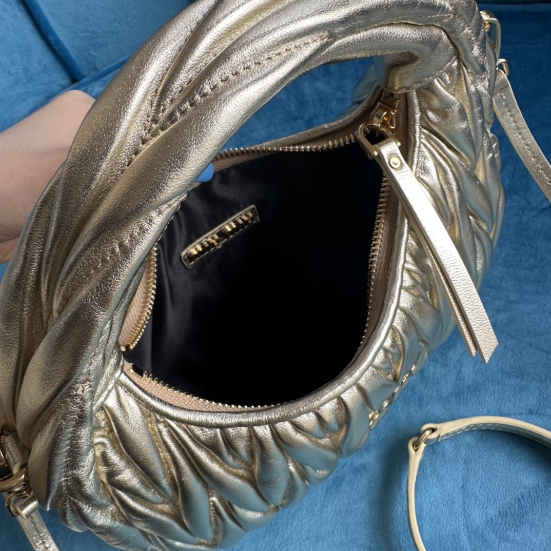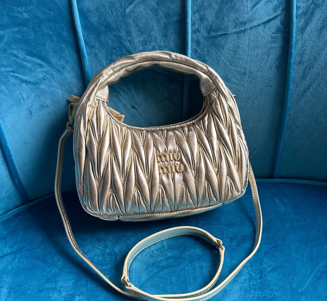 MiuMiu新品MiuWander手袋,采用进口小羊皮经典品牌标志性Matelasse纹理绣花,复古磨砂五金,利用圆孤的曲线,