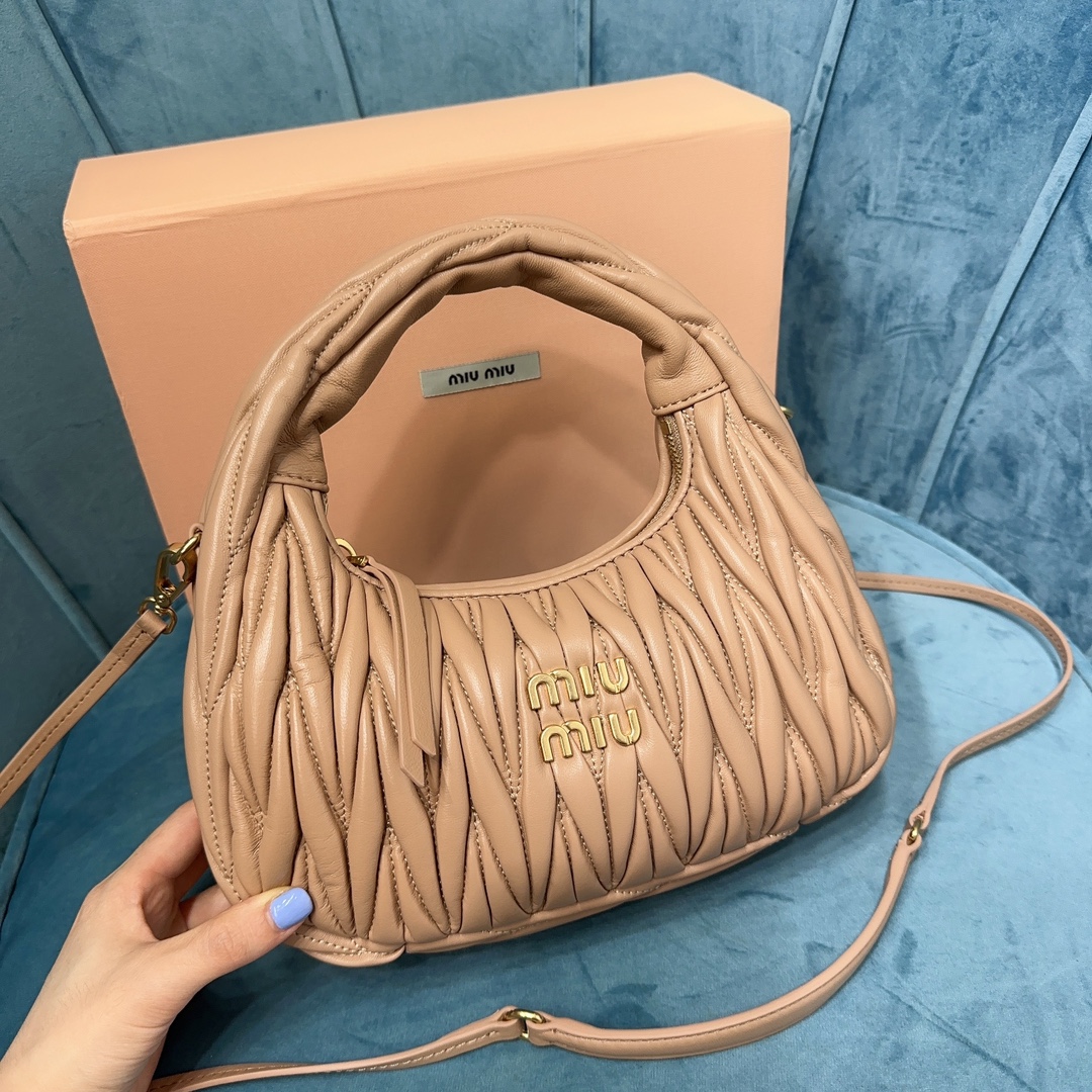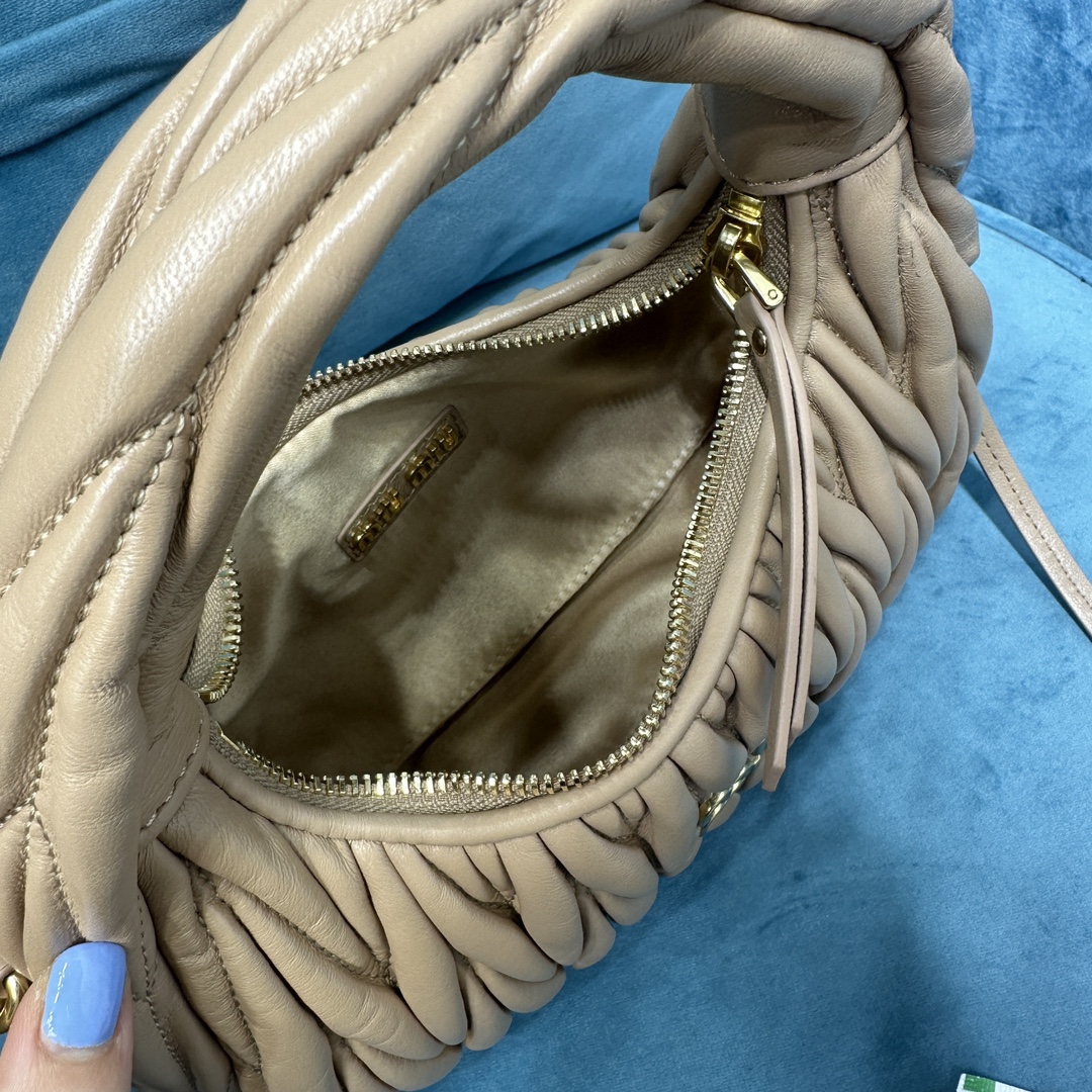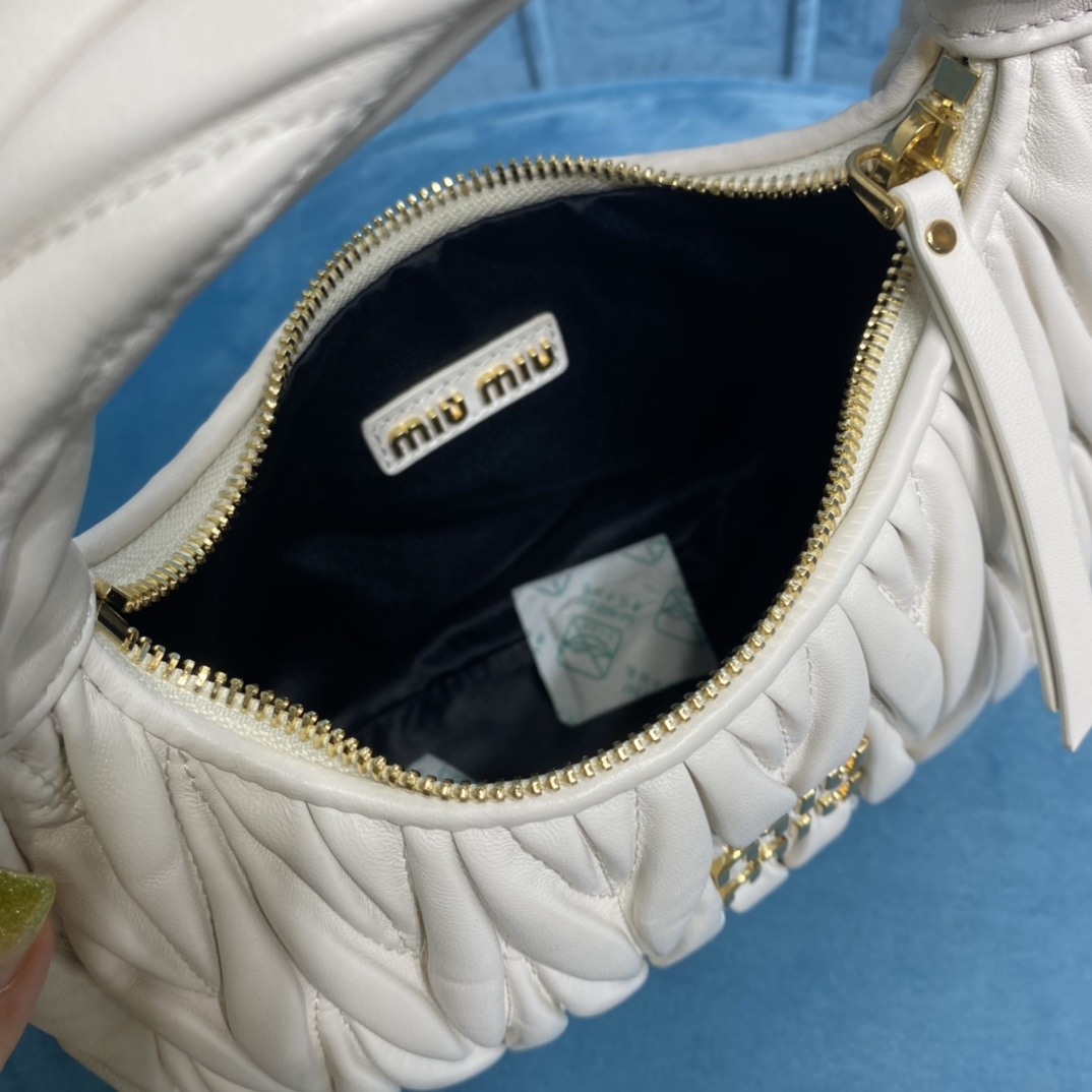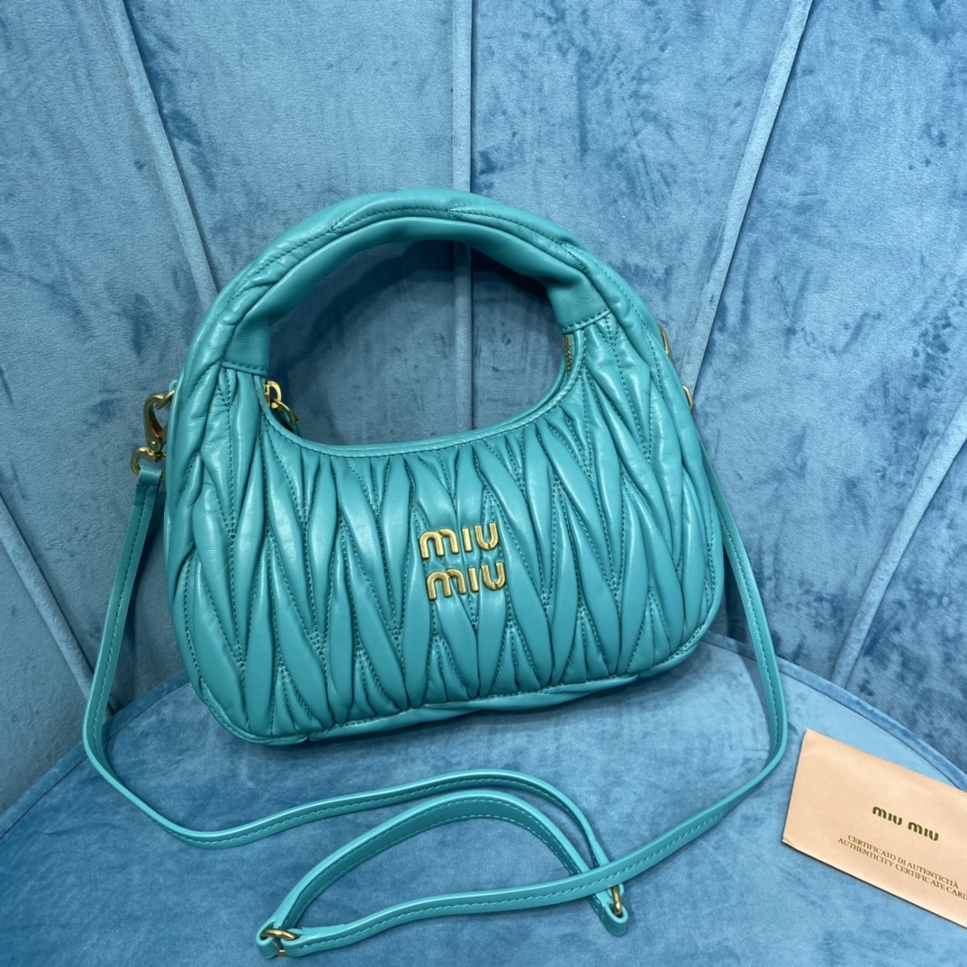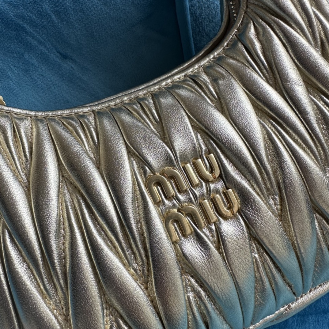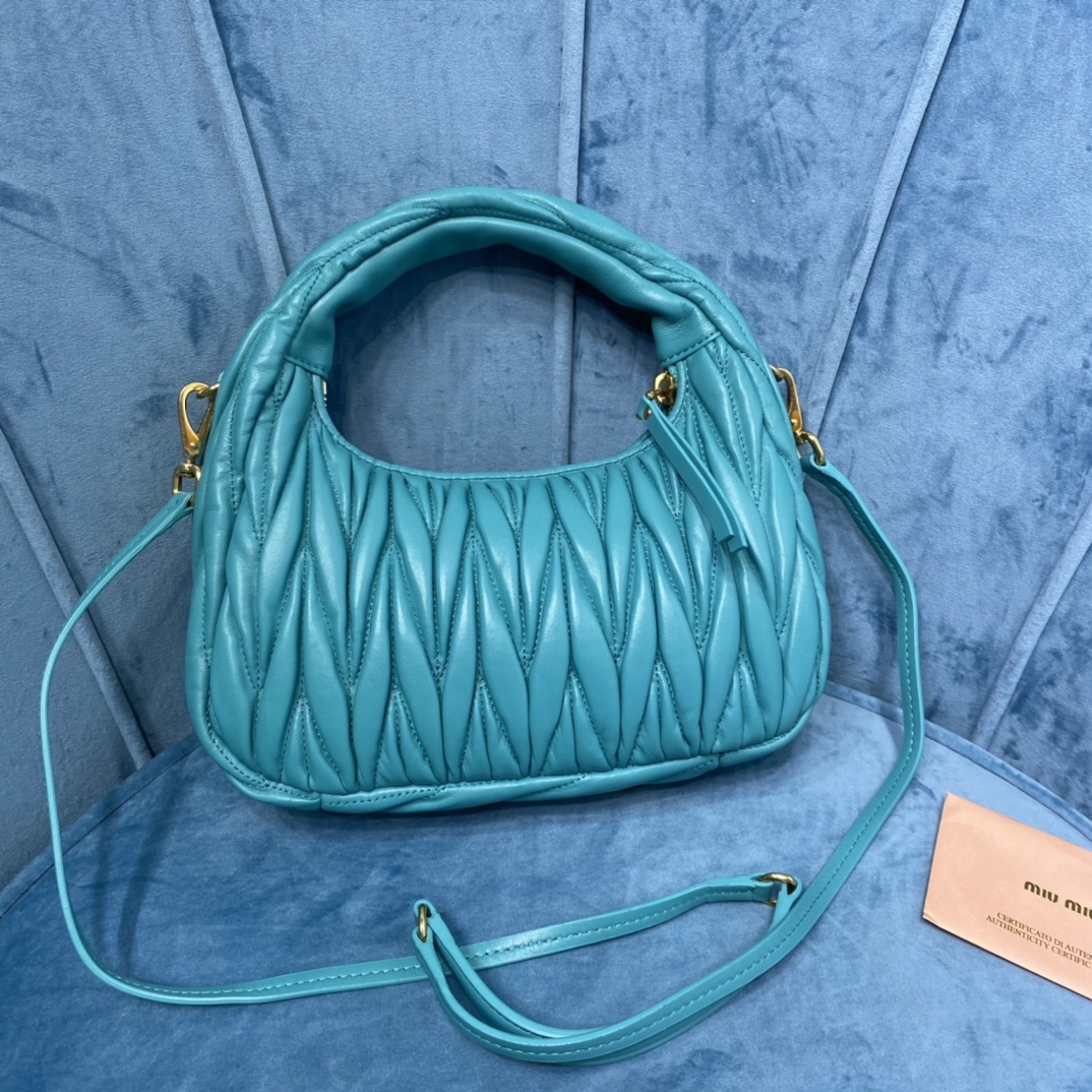 MiuMiu新品MiuWander手袋,采用进口小羊皮经典品牌标志性Matelasse纹理绣花,复古磨砂五金,利用圆孤的曲线,